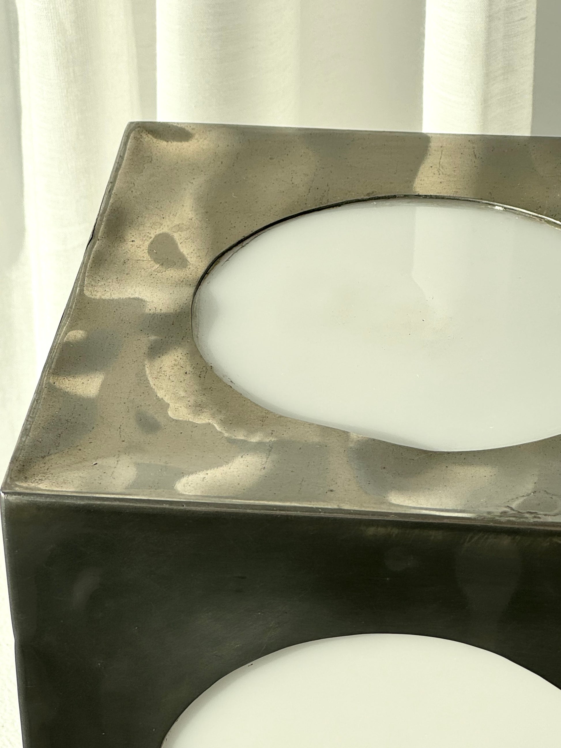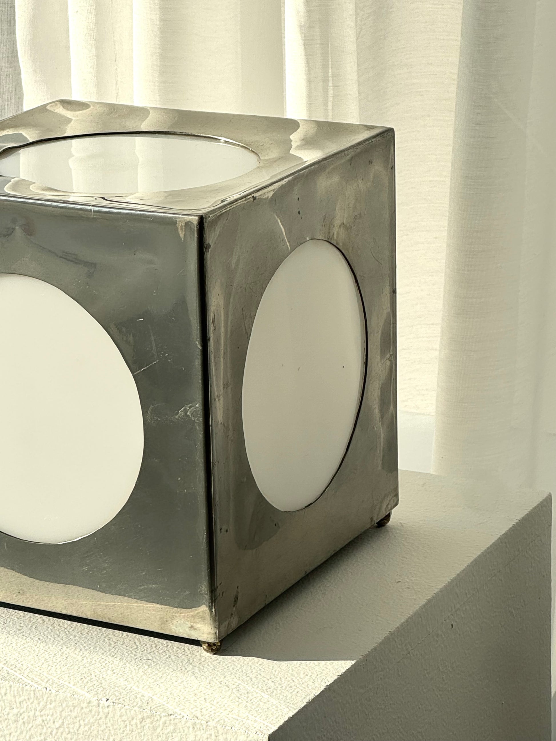 Super cool vintage lamp in authentic Space Age style! Made in Italy with distinctive round cut-outs and small feet that give it a unique look. The lamp shows signs of age and use, which only adds to its character and charm. Perfect as a statement piece in both modern and retro interiors.