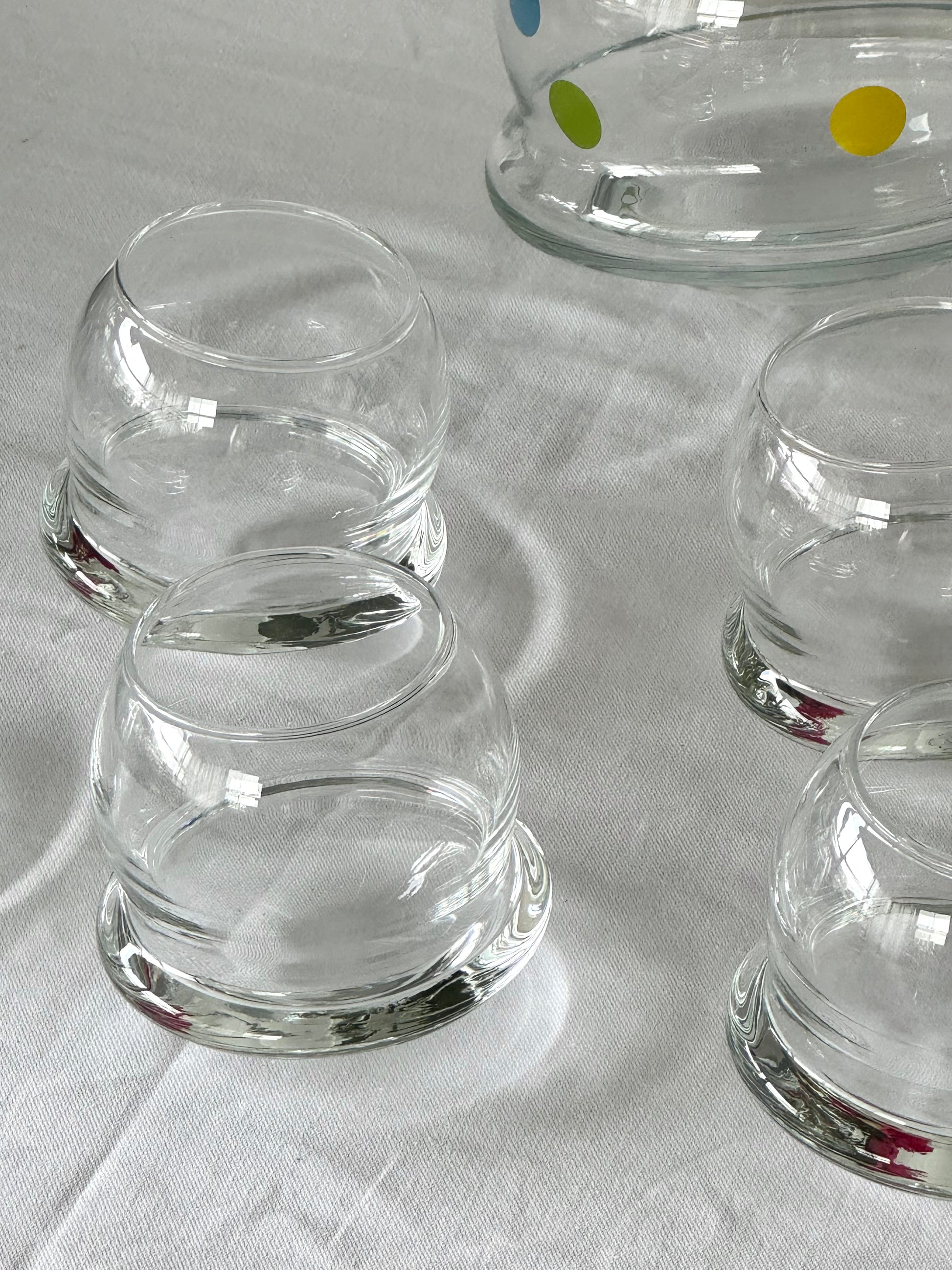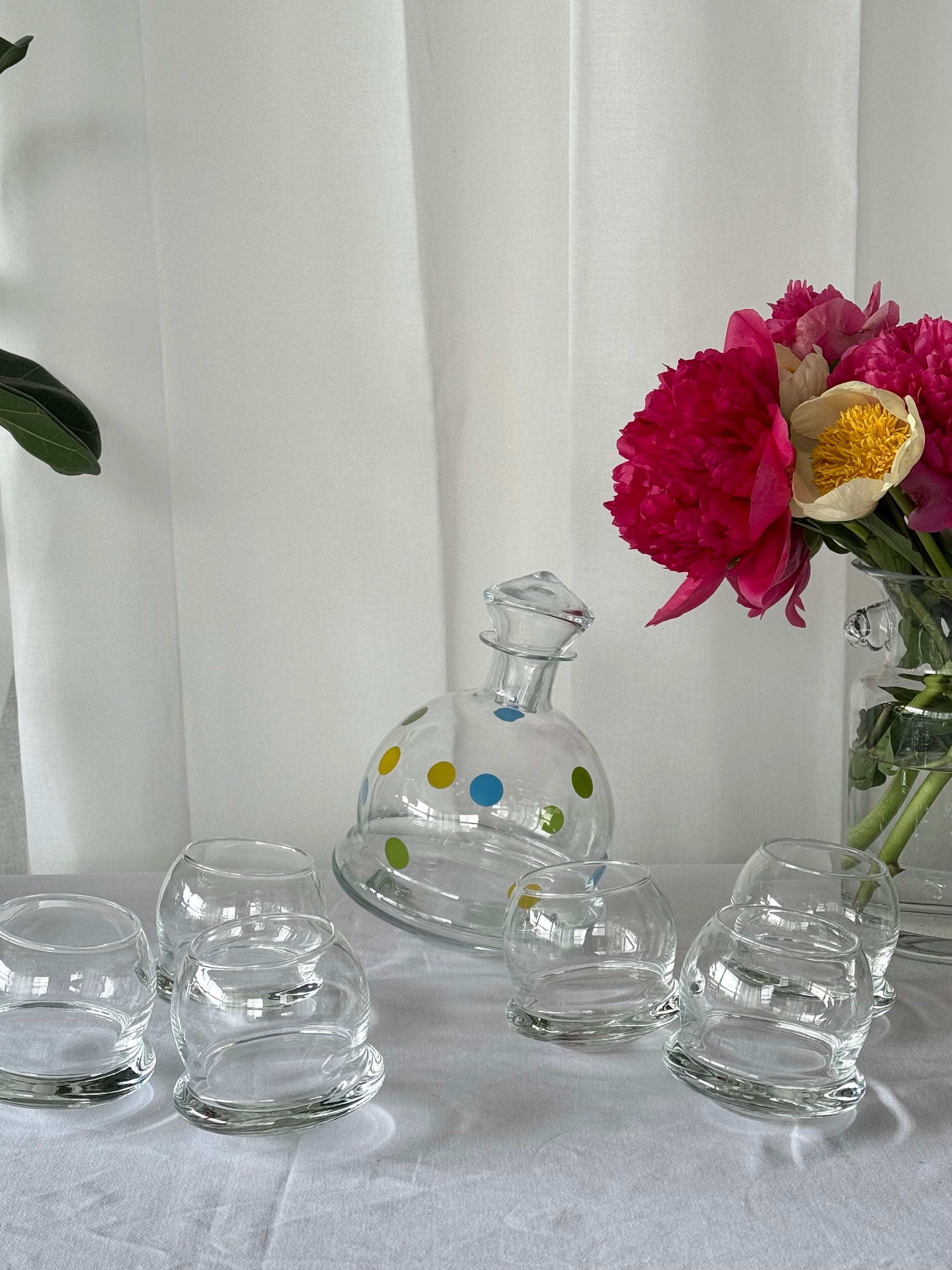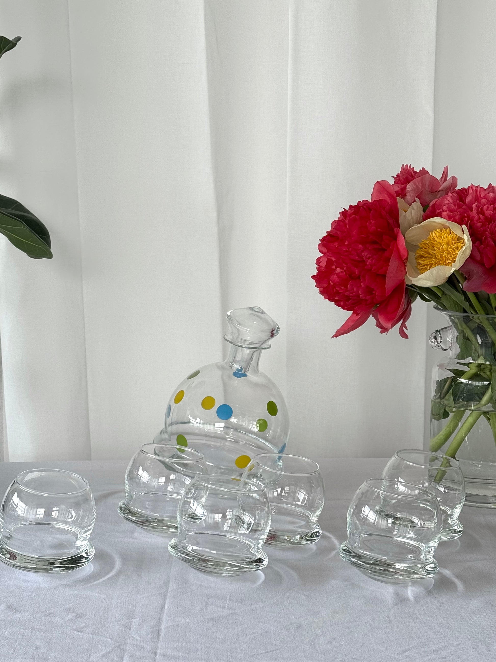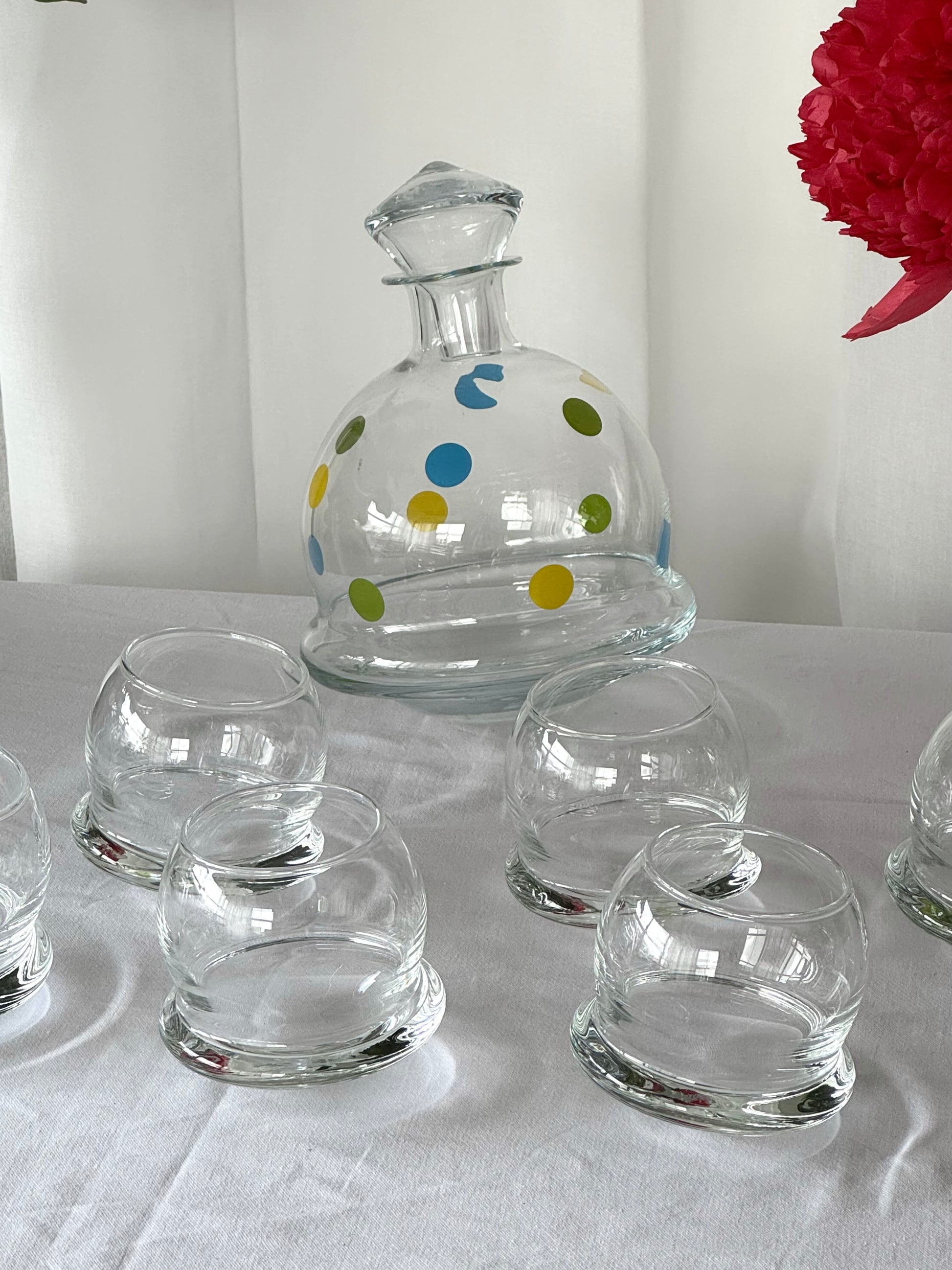 Cute decanter and 6 glasses. All handmade with rounded bottoms that makes Them wiggle. Very nice condition. Sold together