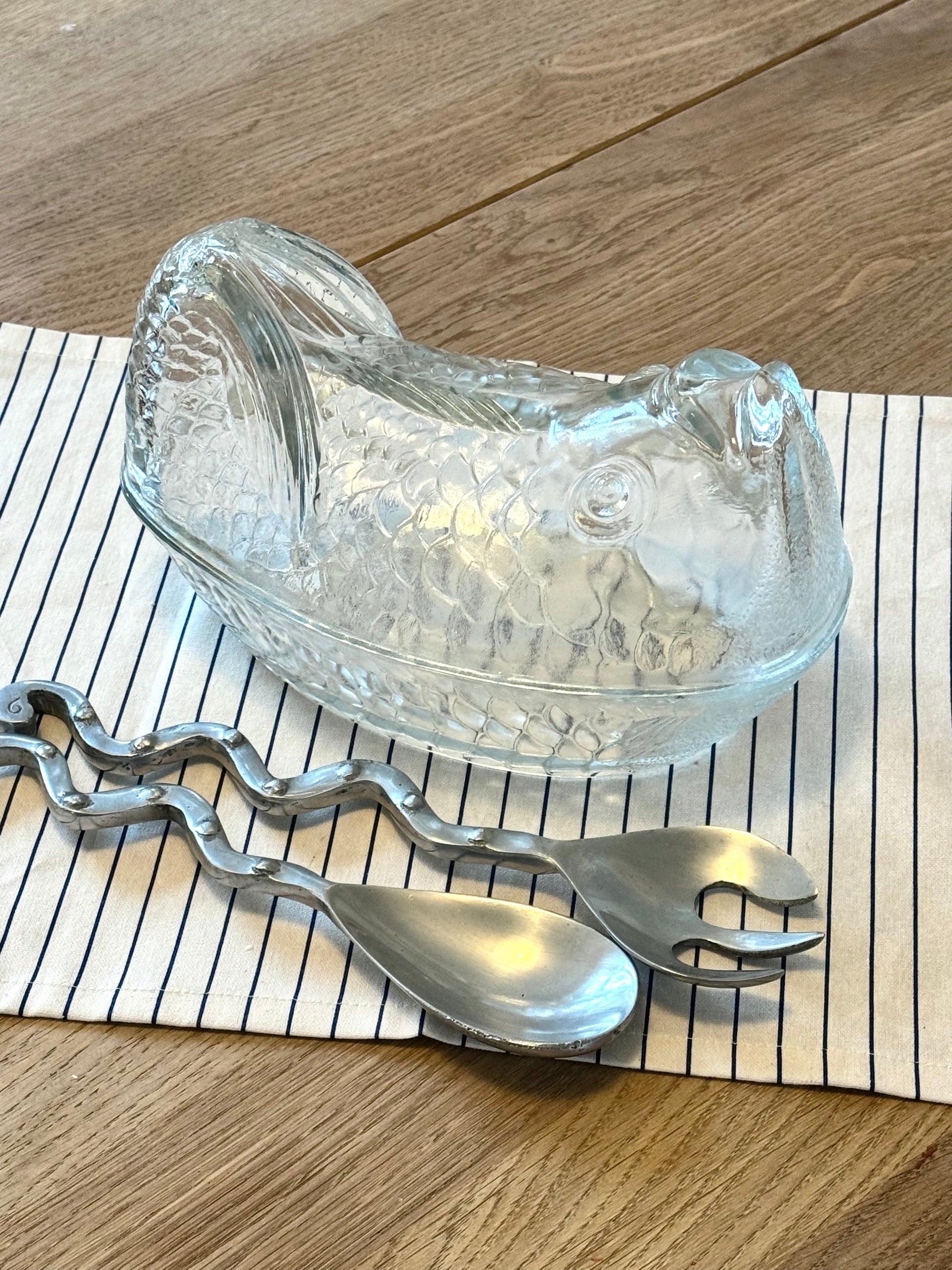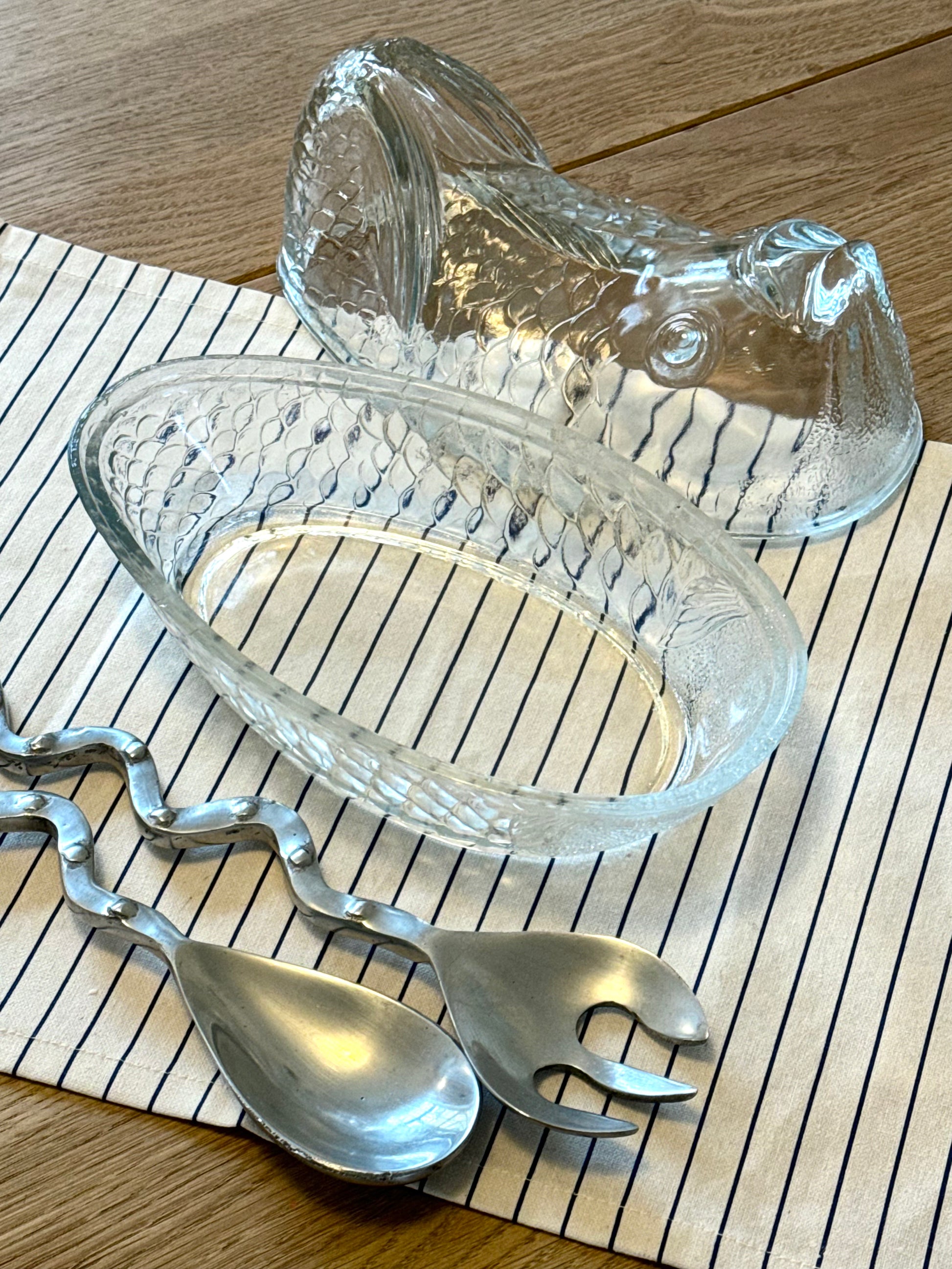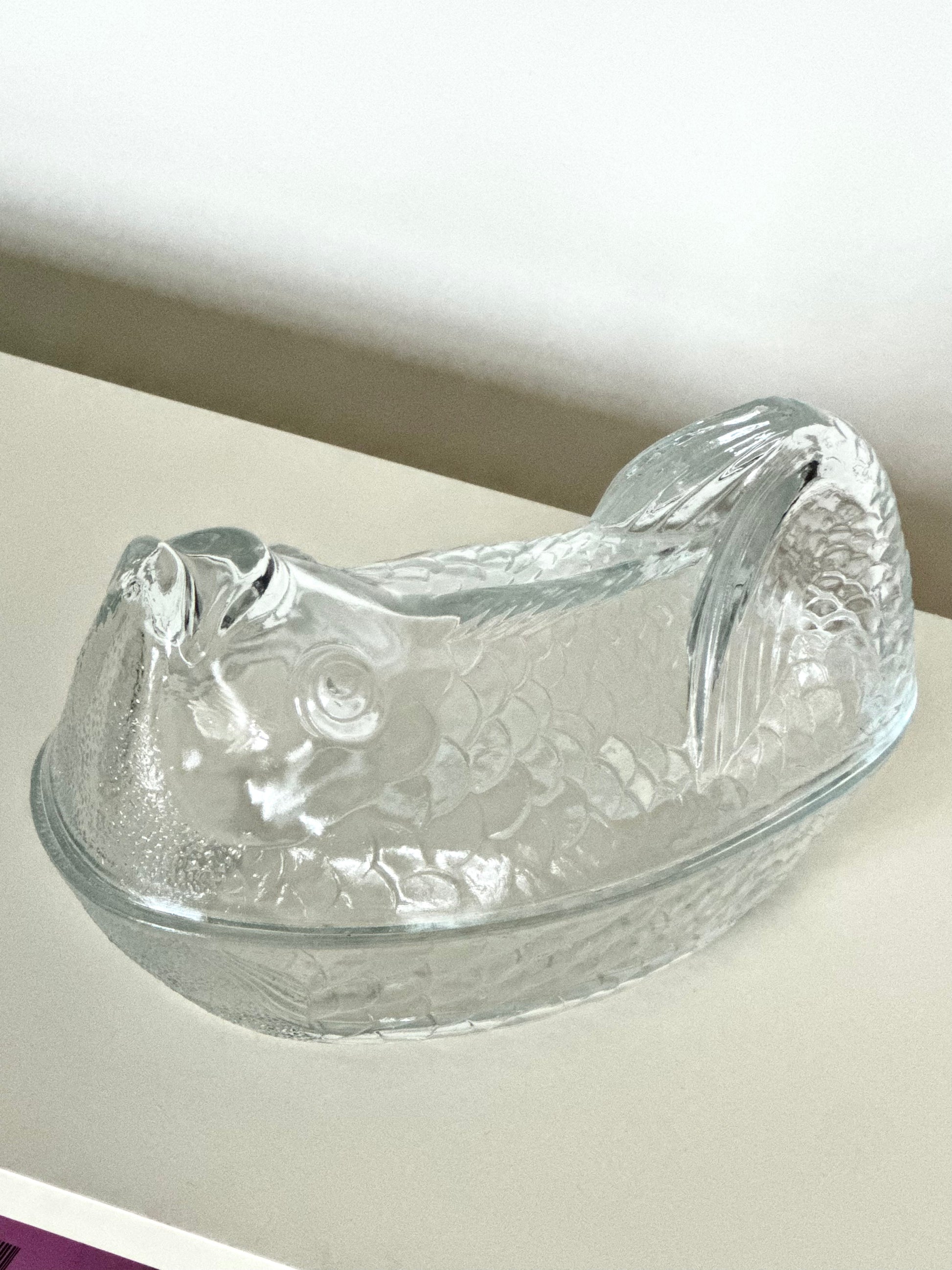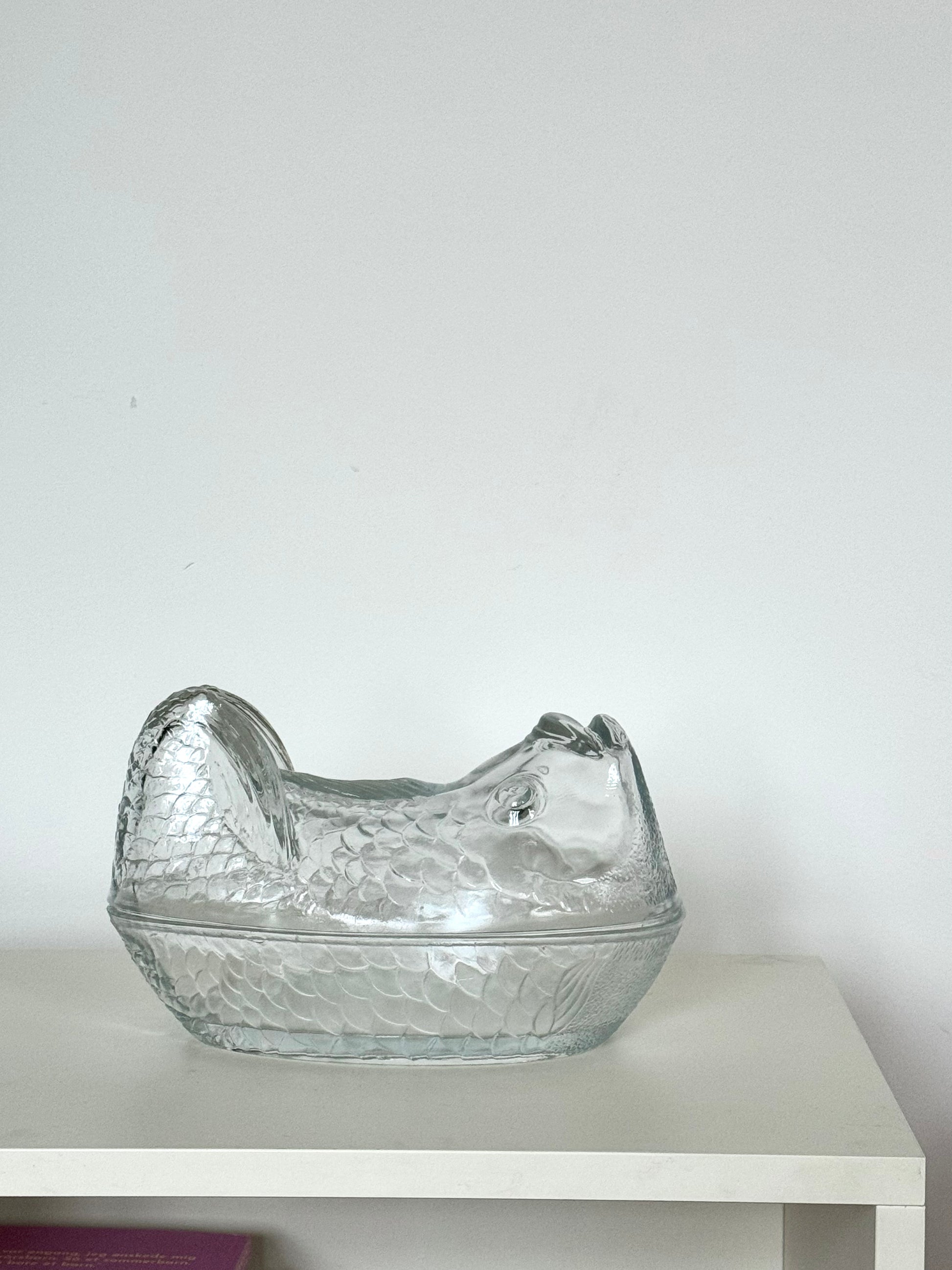 Cute fish terrine in glass, use it on the table or as decor. Very nice condition.