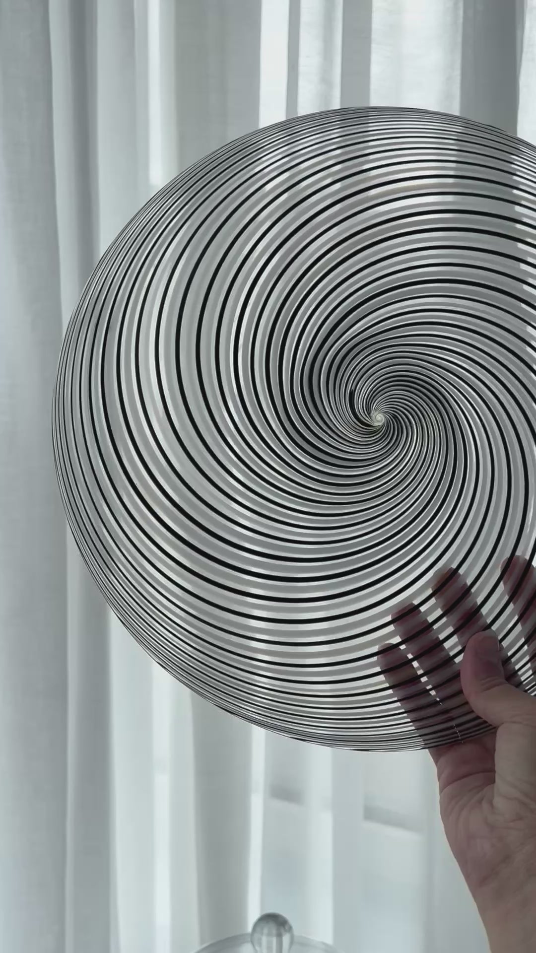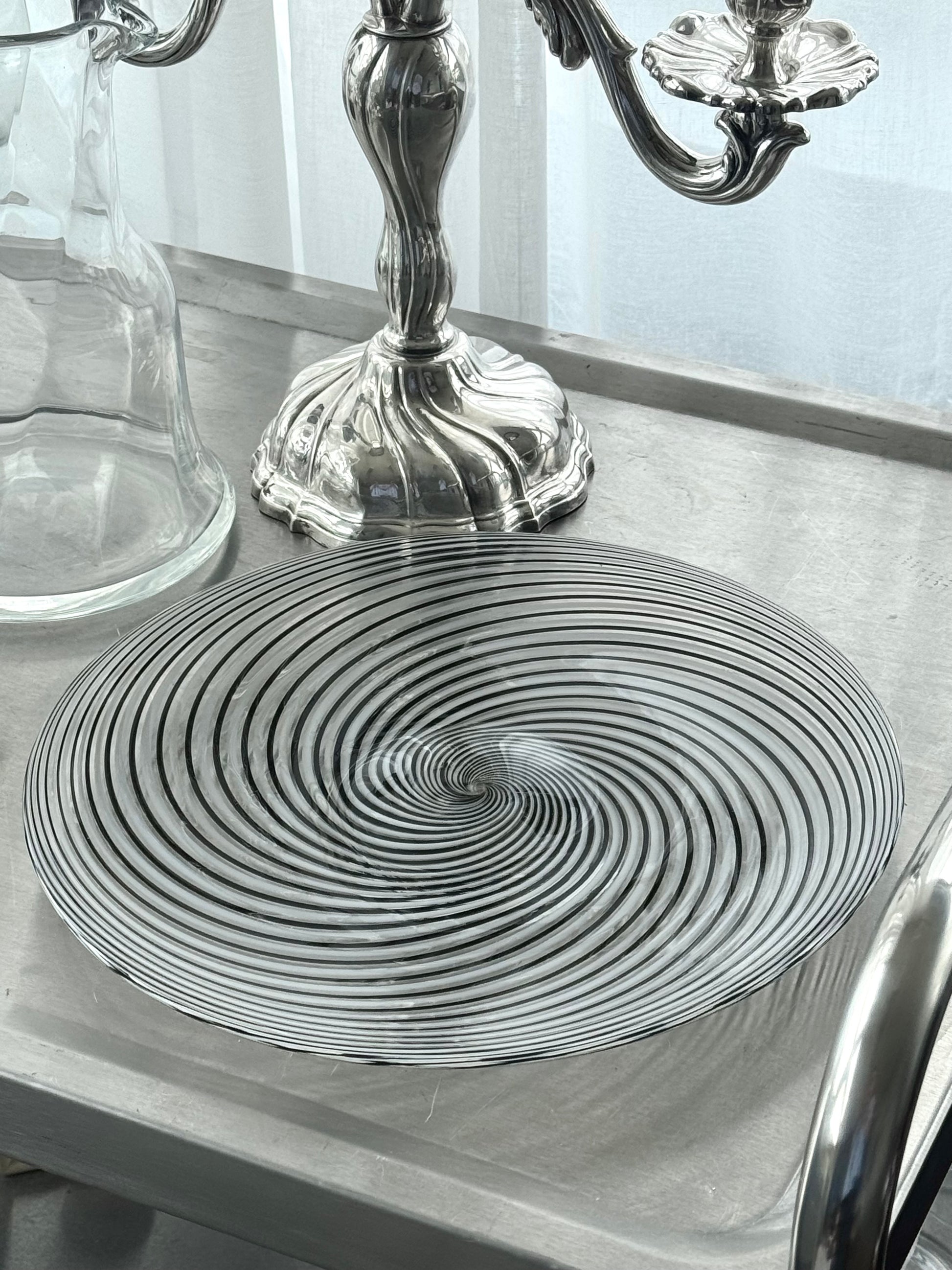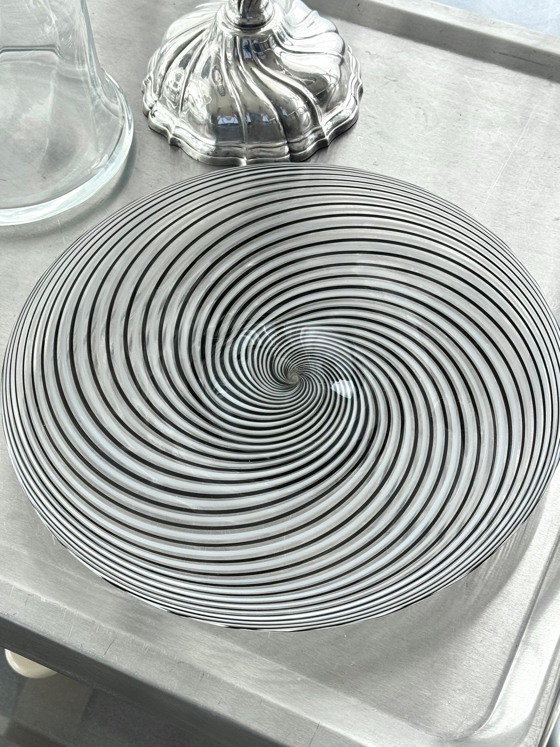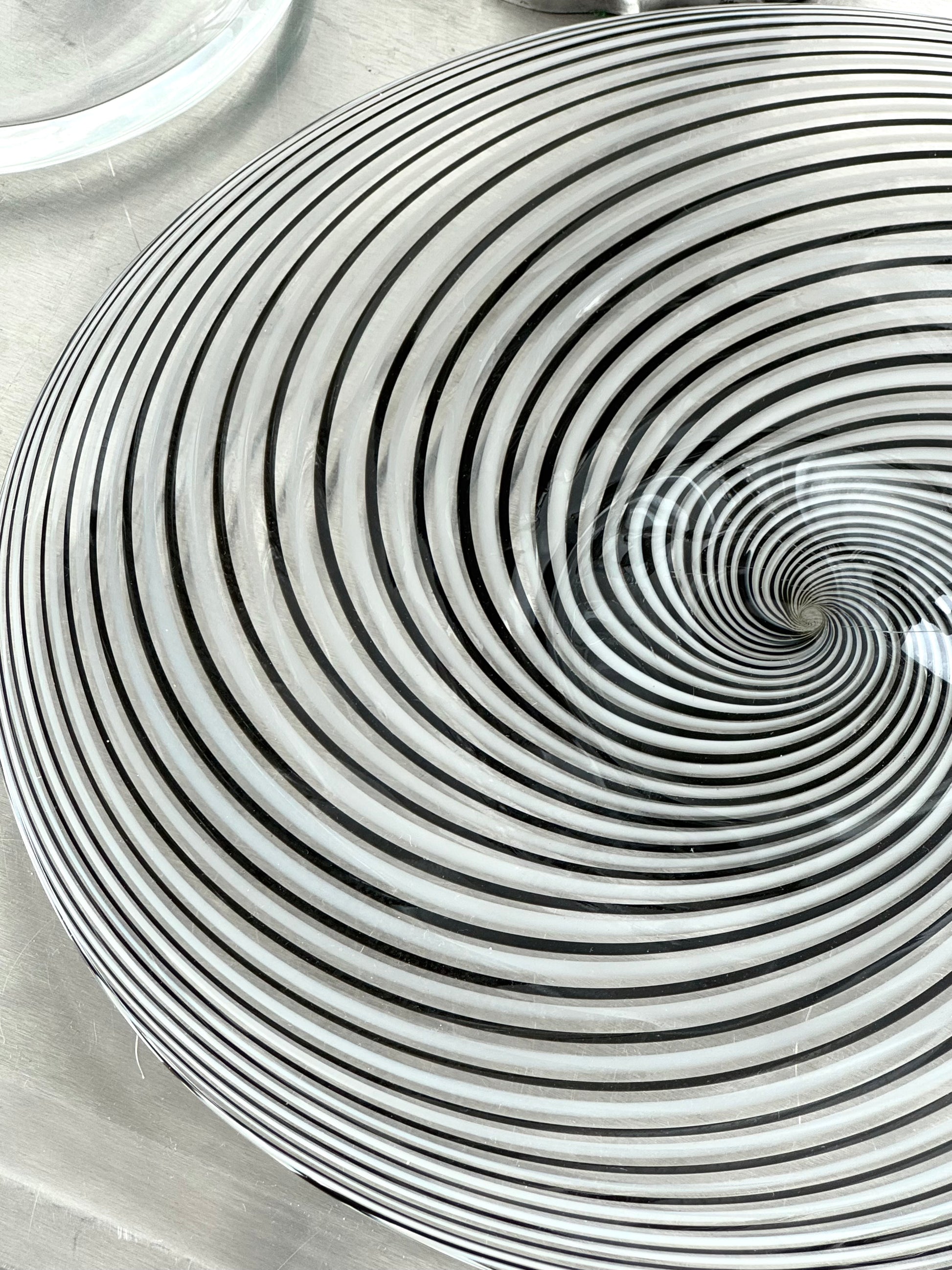 Stunning handmade centerpiece/bowl. Swirling clear and Dark glass. Condition is nice, with a Few surface scratches.