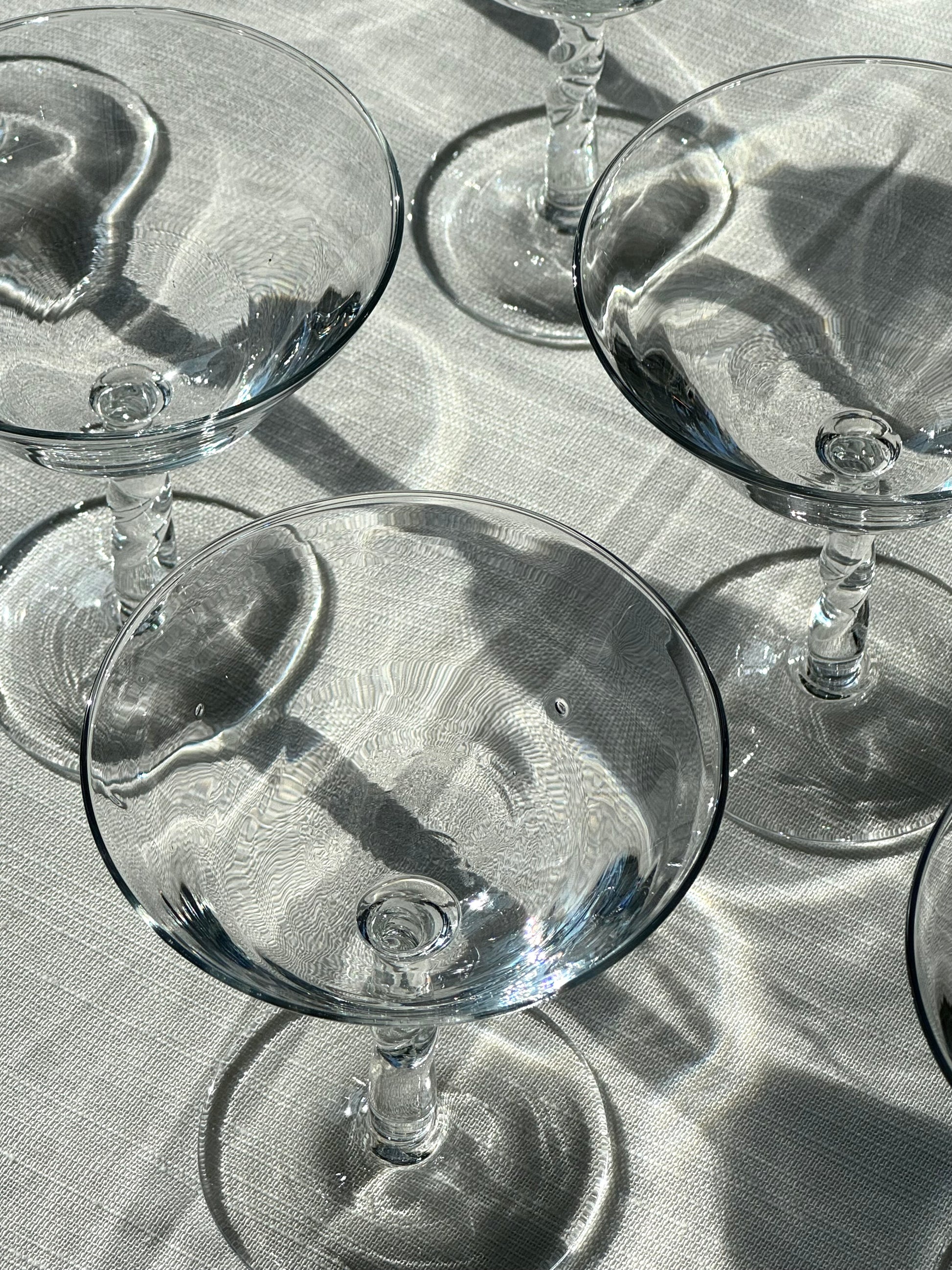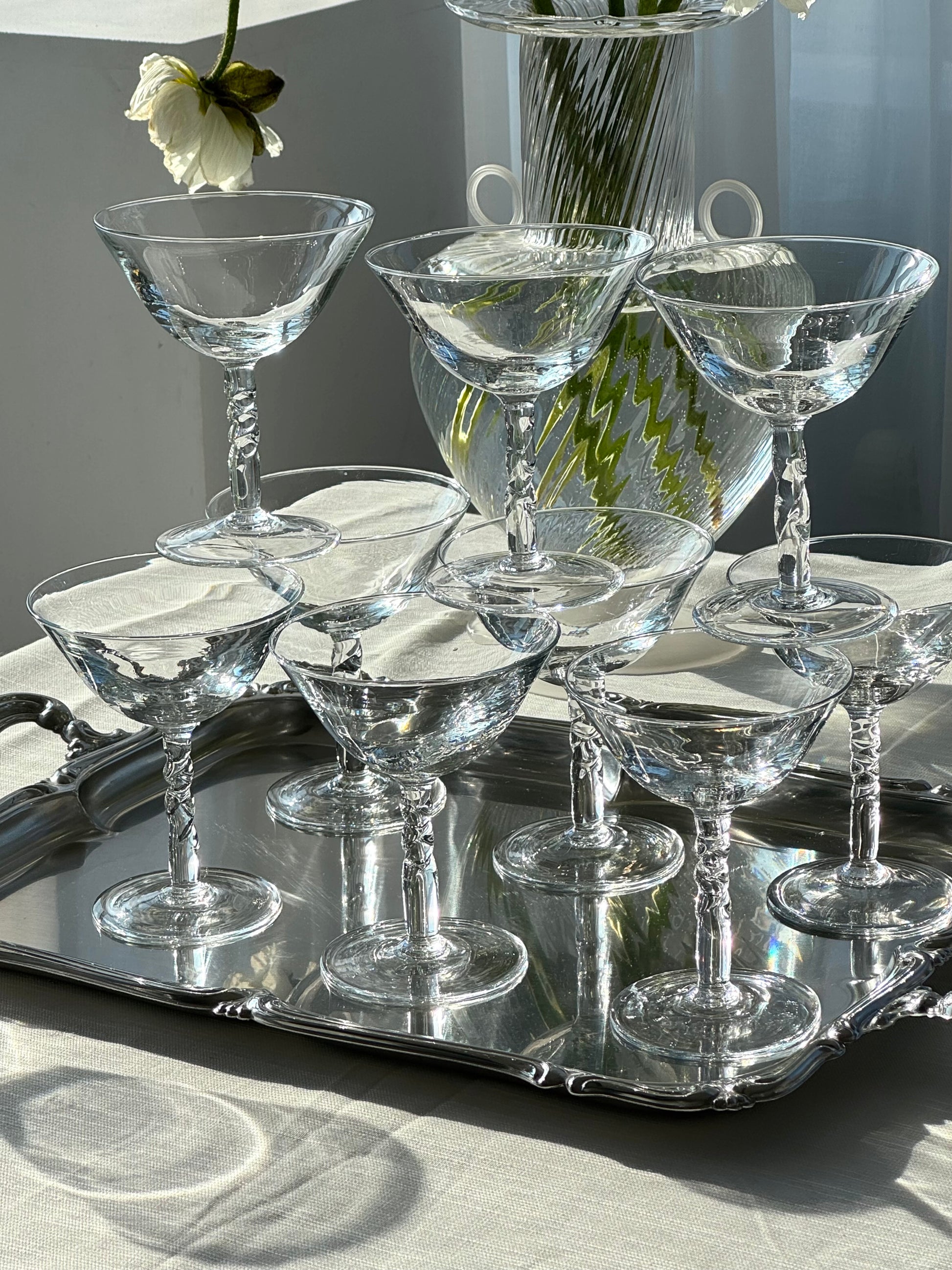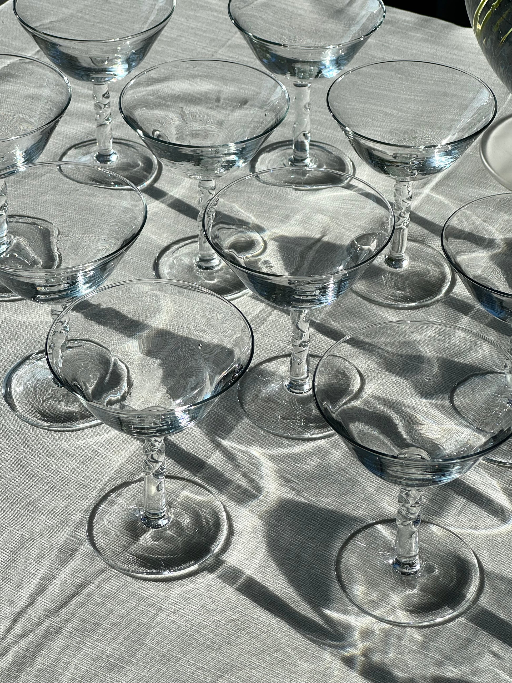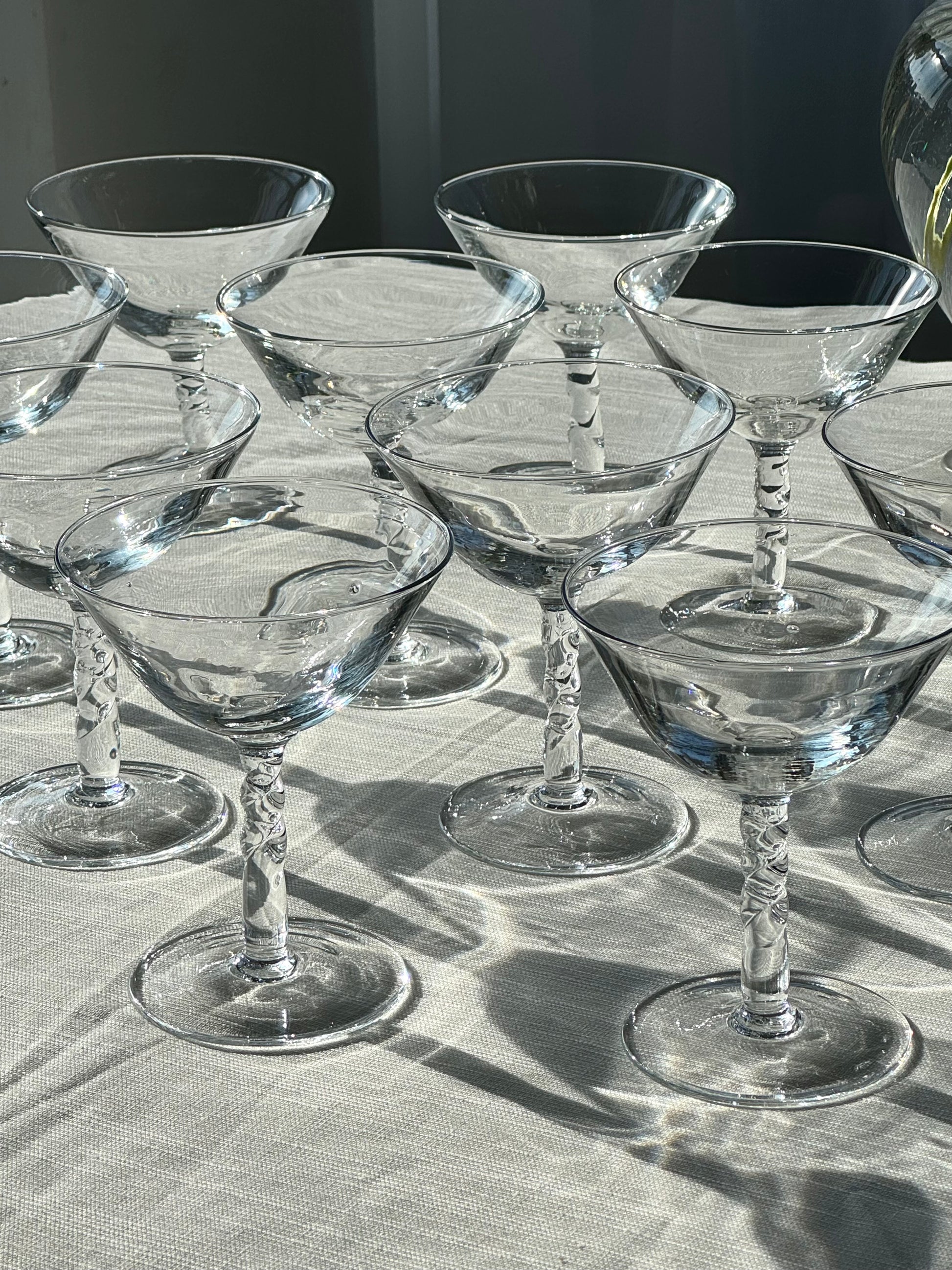 Absolutely stunning handmade champagne glasses, made in Italy. The glasses are crafted from thick glass with fine irregularities and small bubbles here and there, and feature a twisted stem. No two glasses are alike — unique and beautiful craftsmanship. Very good condition, perfect for champagne or cocktails. 10 available, Price is for one.