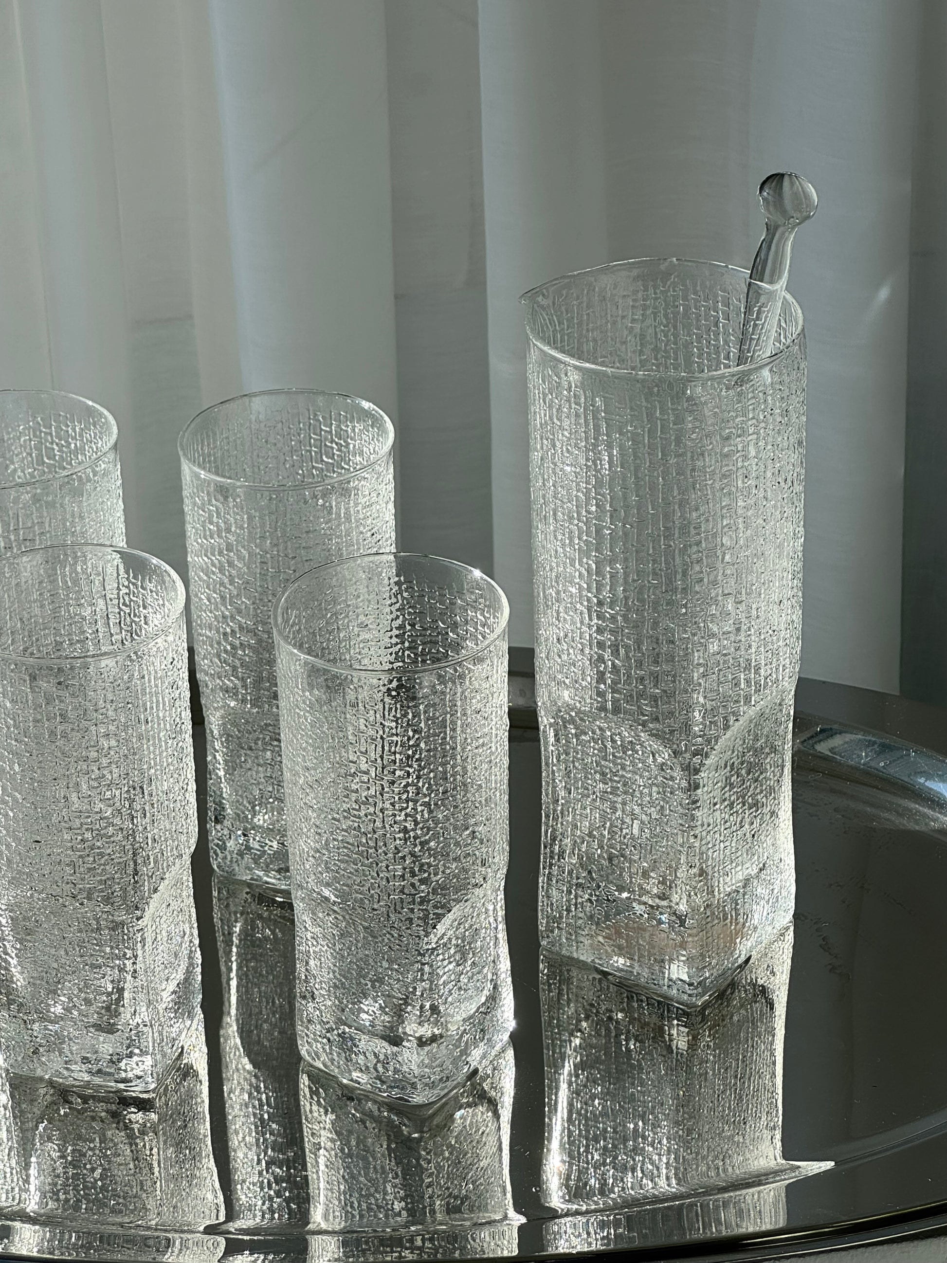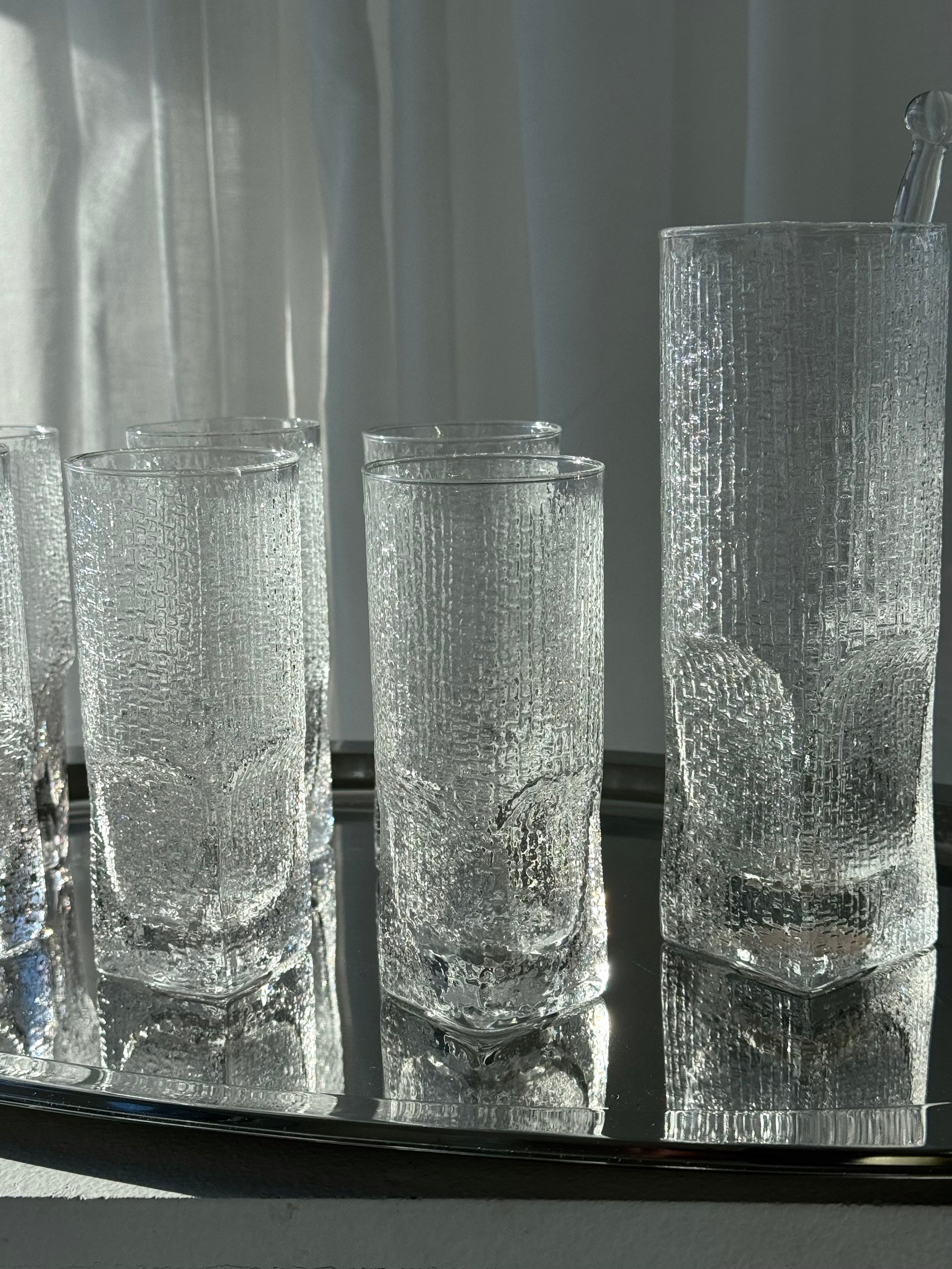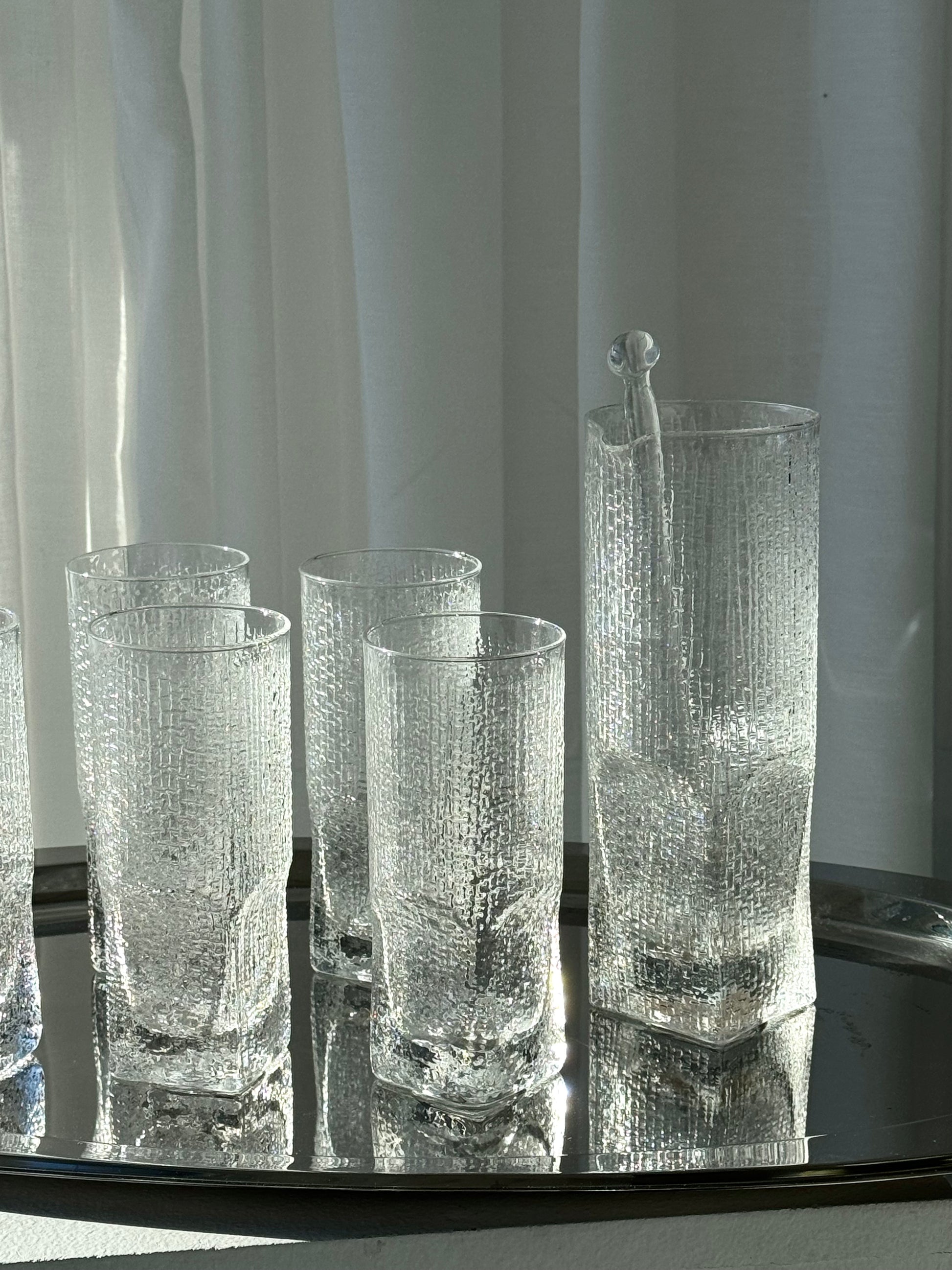 Incredibly beautiful handmade drinks set. Includes 6 tall glasses with an elegant textured pattern, along with a matching drinks pitcher and stirring stick. Lovely Italian craftsmanship in beautiful vintage condition. Sold as a set.