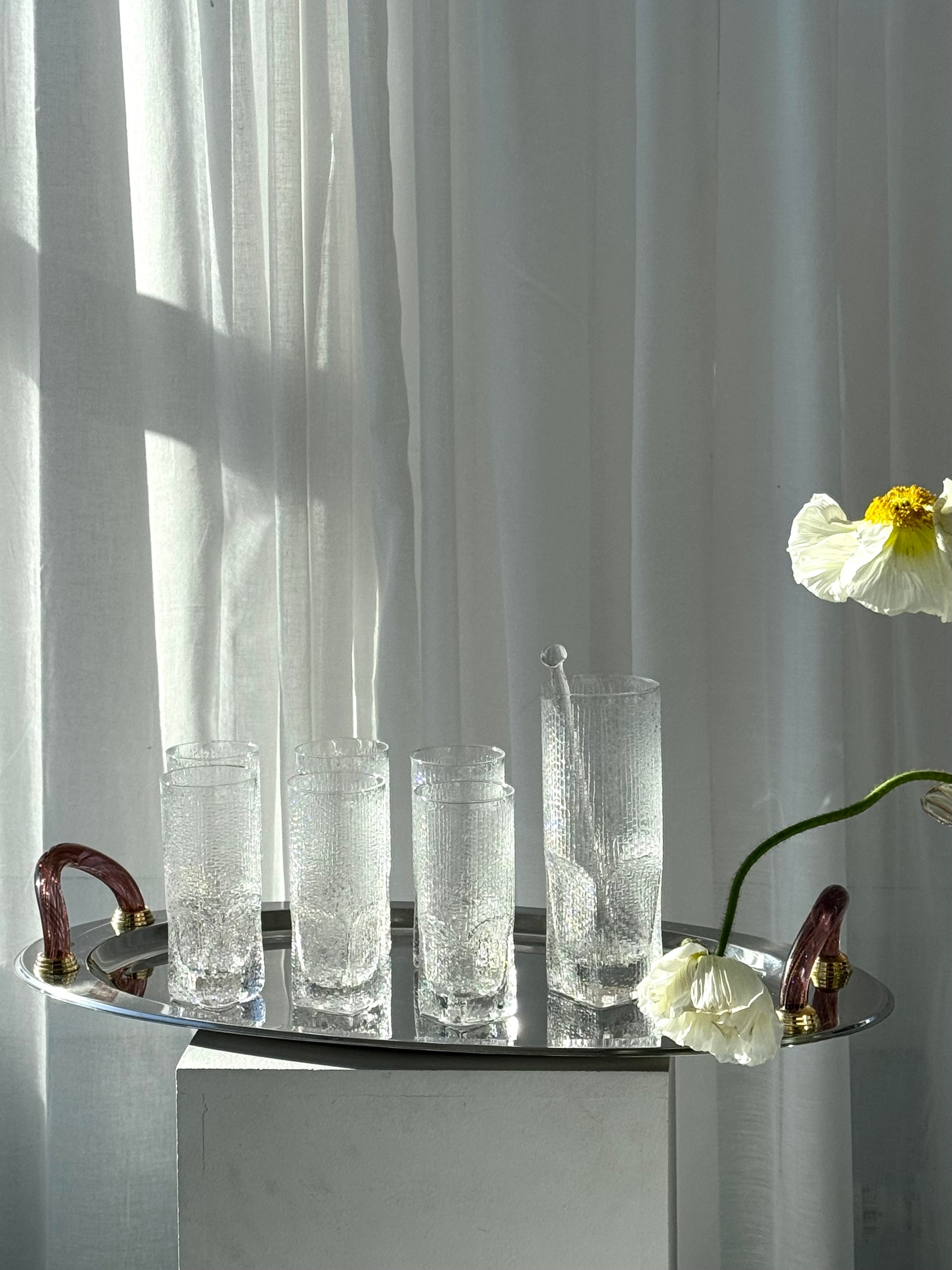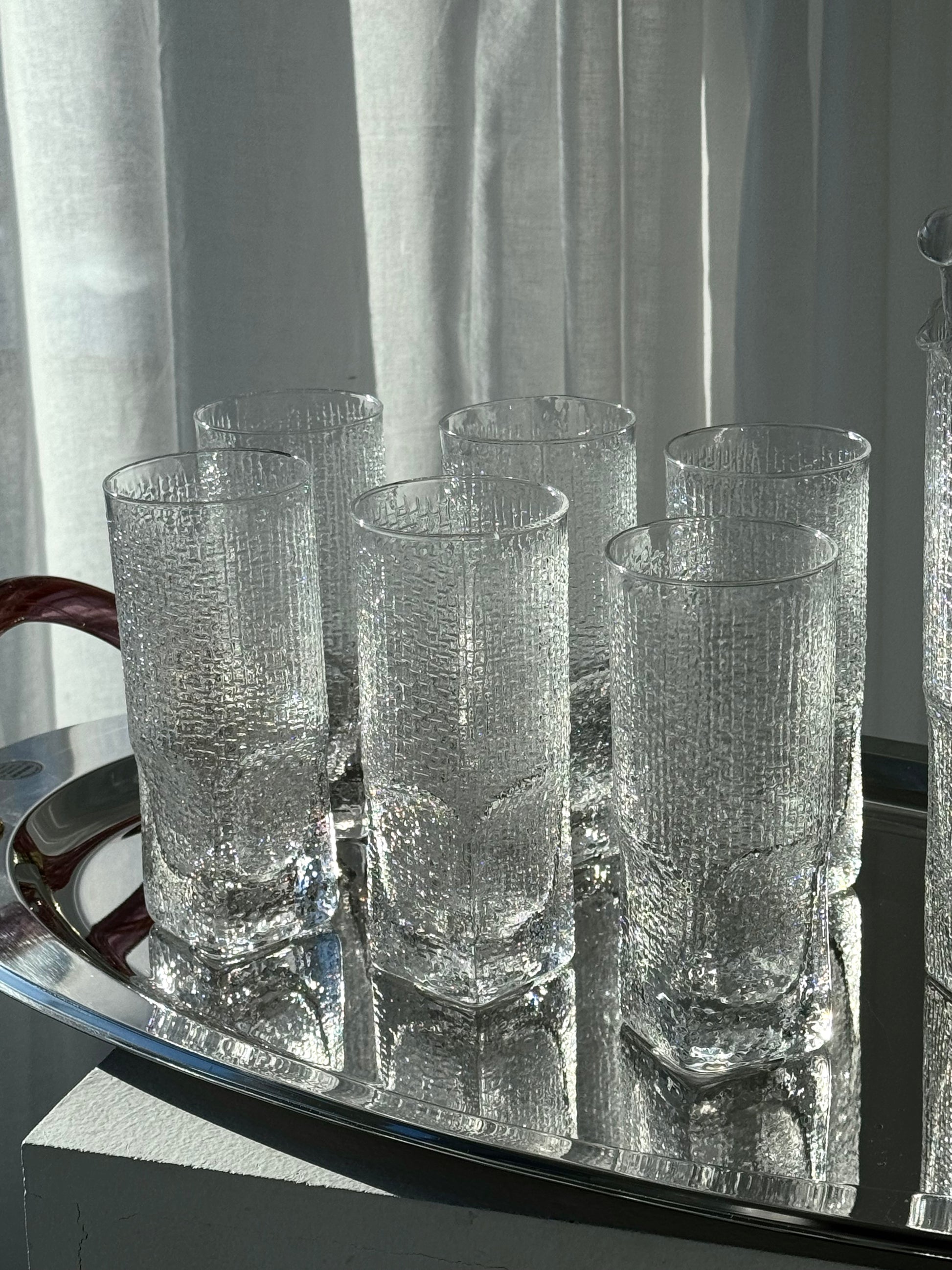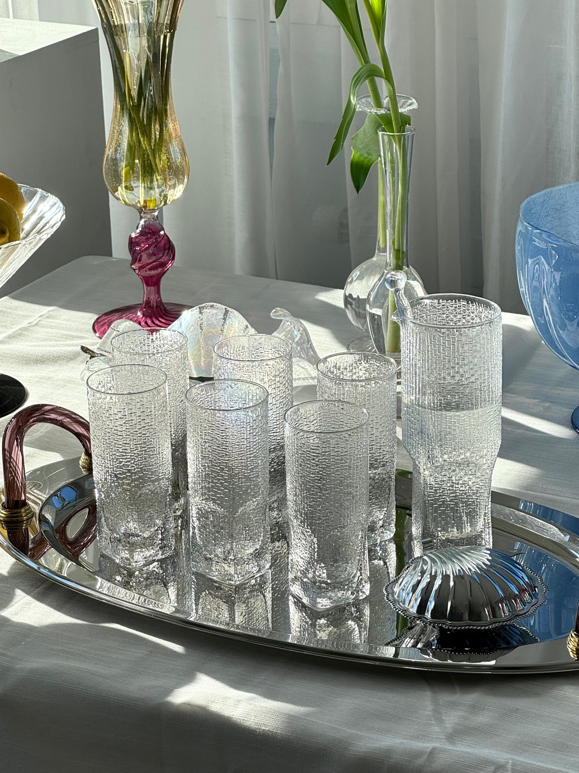 Incredibly beautiful handmade drinks set. Includes 6 tall glasses with an elegant textured pattern, along with a matching drinks pitcher and stirring stick. Lovely Italian craftsmanship in beautiful vintage condition. Sold as a set.