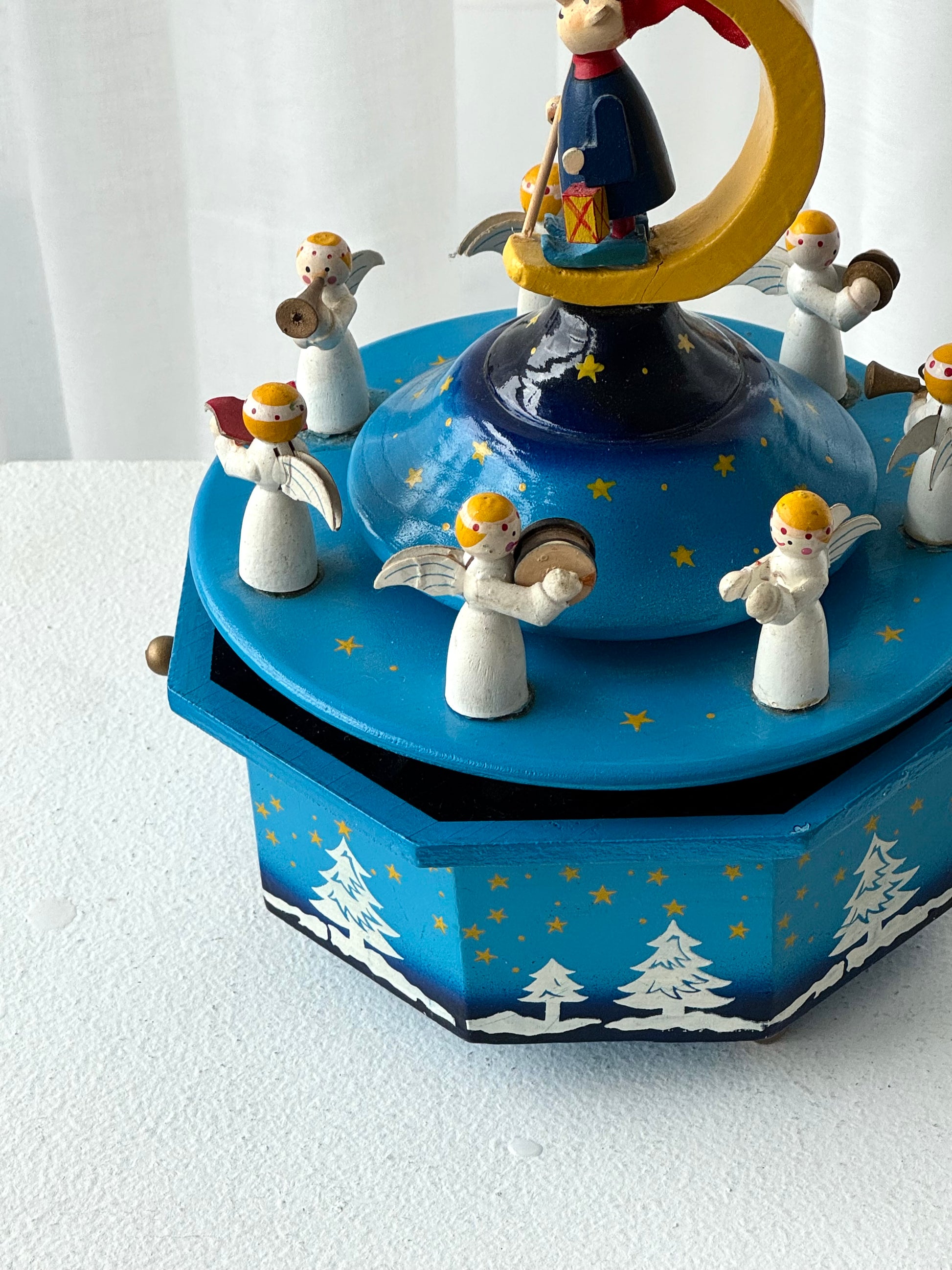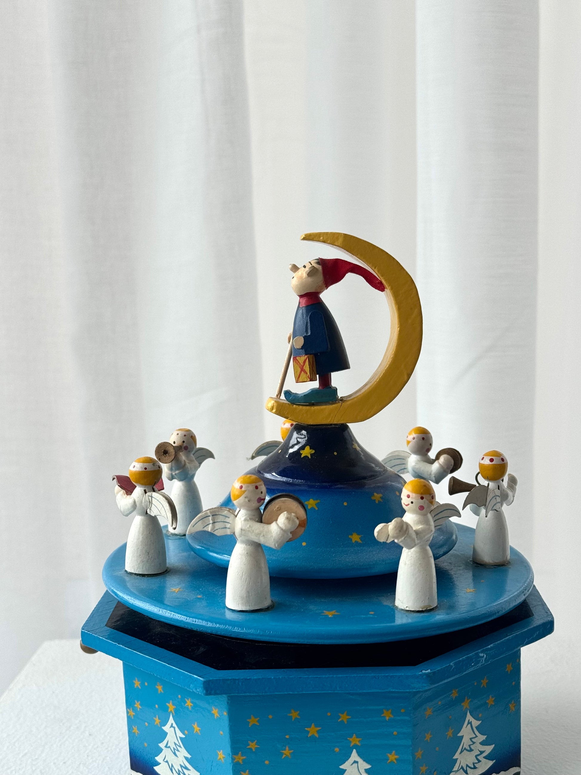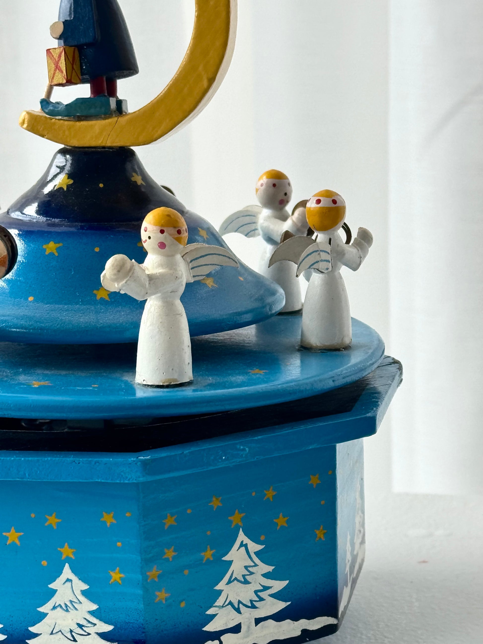 The most beautiful vintage handmade music box. Classic German Christmas decoration in shades of blue, decorated with Christmas trees. Small hand-painted angel figures spin around a gnome on the moon.