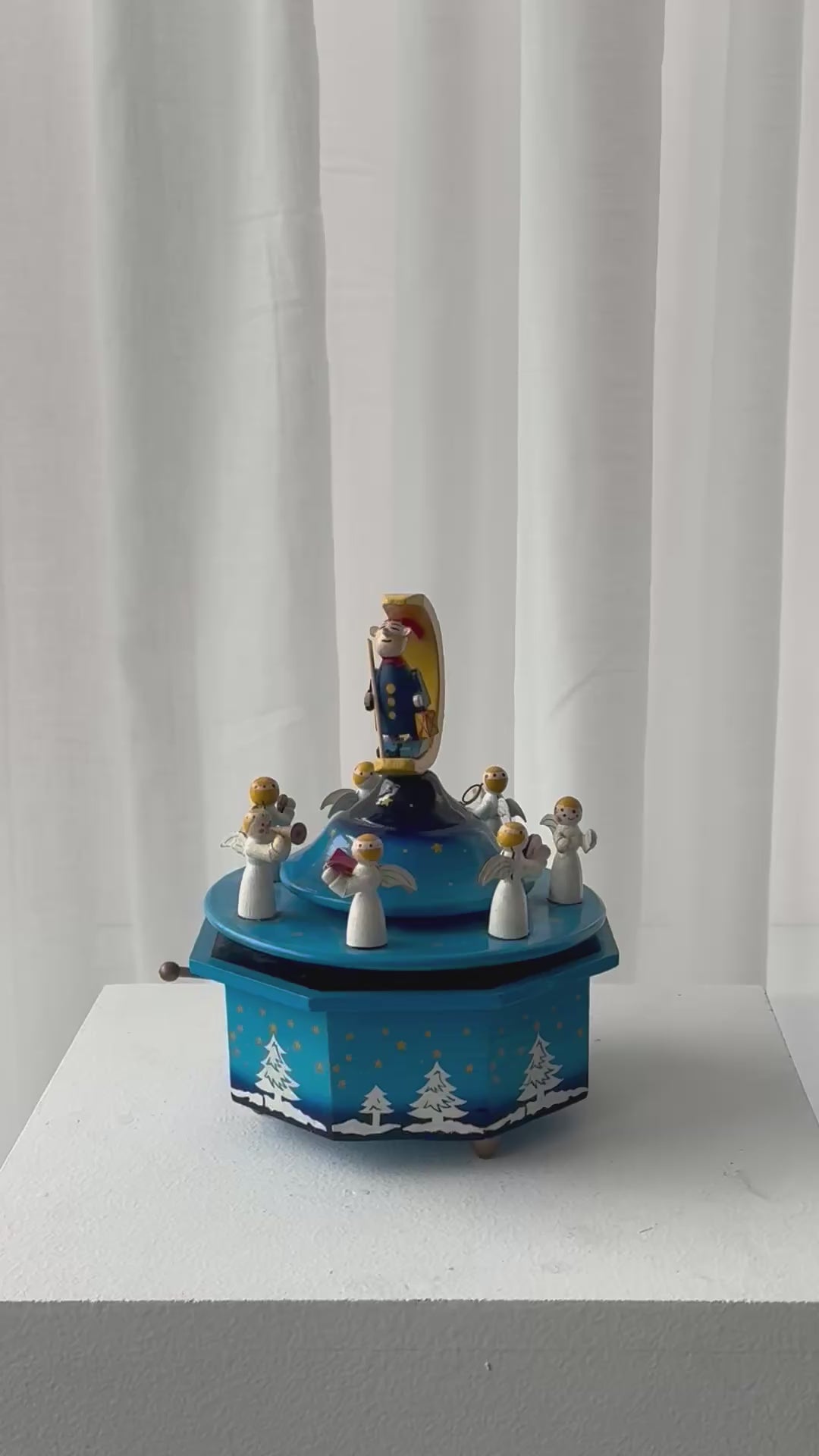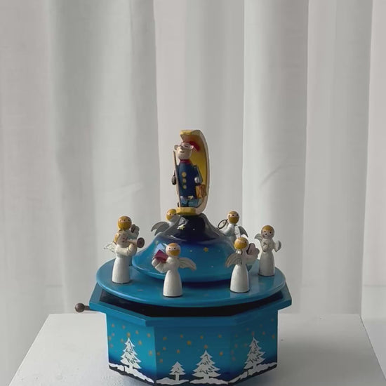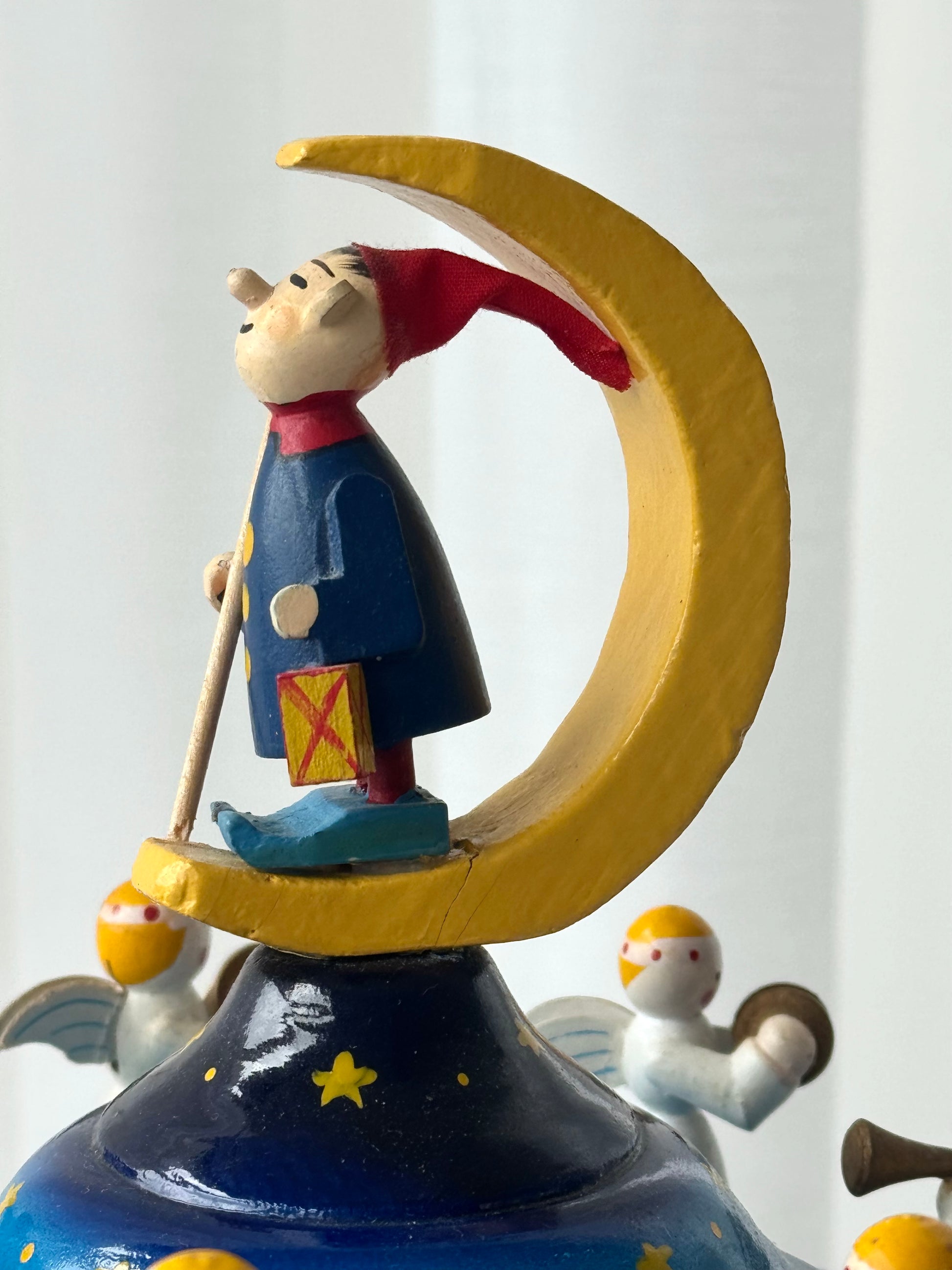 The most beautiful vintage handmade music box. Classic German Christmas decoration in shades of blue, decorated with Christmas trees. Small hand-painted angel figures spin around a gnome on the moon.