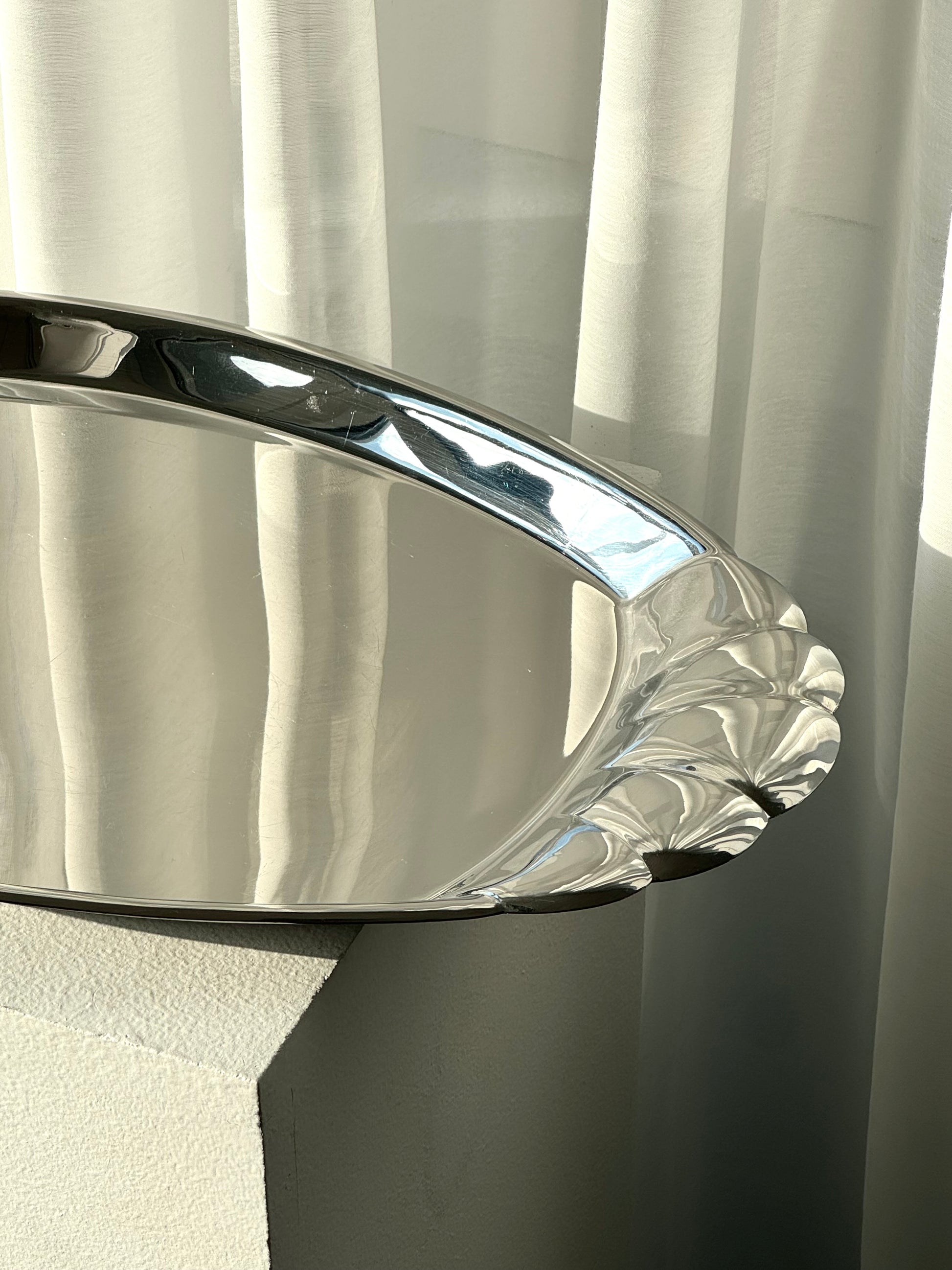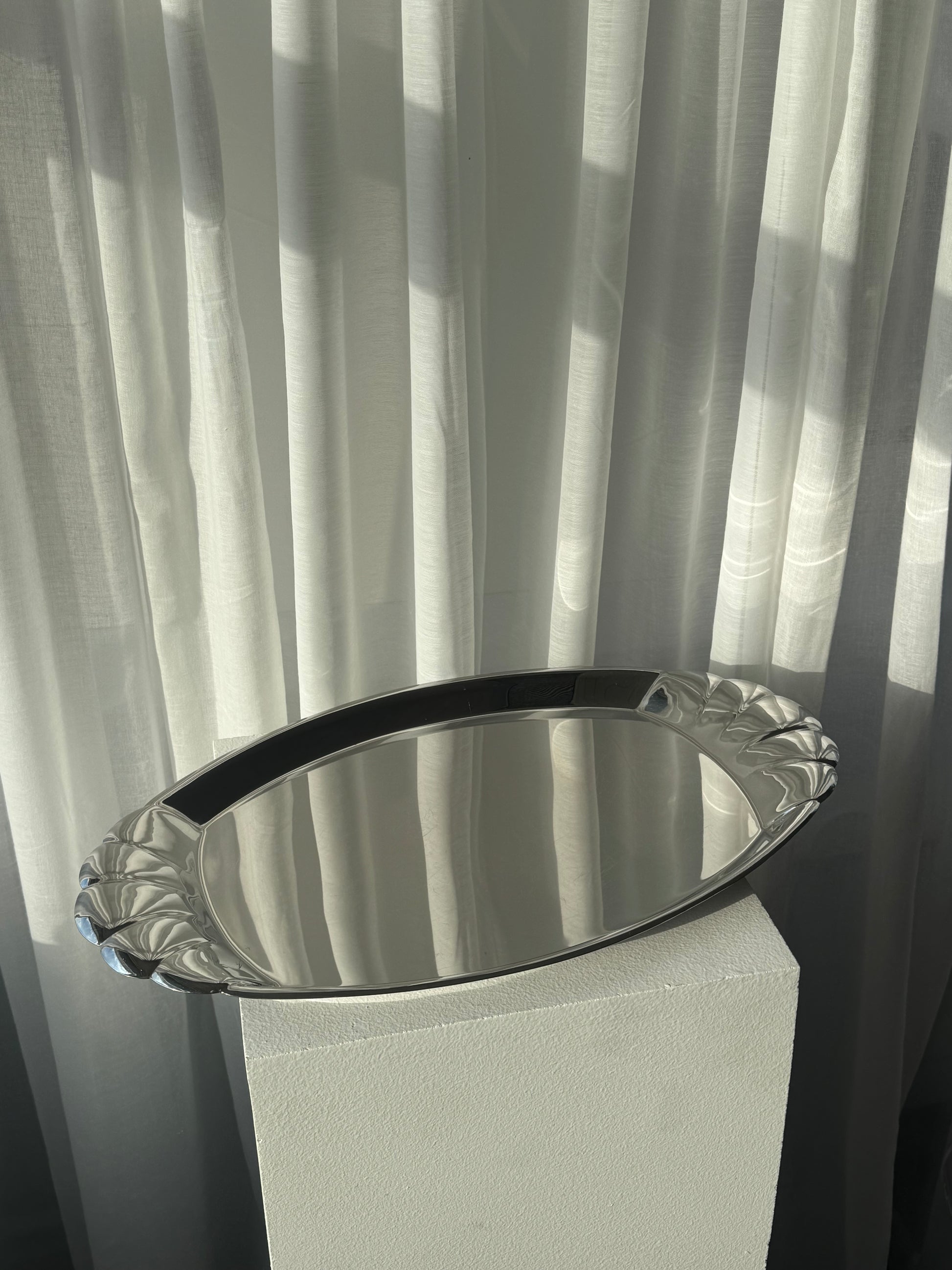 Long italain Inox dish, with Stunning clam like handles. Nice condition.