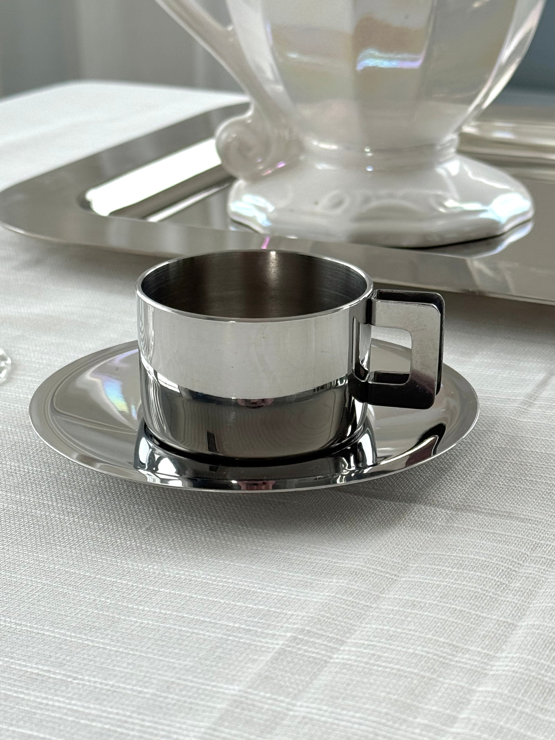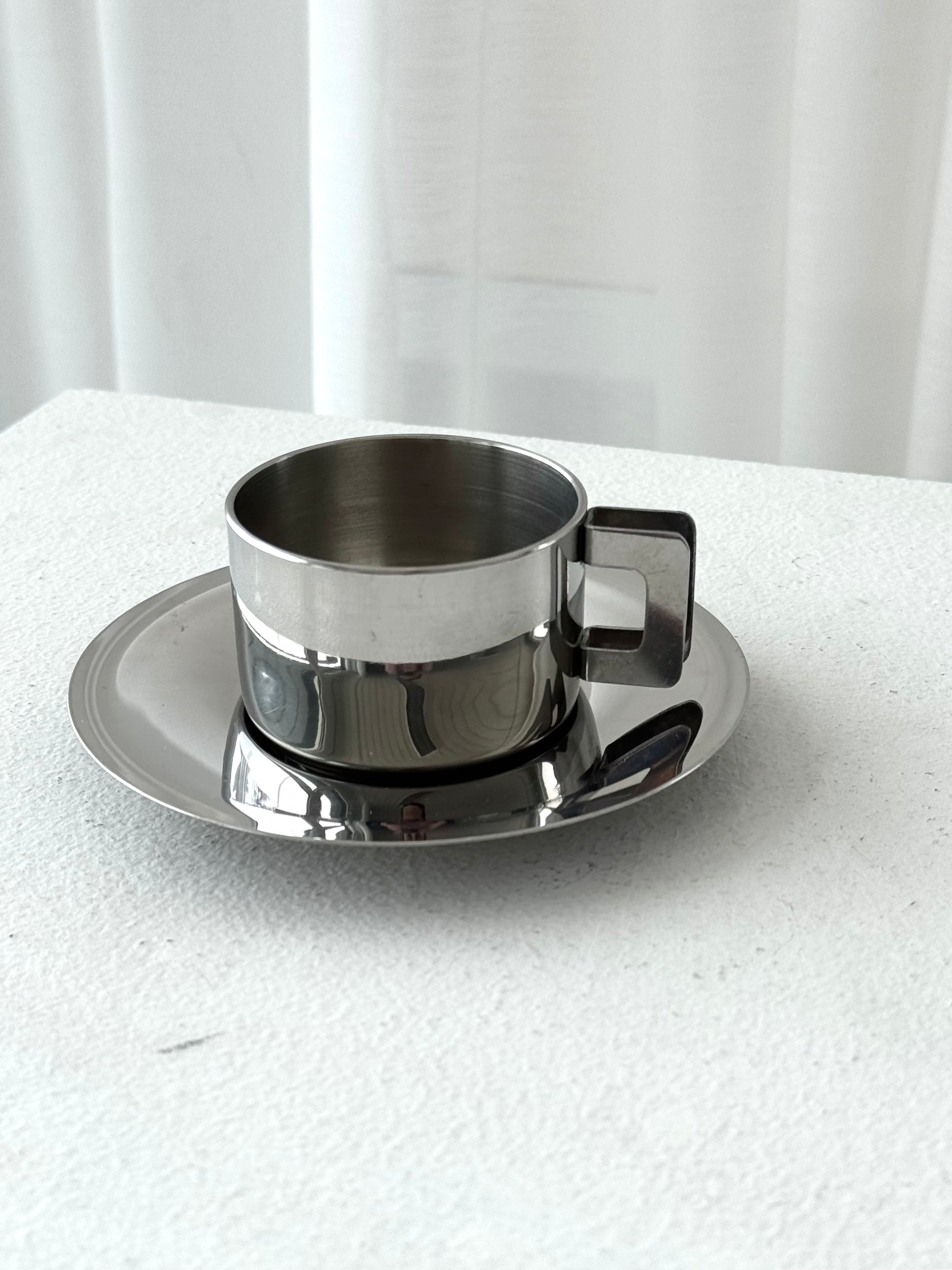 Cute vintage Italian espresso cup. Doublesided Inox with sqaured handle and matching saucer. Nice vintage condition. 6 available, Price is for one.