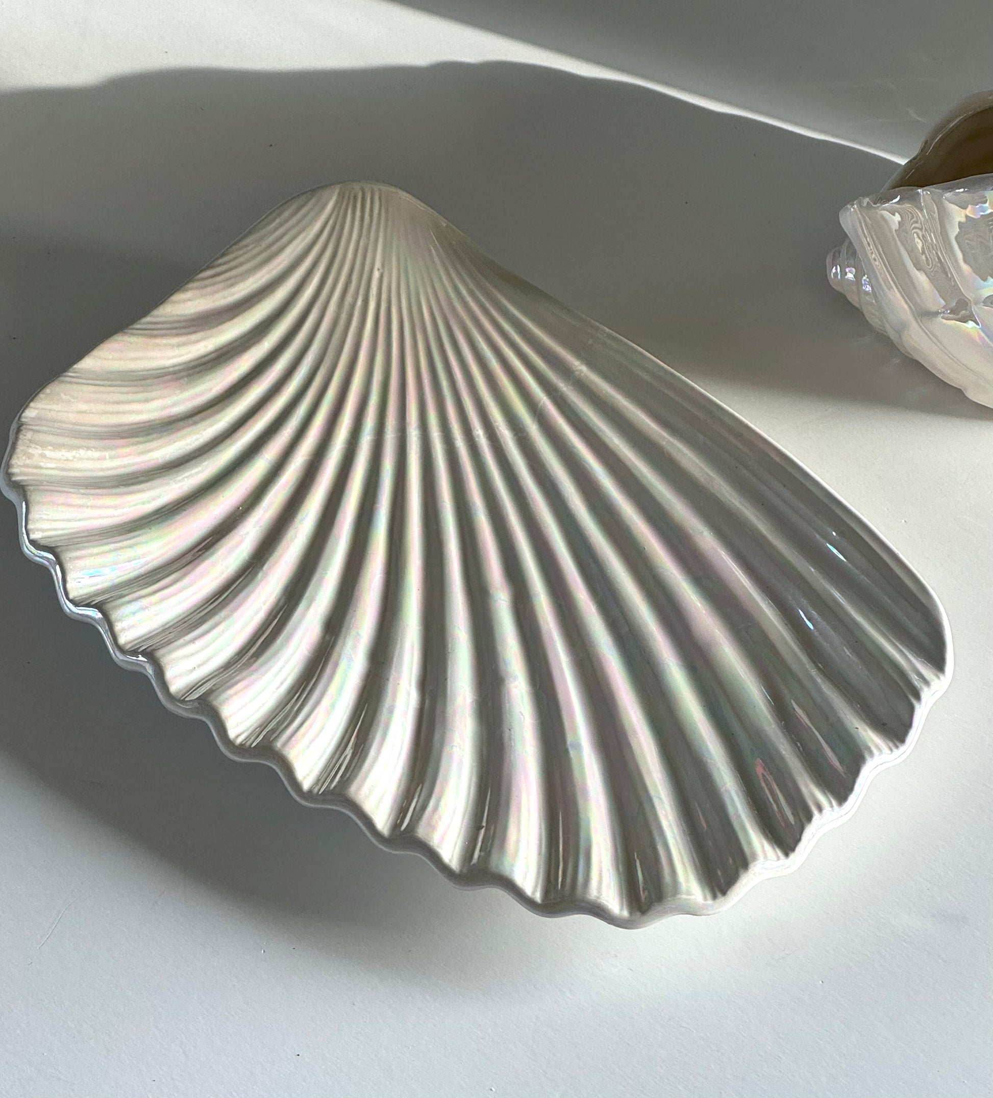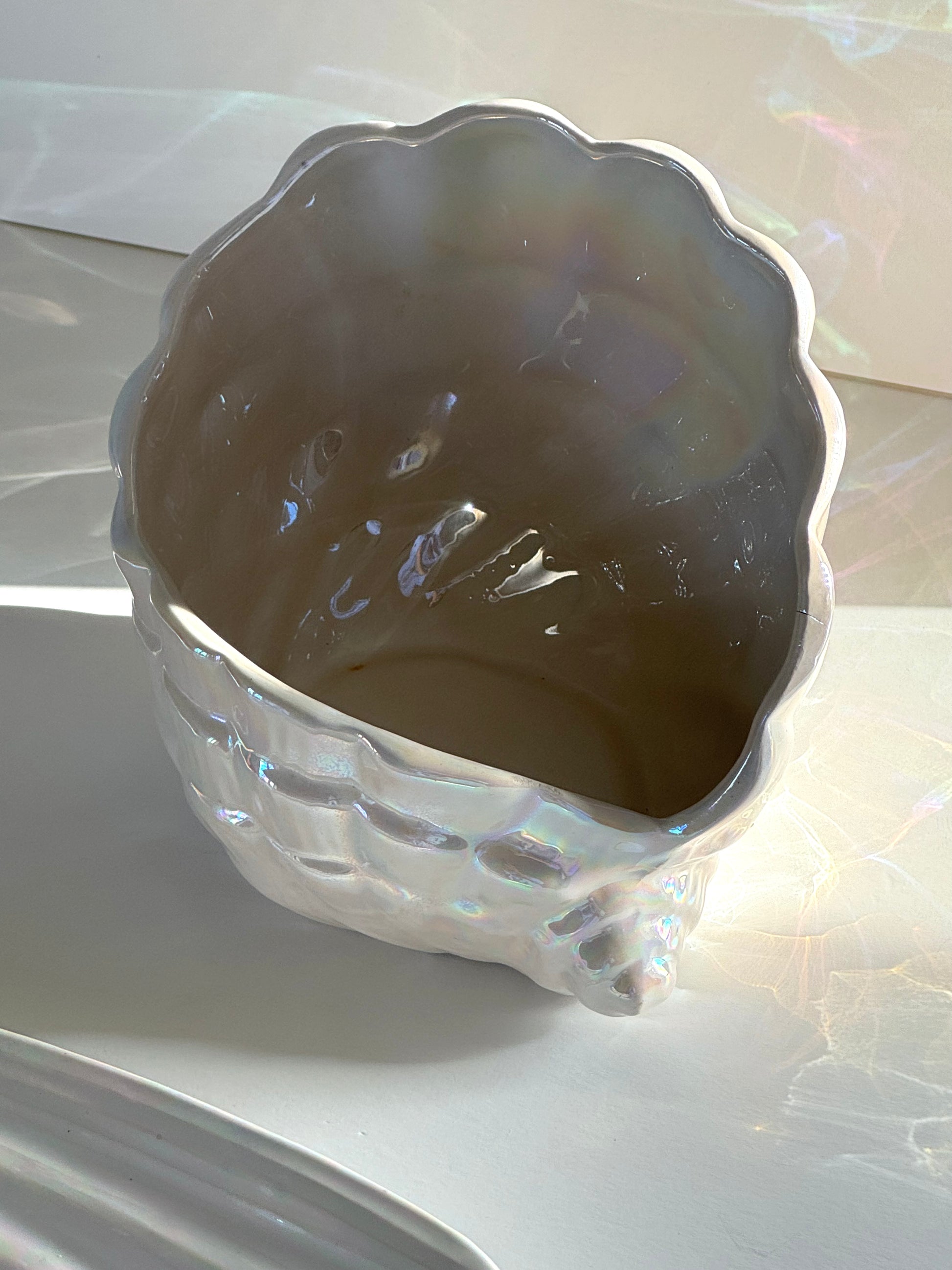 Stunning ceramic clam bowl and dish in mother of peal glaze. Nice condition, minor signs of use.