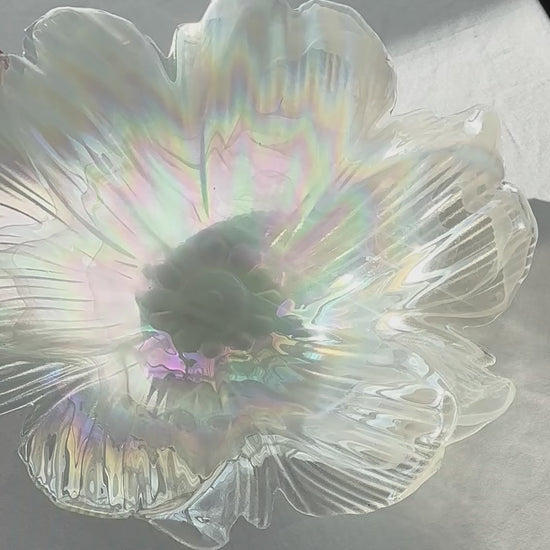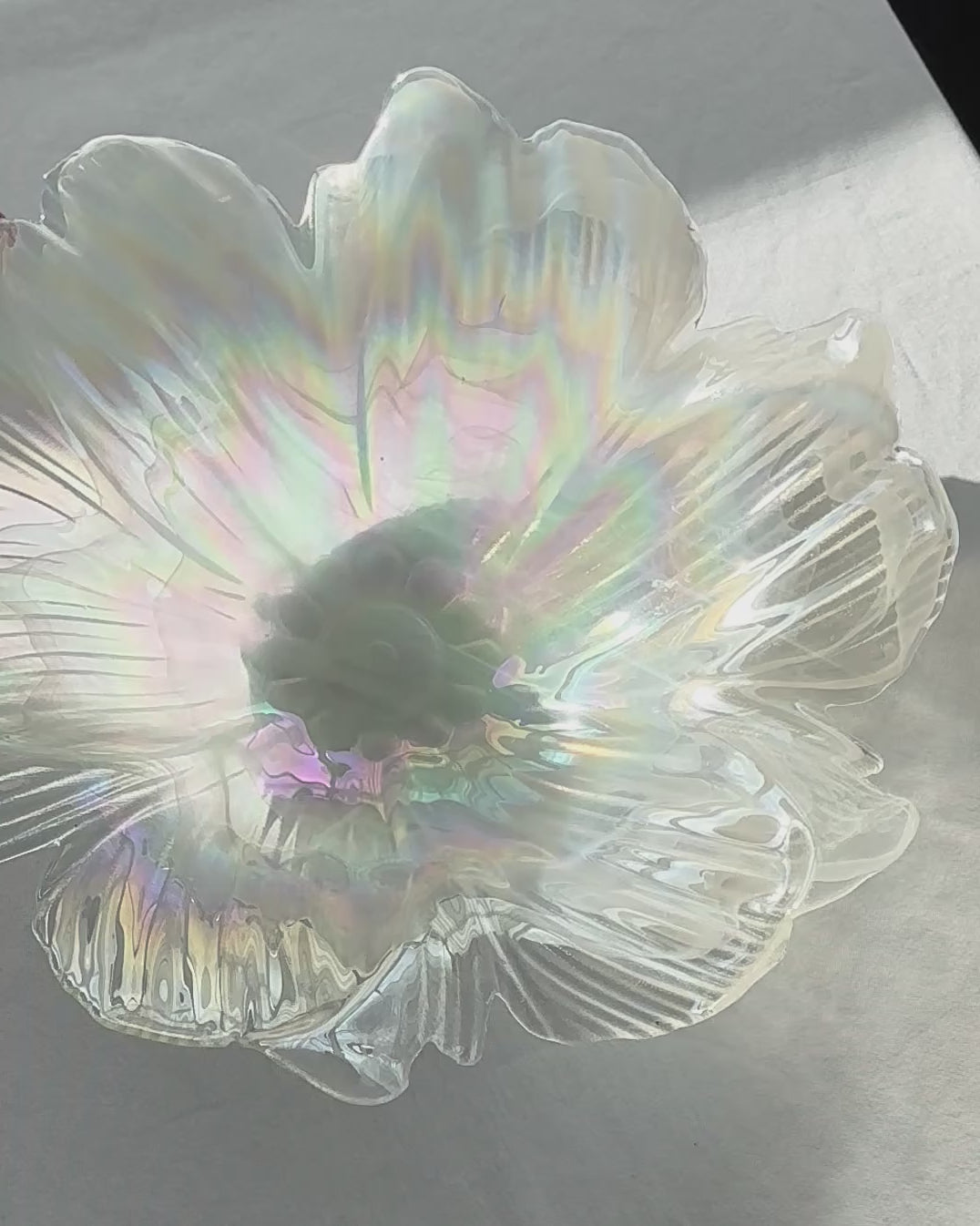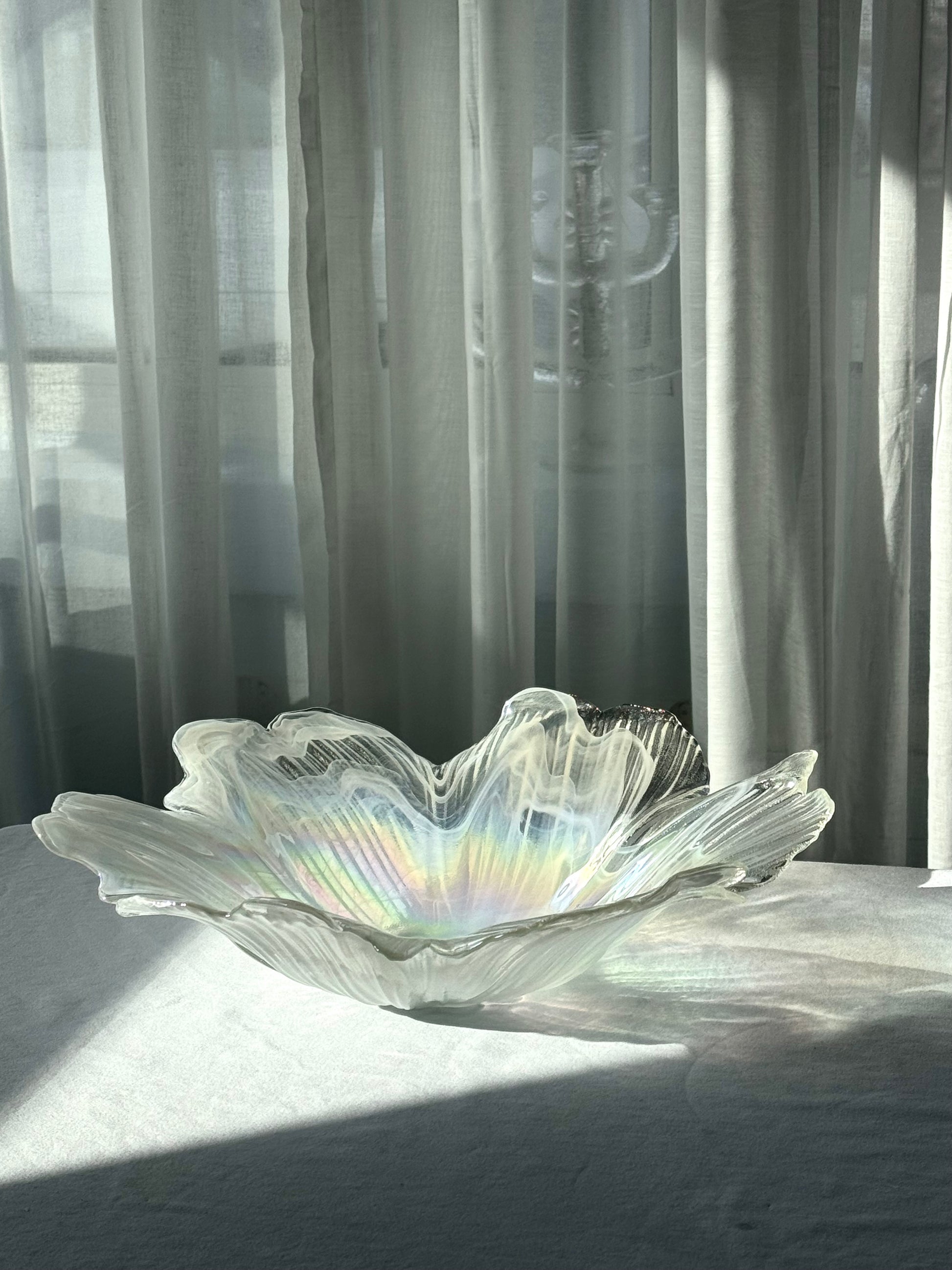 Large glass bowl with a mother-of-pearl effect, shaped like a flower. Incredibly beautiful in the sunlight. Use it for serving or as a stunning decorative centerpiece. Good condition.