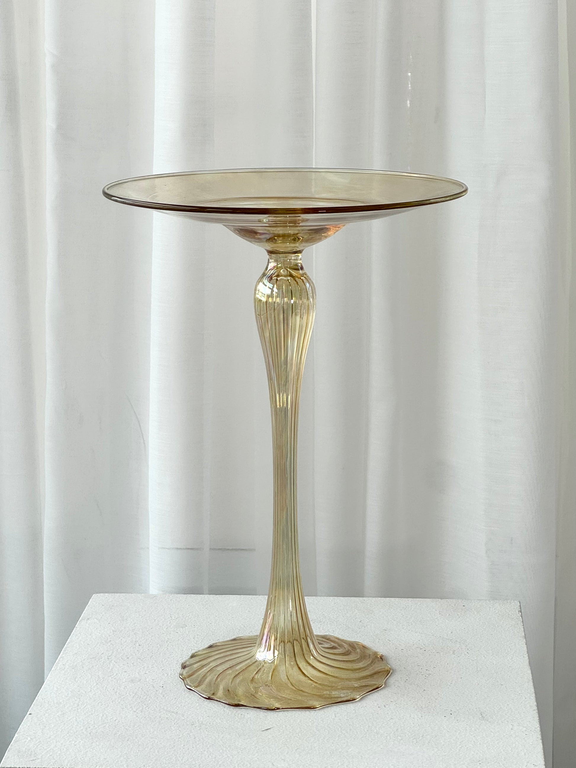 The most beautiful Murano glass stand. Swirling thin glass in a yellowish tone, ending in a dish. Perfect for decoration or a stunning table setting. In lovely vintage condition.