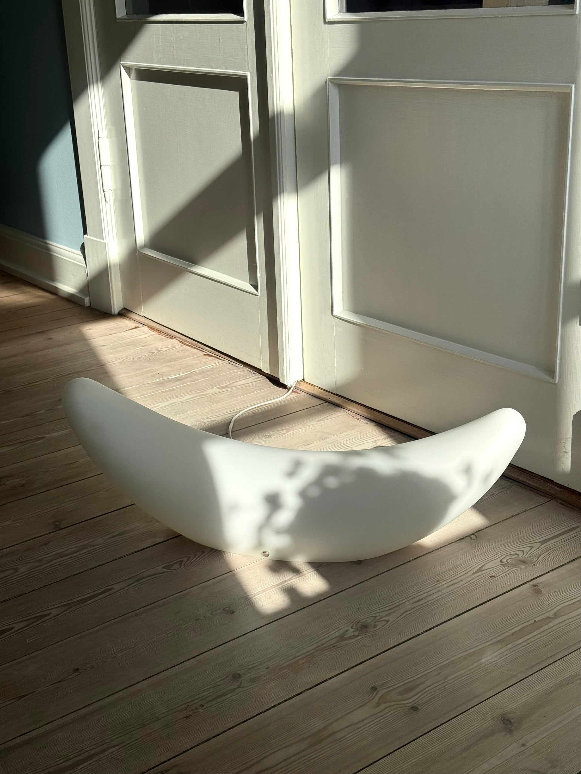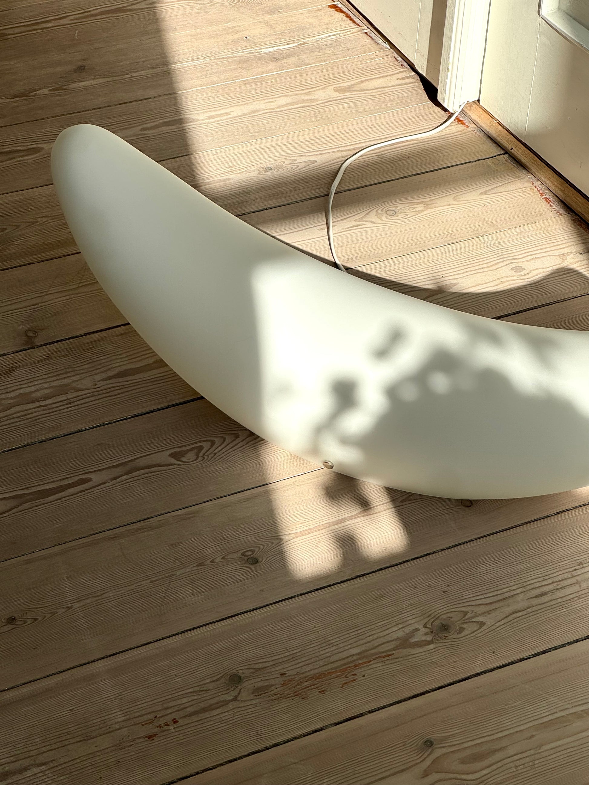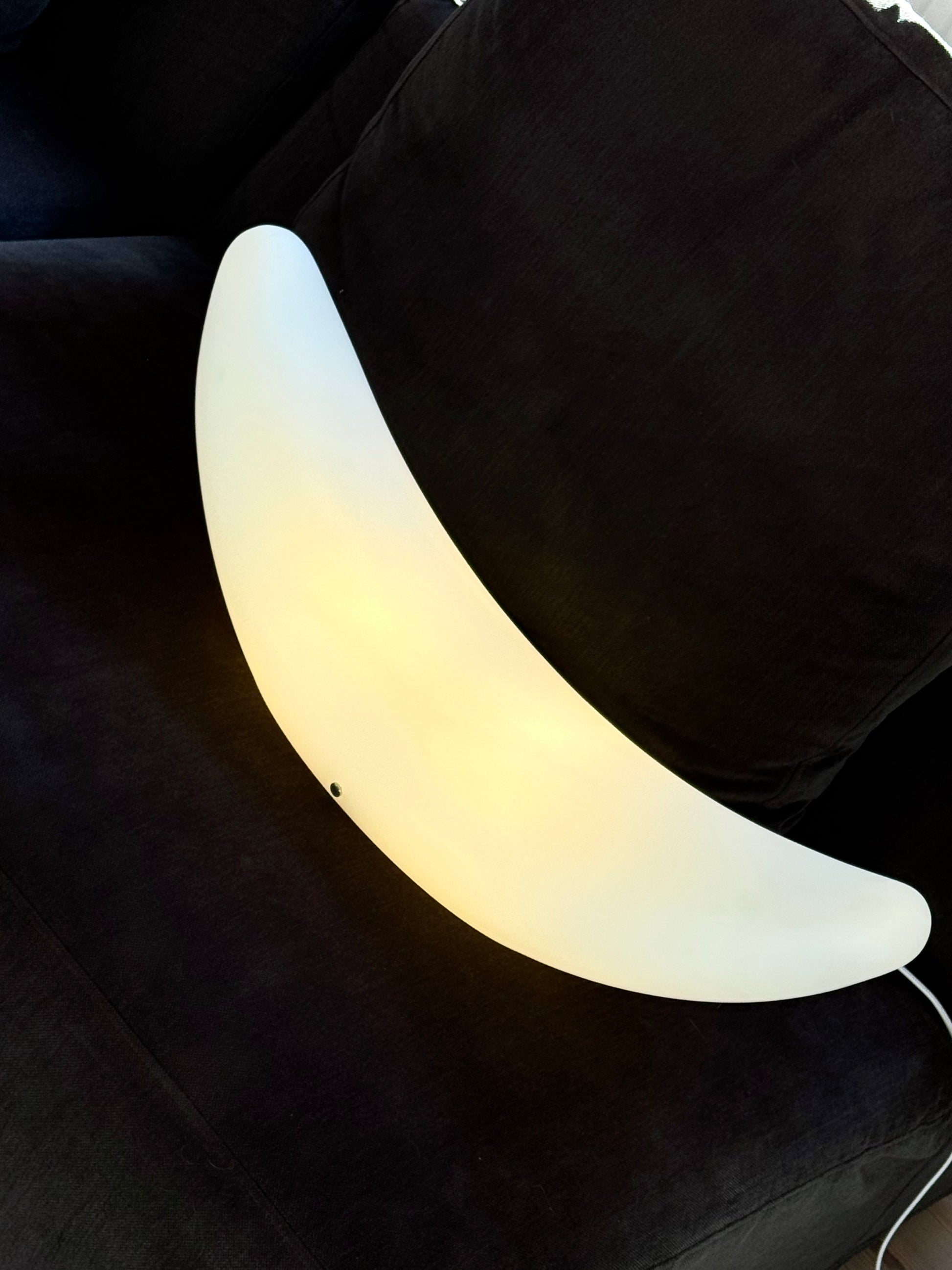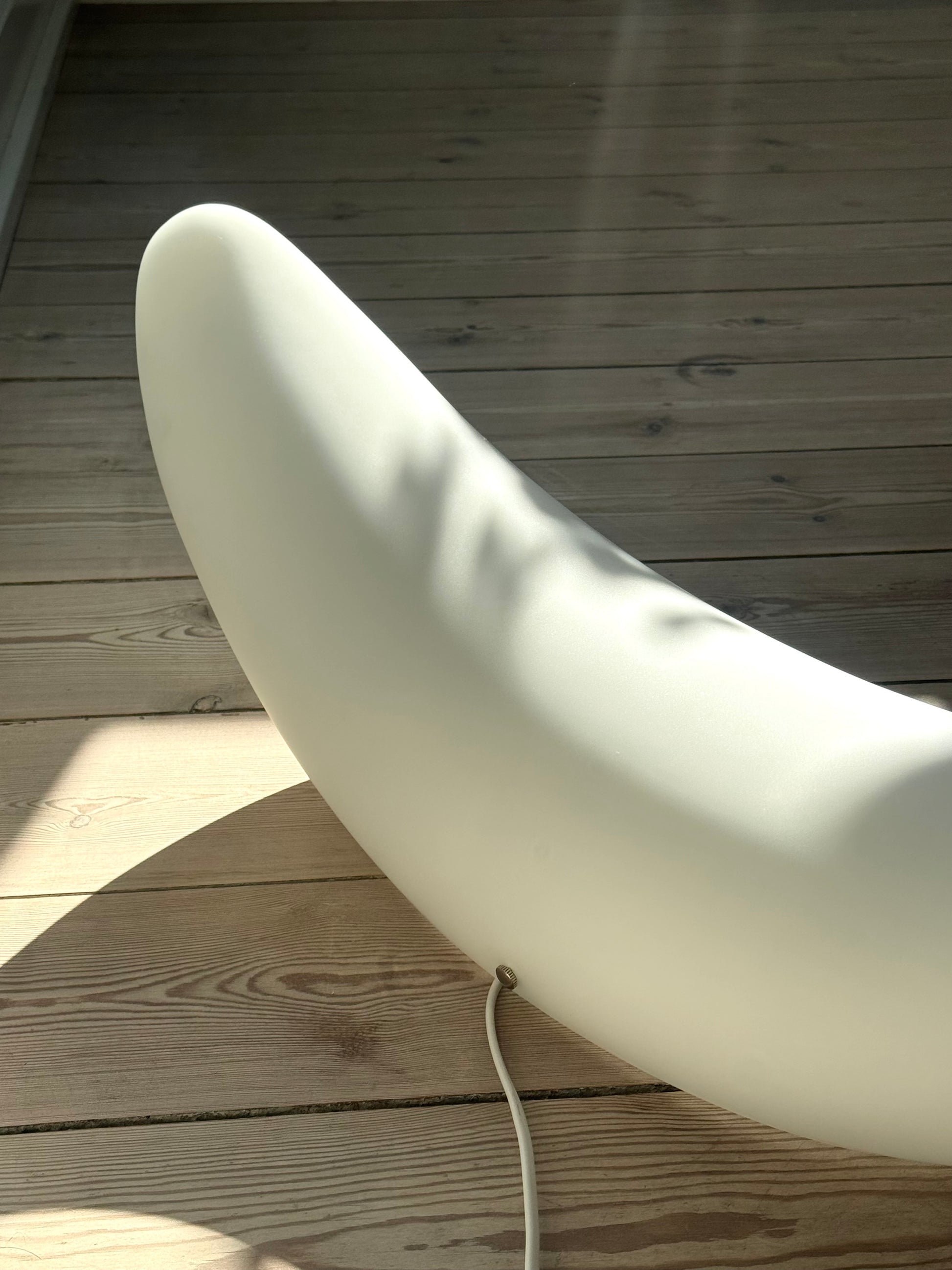 Foscarini Murano “Maui” wall or ceiling lamp, handcrafted in Italy, 1980. Made of white frosted glass in a beautiful organic moon shape. The lamp is in excellent condition and comes with a white steel base. An incredibly elegant and timeless design.
