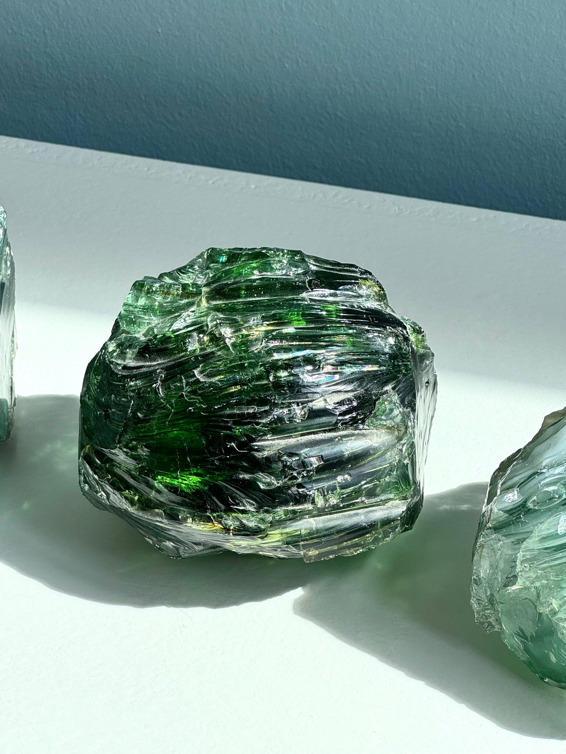 Stunning pieces of raw glass, in different shades of green. All Unique. Hides Small Stones and gems.