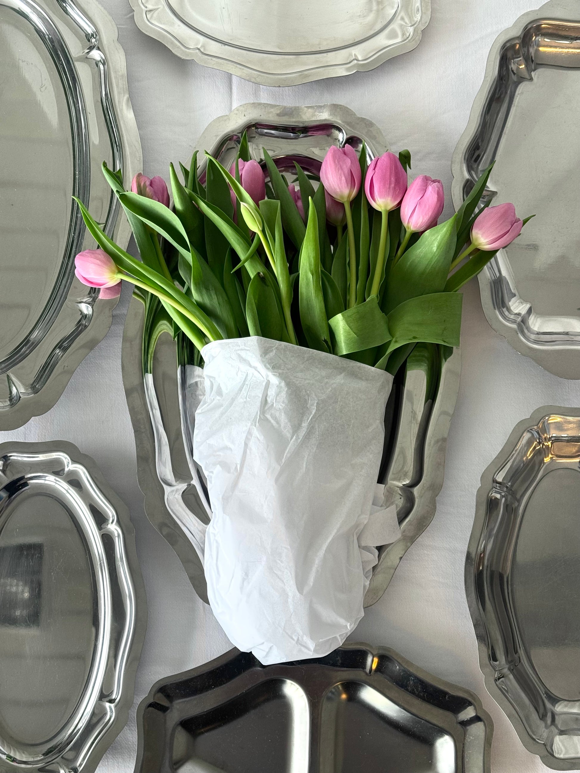 Elegant vintage stainless steel trays in graduating sizes, featuring a scalloped edge design. Perfect for serving, display, or as timeless kitchen decor.