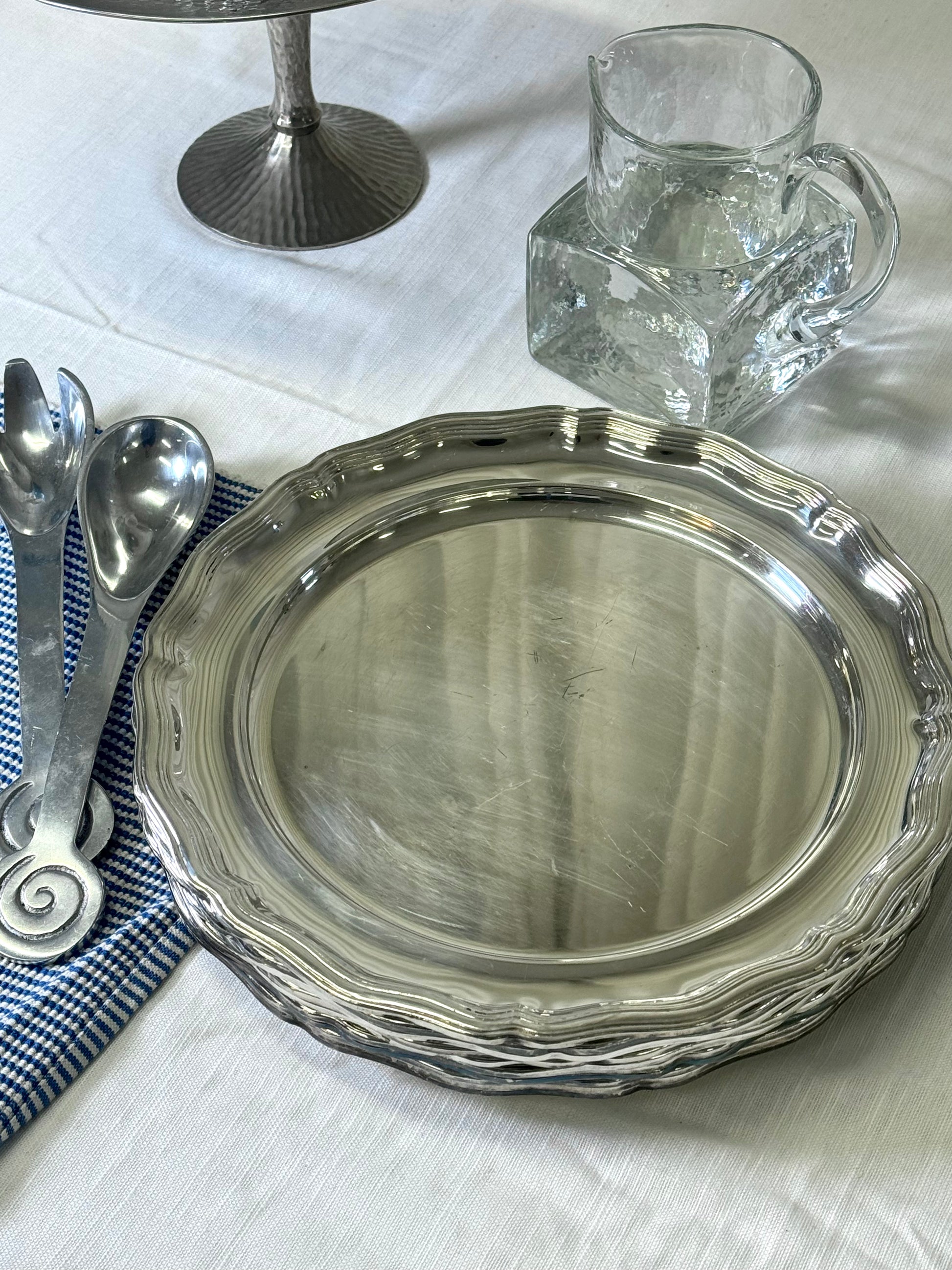 Ruffled silver pleated plates/dishes. Comes with signs of use. 10 available, price is for one.