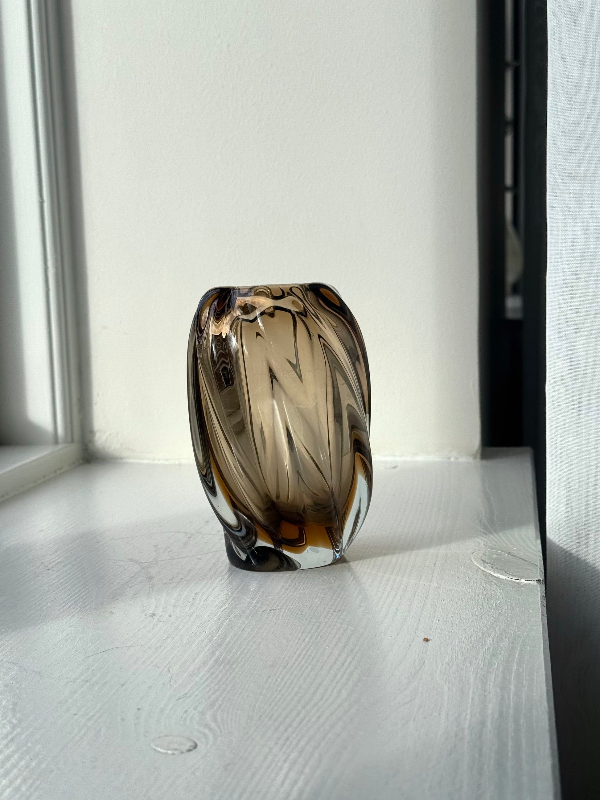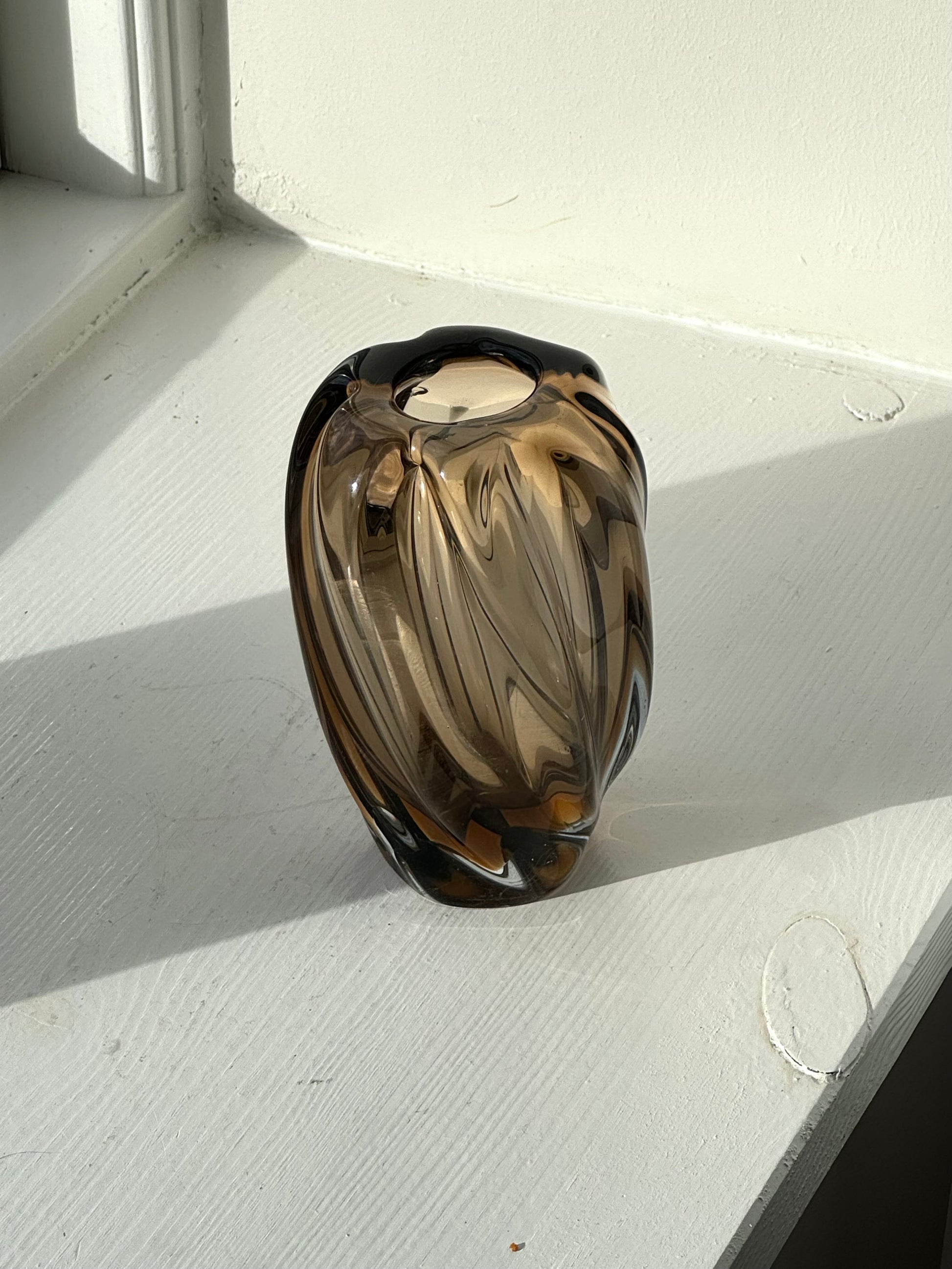Cute heavy vase, handmade in smoke coloured glass, with swirl details. Nice condition.