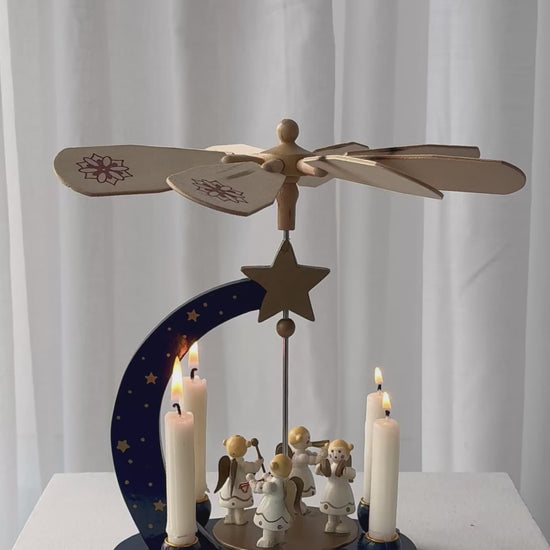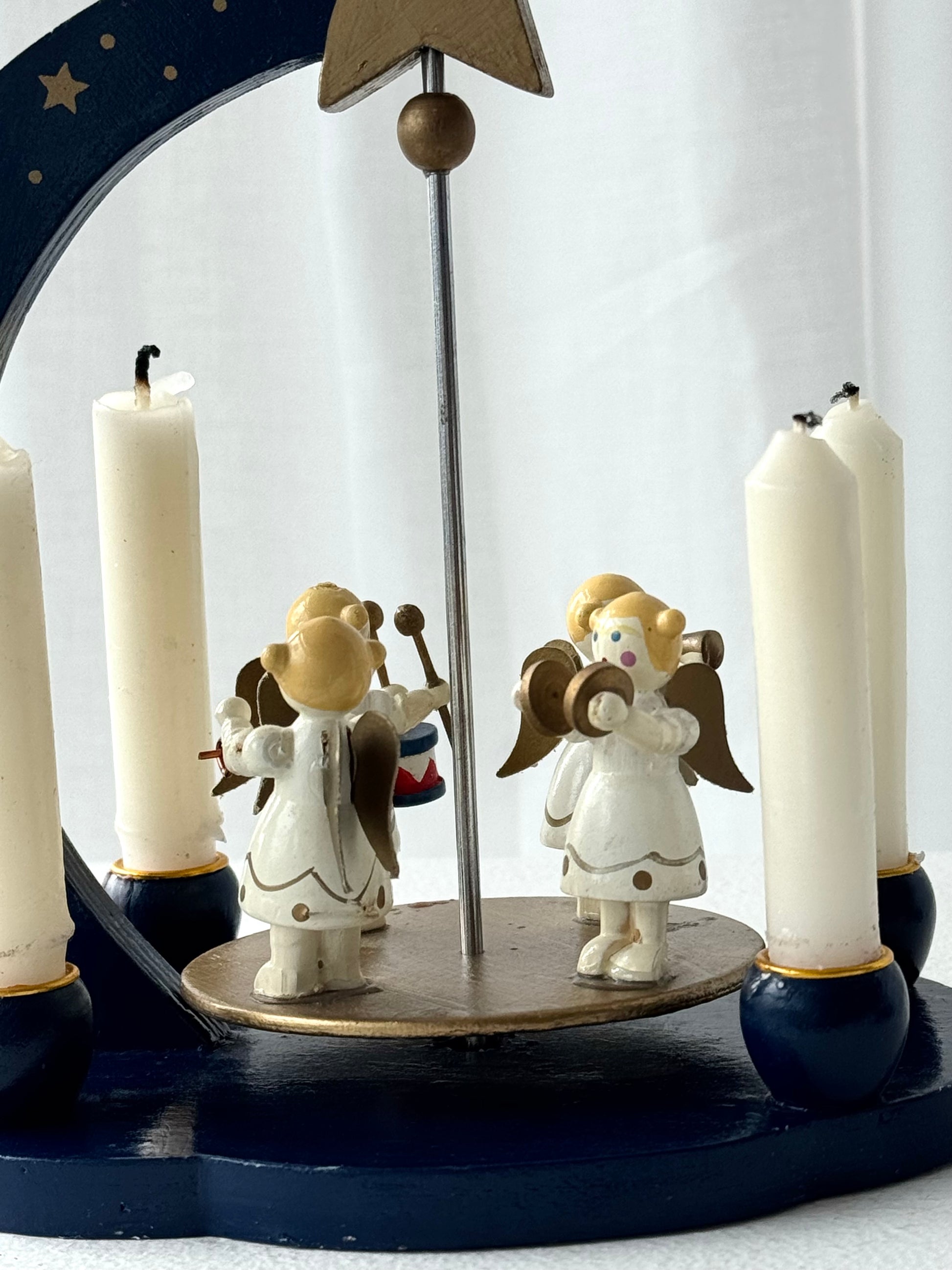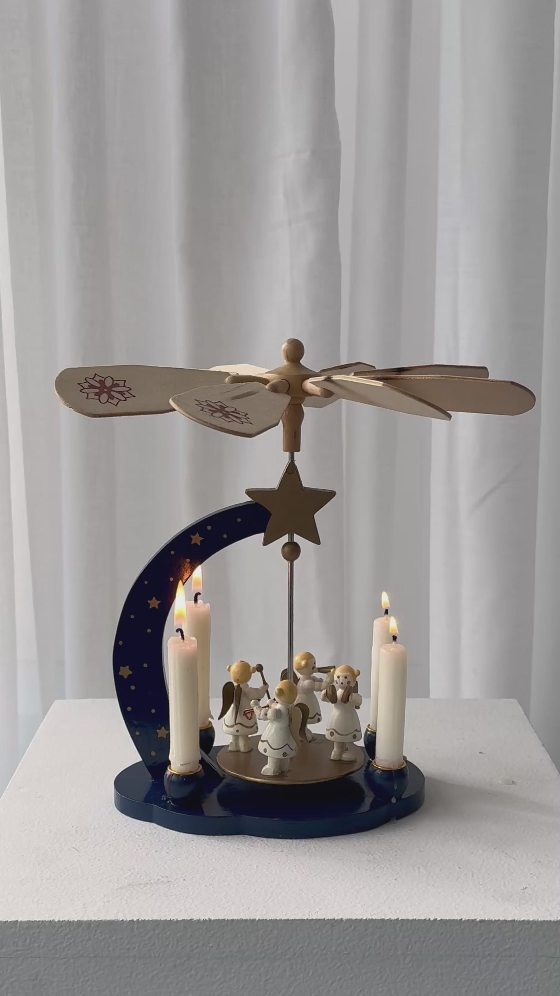 The loveliest dark blue pyramid with painted stars and a star on top. Four little angels dance when the heat makes the propeller spin. For taper candles.