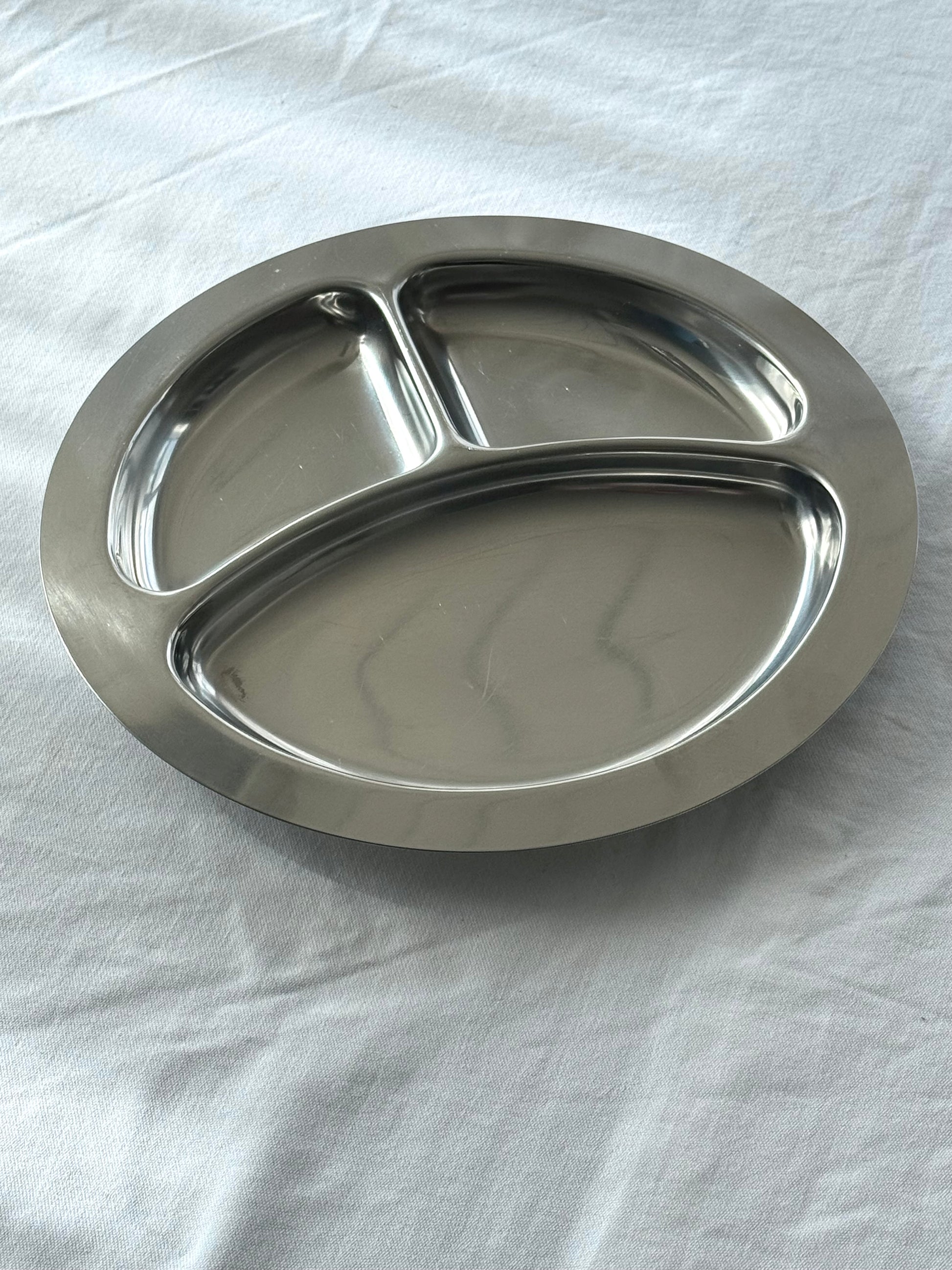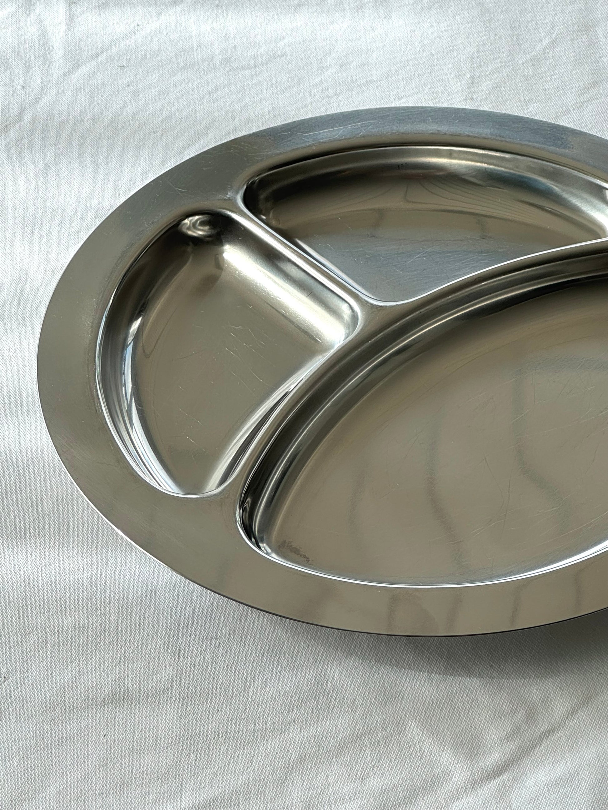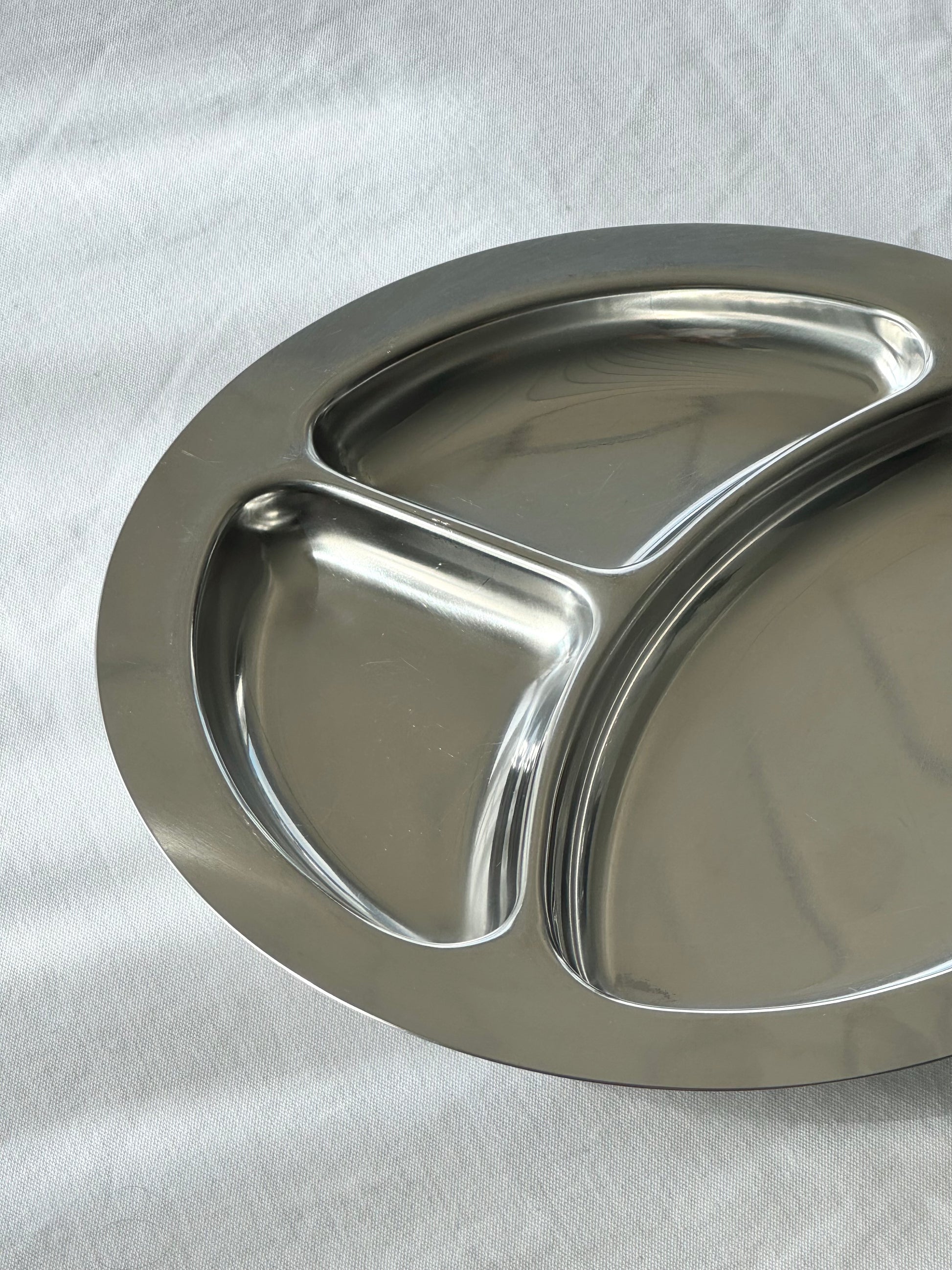 Nice stainless steel dish with devisions, sort and fine shapes. Nice vintage condition. Made in Denmark.