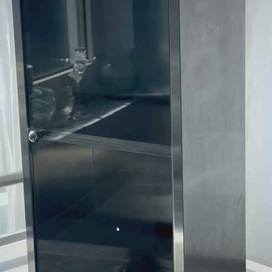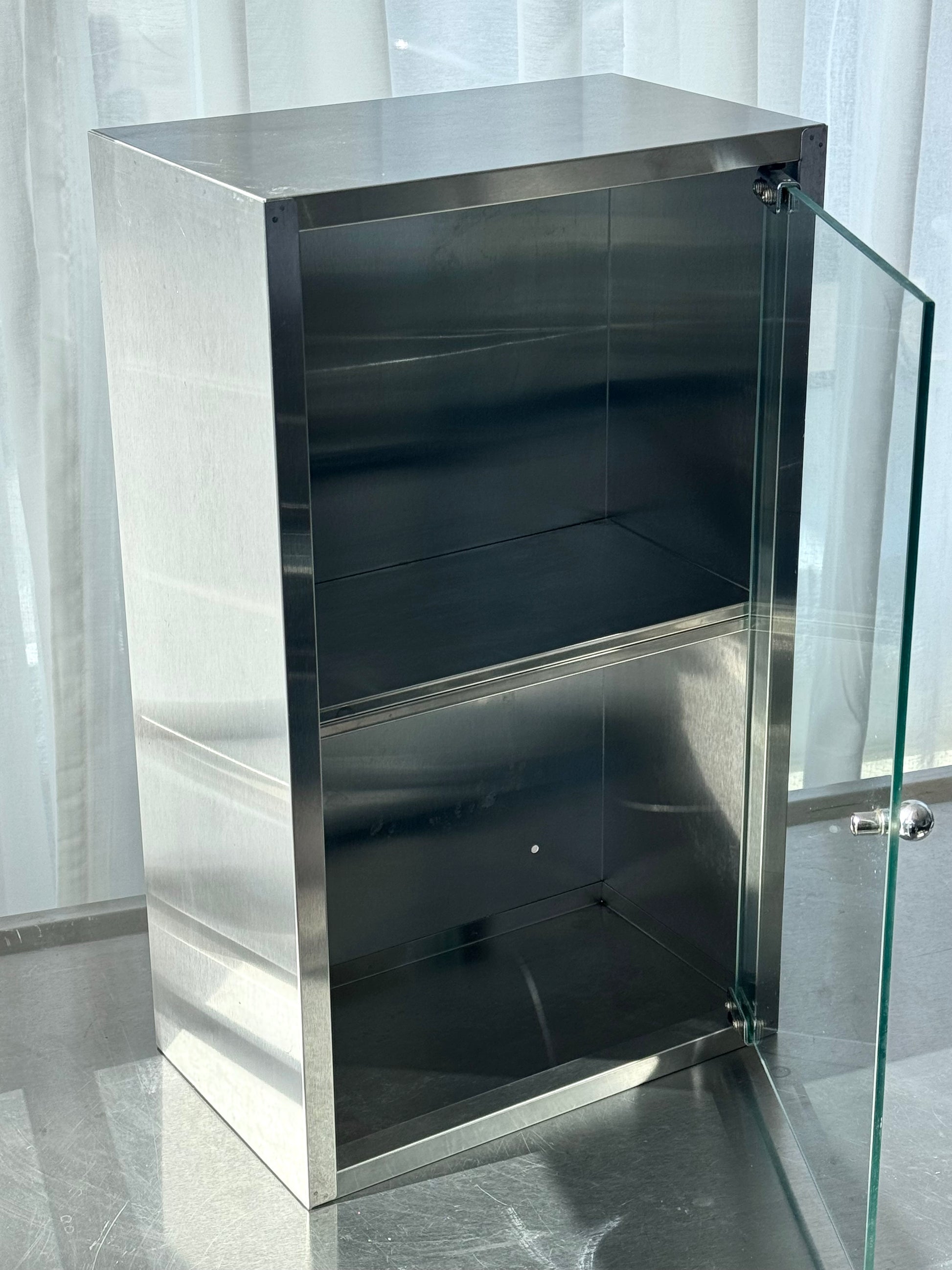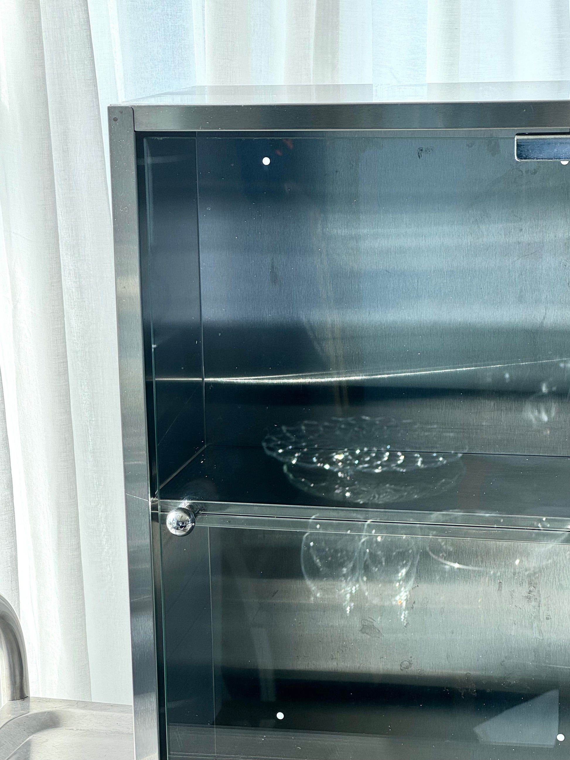 Vintage wall cabinet in brushed steel. Door in sturdy tempered glass with a cute little handle. Four holes on the back for hanging and one shelf inside. Shows signs of use, but in good condition.