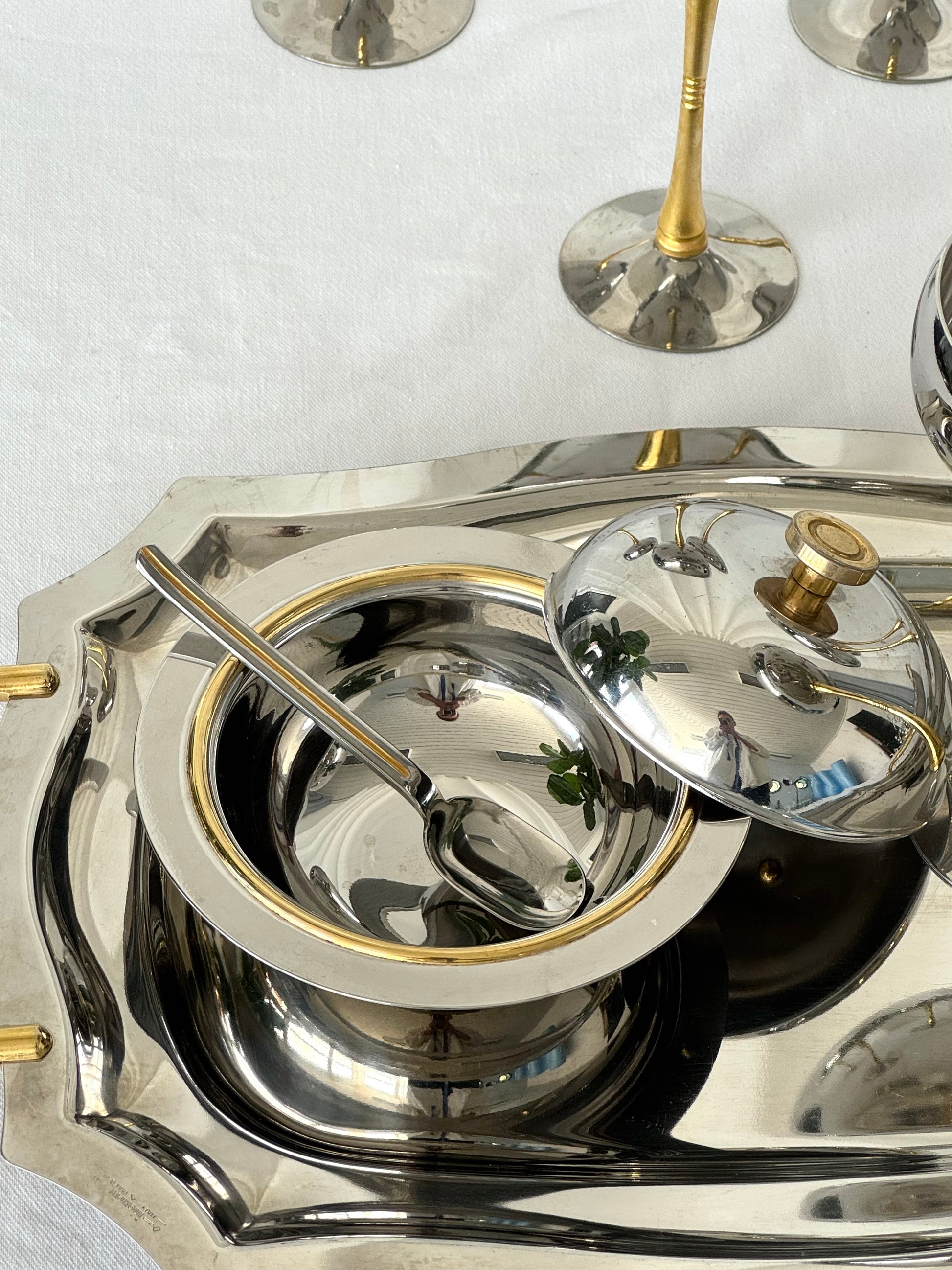 Cute Italian sugar bowl with brass detail, nice condition.