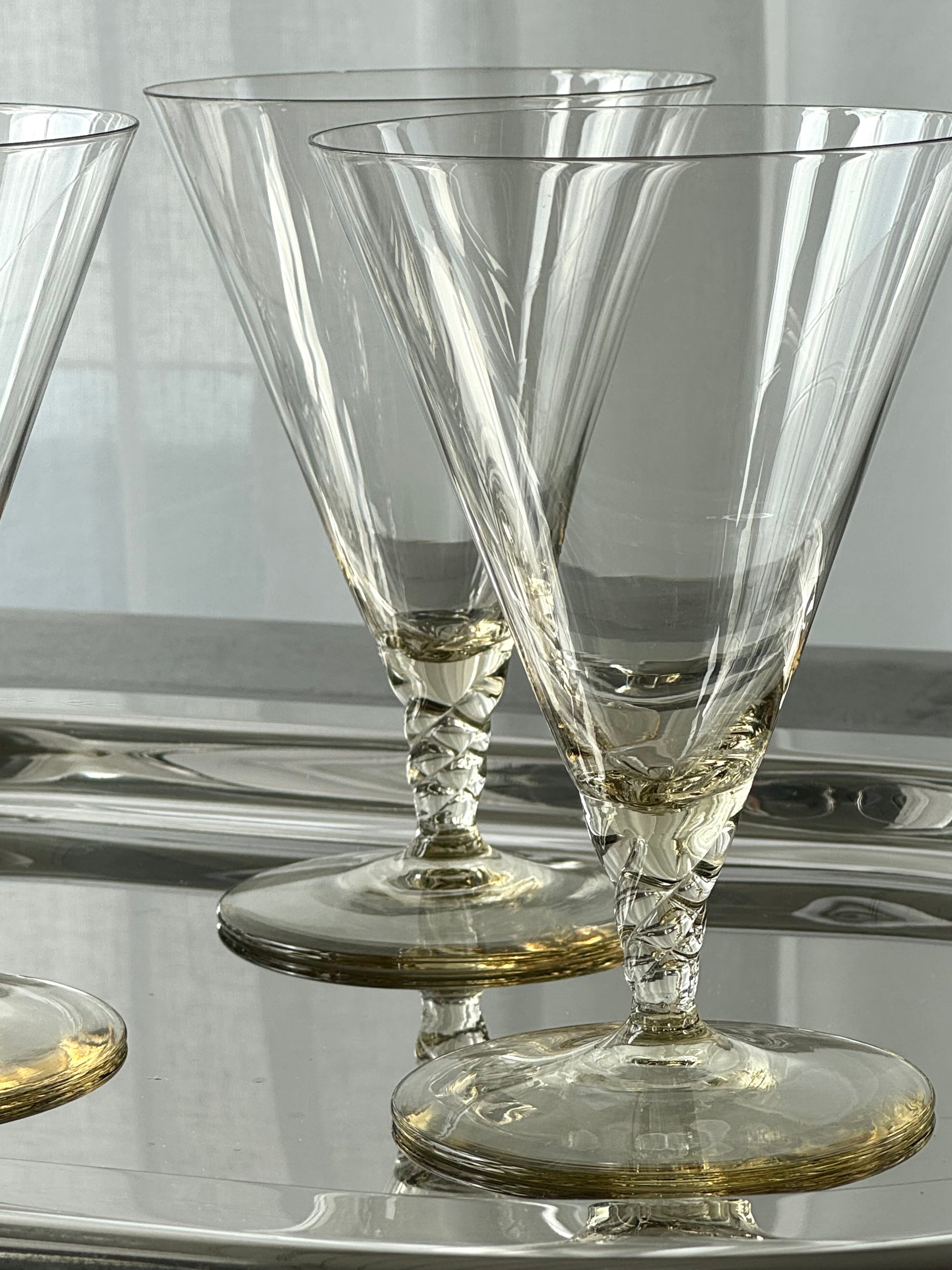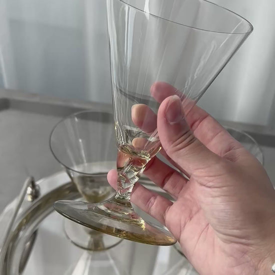 Stunning swirl stem cocktail glasses. The glass has a slightly yellow tinted color. One glass has tiny chip. 4 pieces sold together.