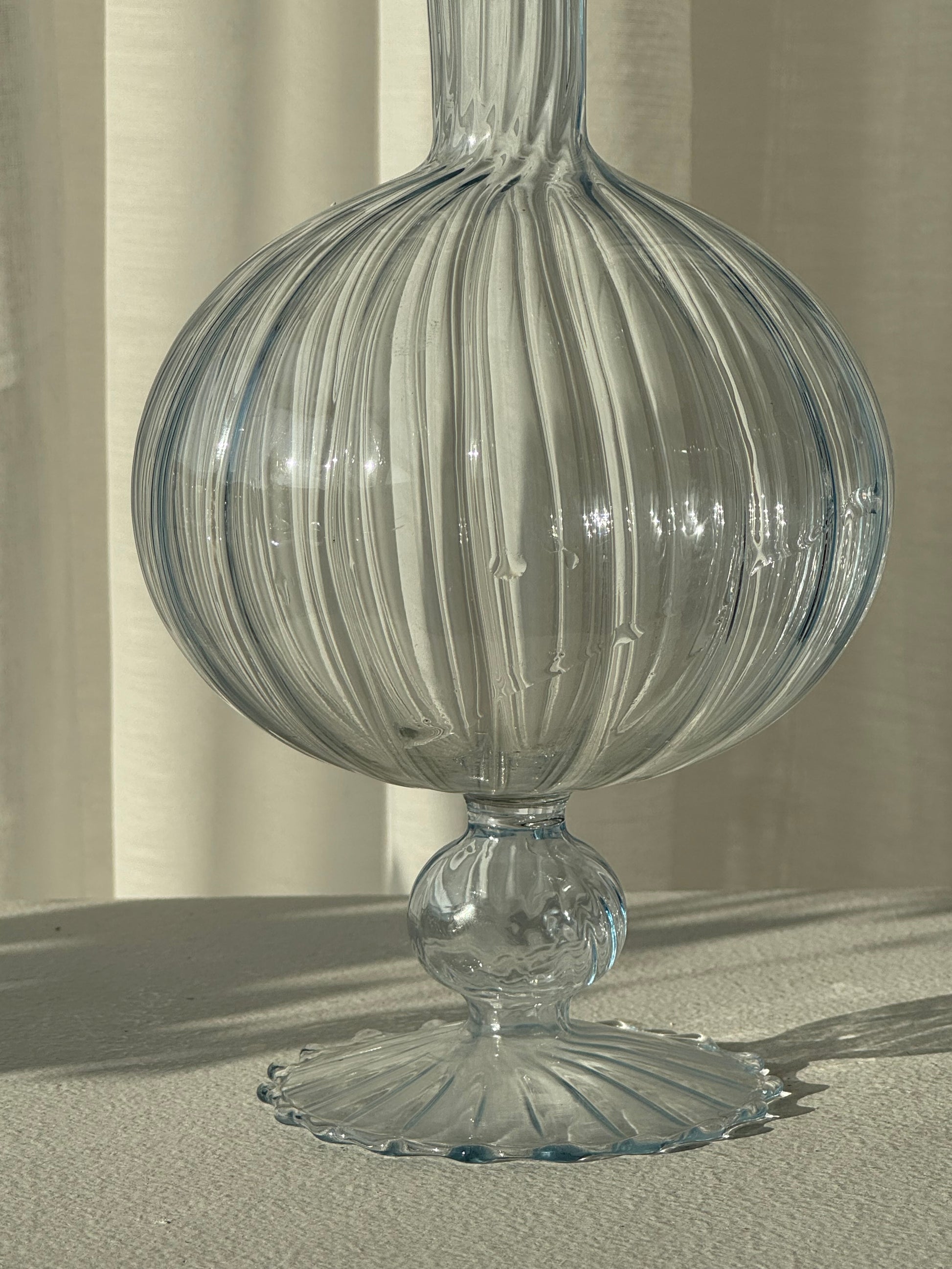 Beautiful blue vase on a swirling caramel foot. Handmade in italy. Very nice condition.