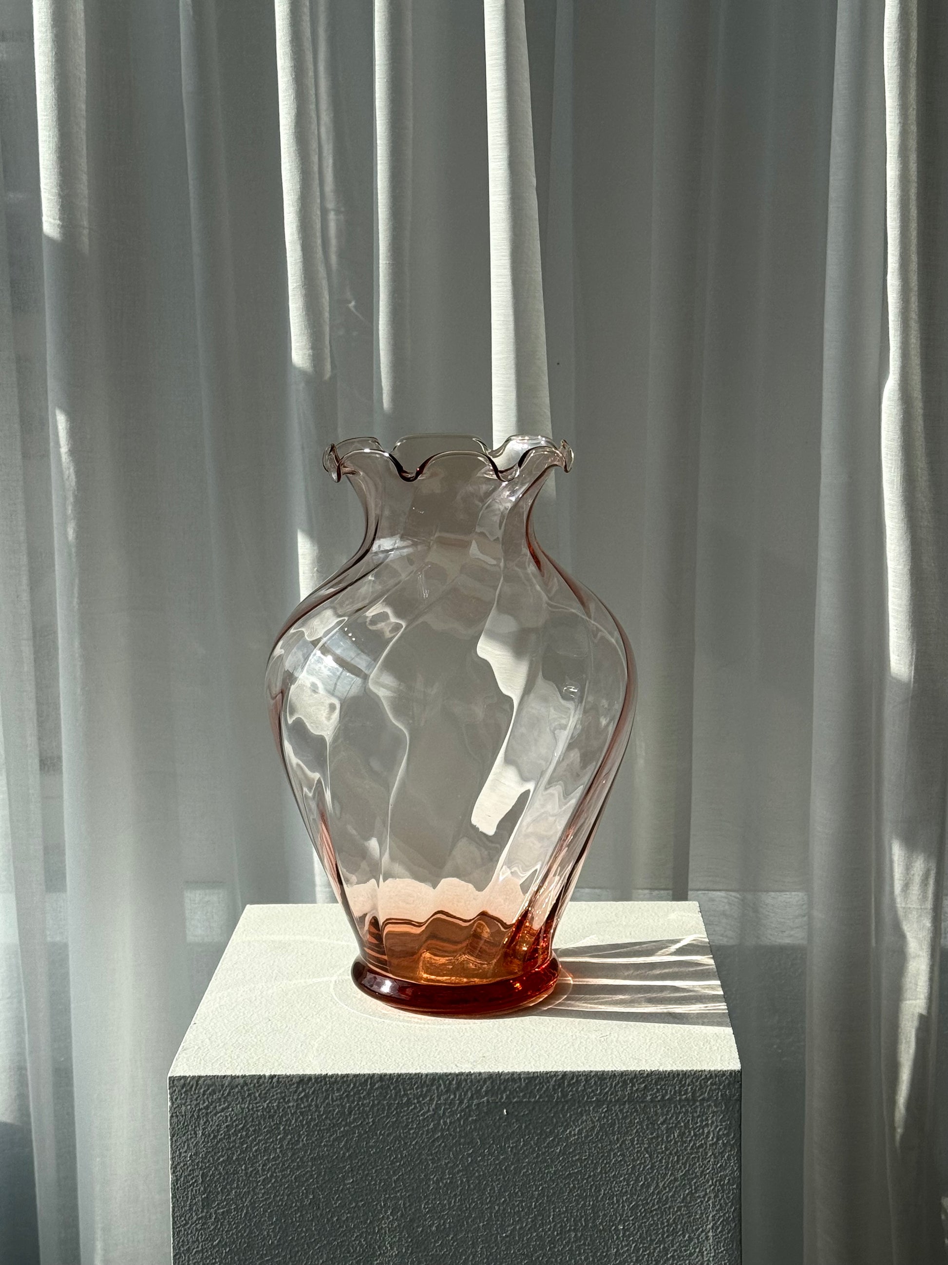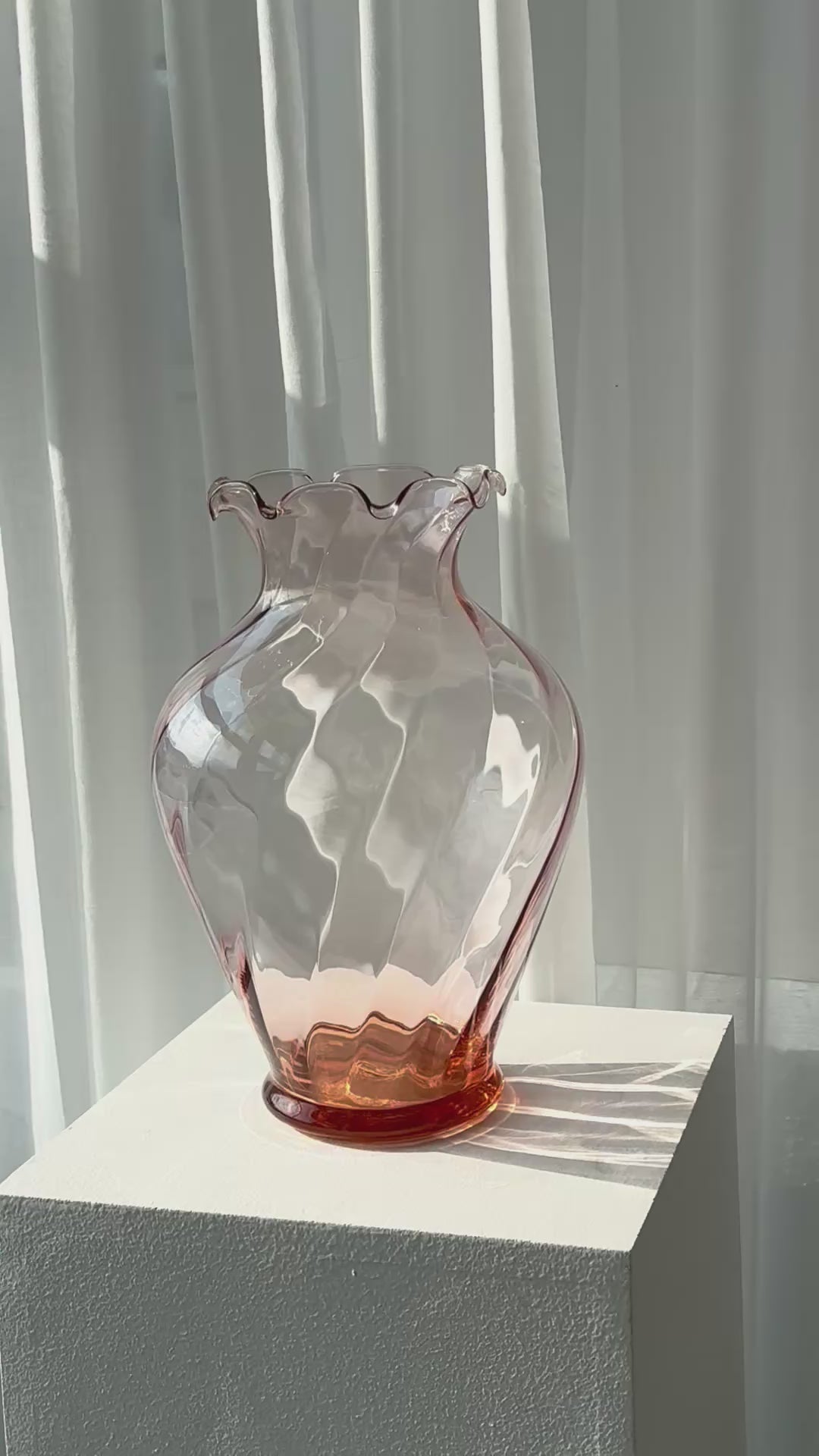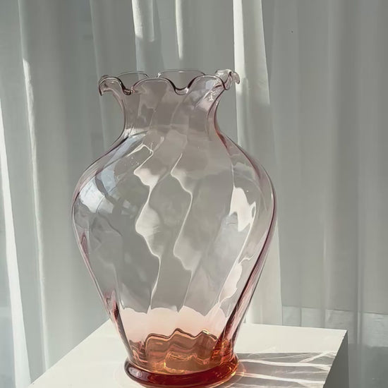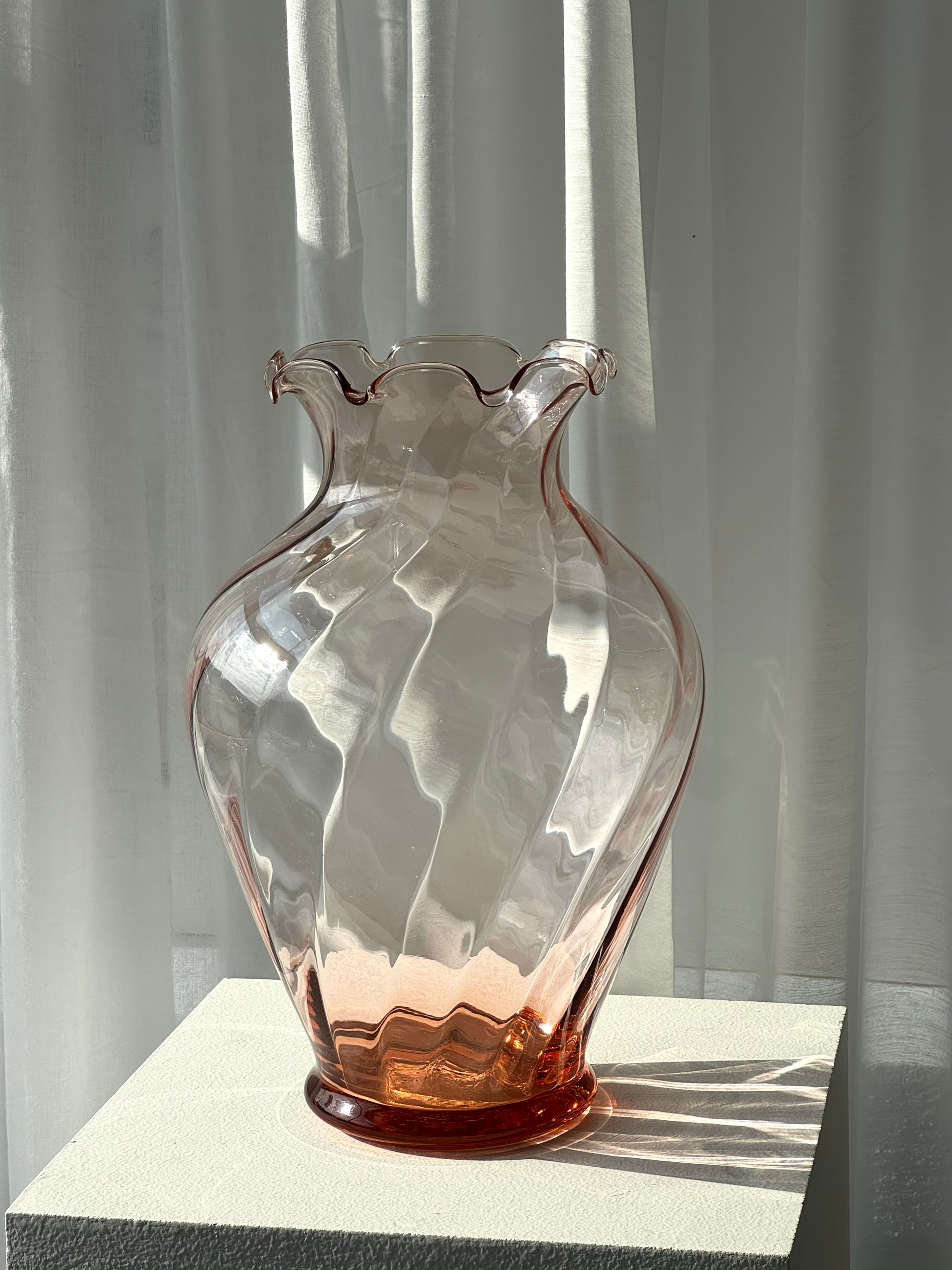 Large and beautiful swirling vase. Delicate ruffled details at the top, crafted from heavy handmade pink glass. Excellent condition.