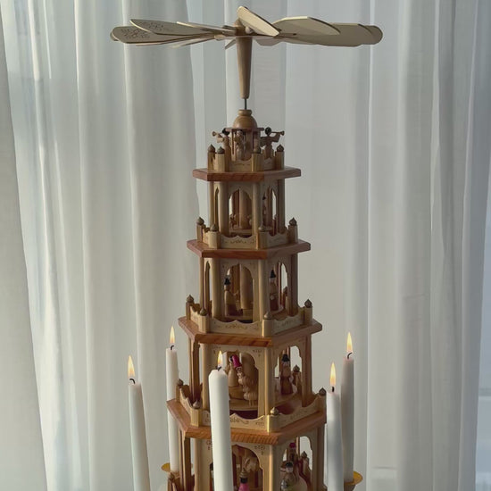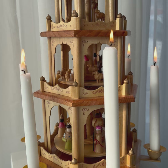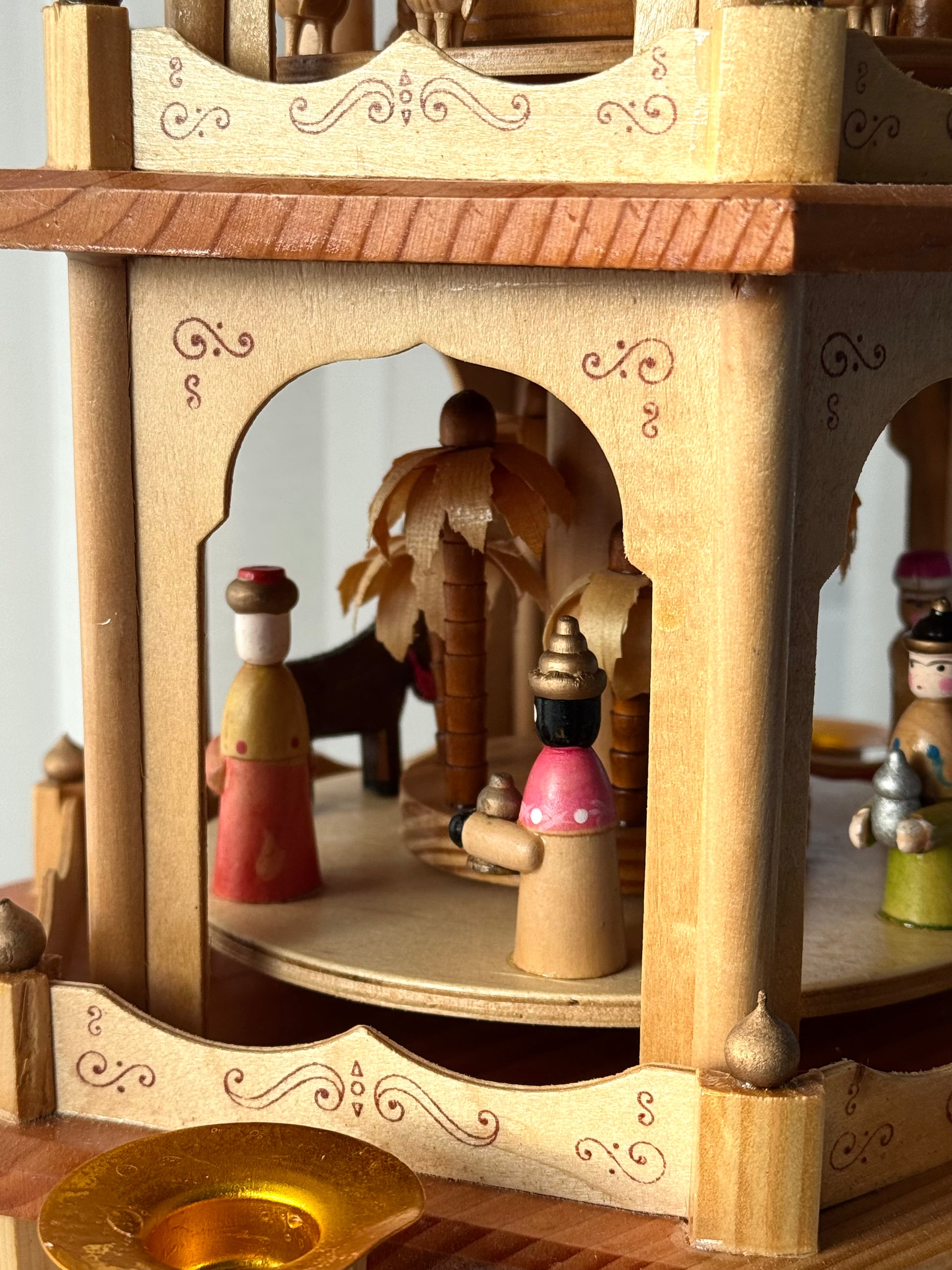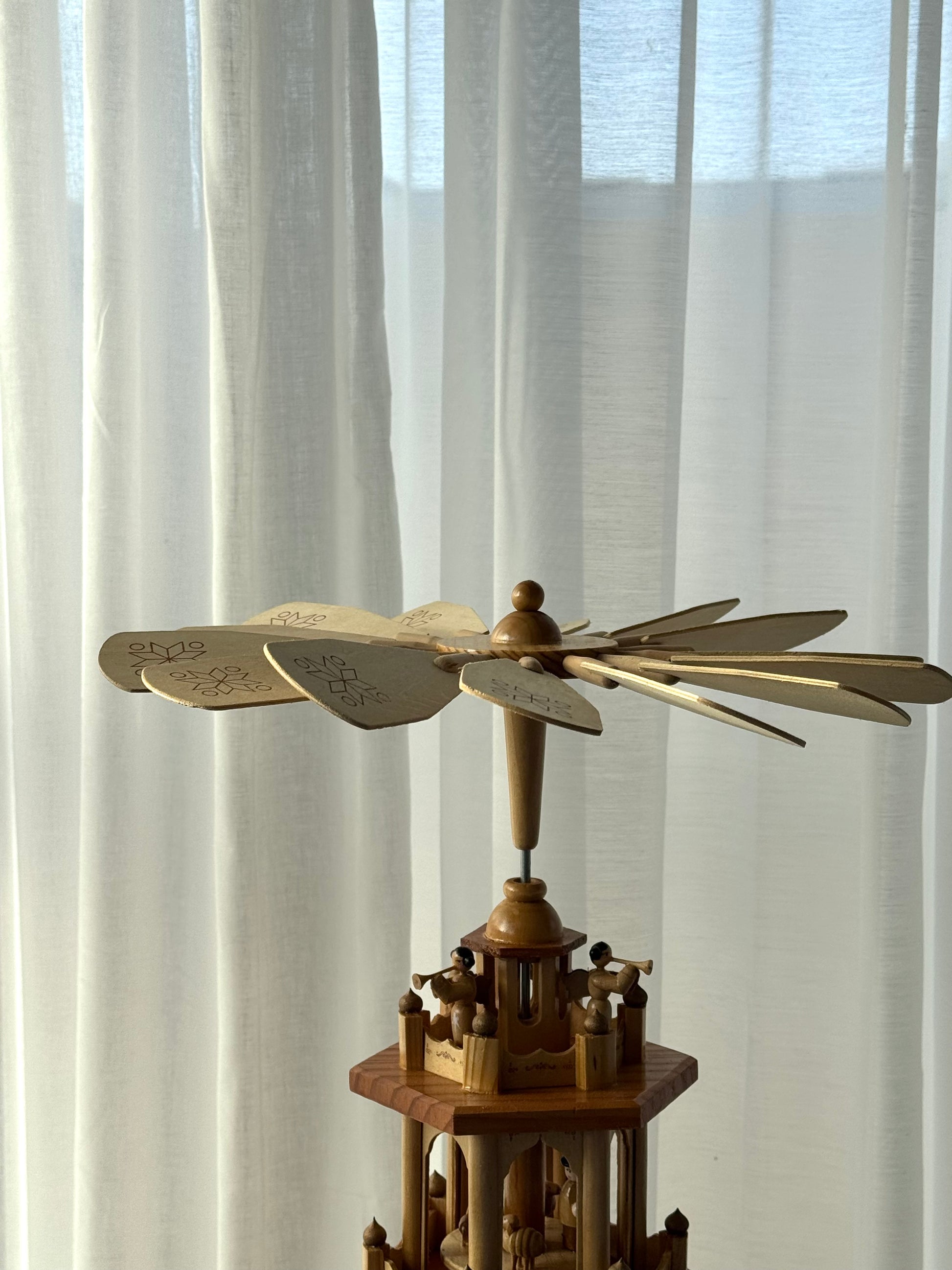 Please note: All pyramids are handmade and either vintage or antique. Minor imperfections, scratches, or signs of age may occur. No figures are missing, and the pyramid spins as it should. However, the wings or other parts may occasionally need a little adjustment to help it start turning. Should any issues arise, you are always welcome to contact me for assistance.