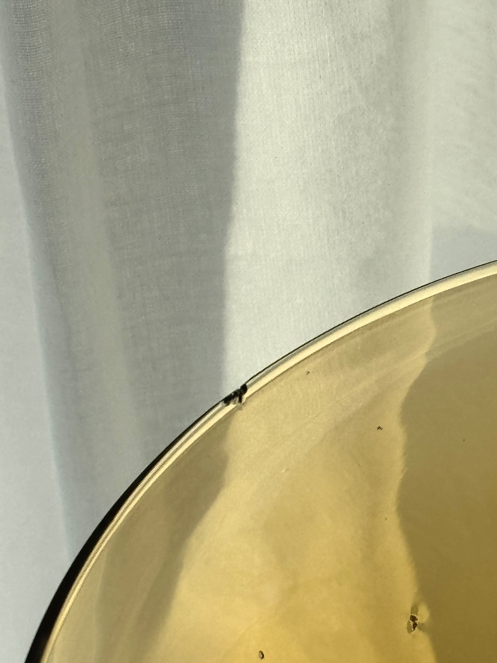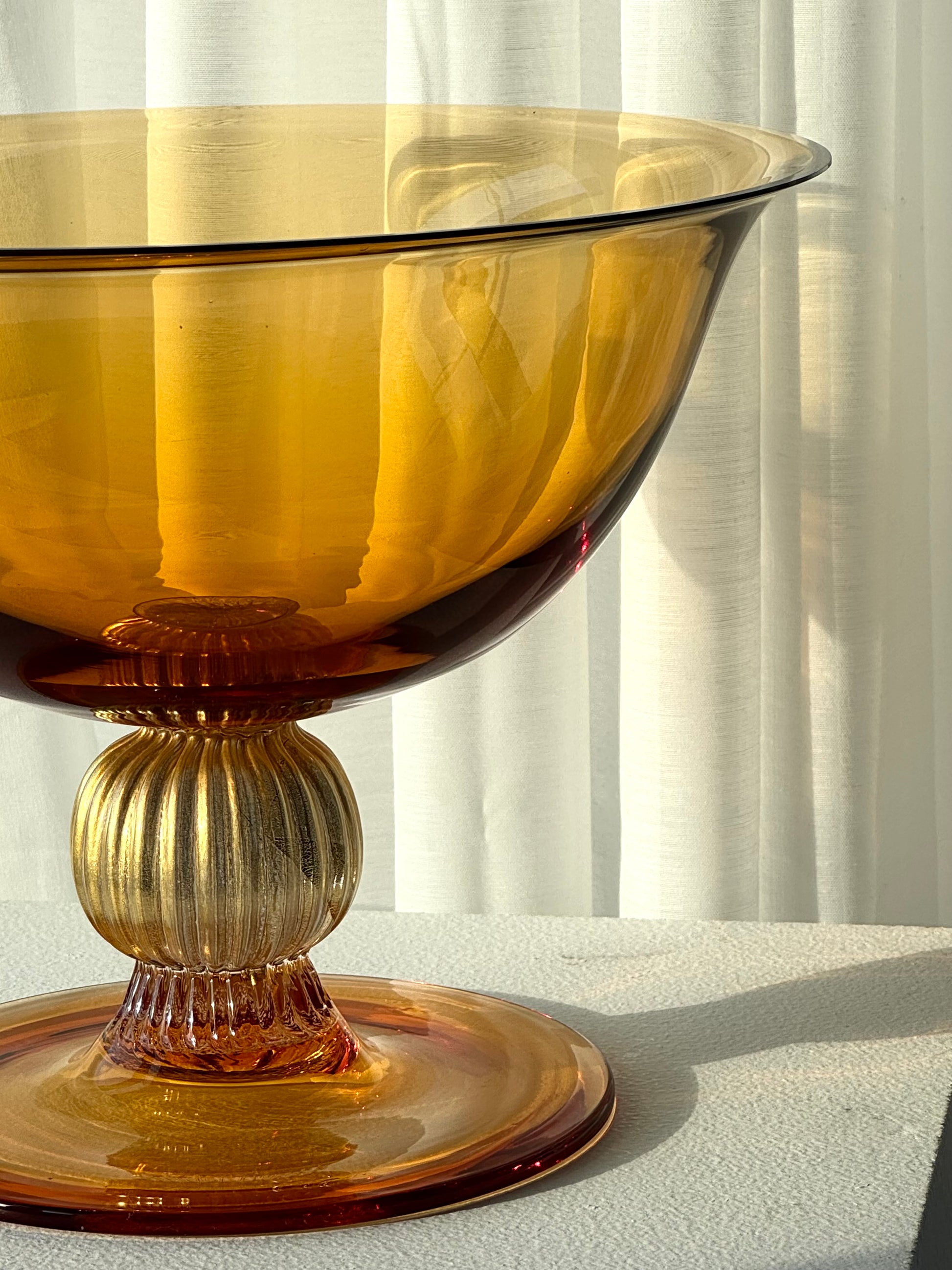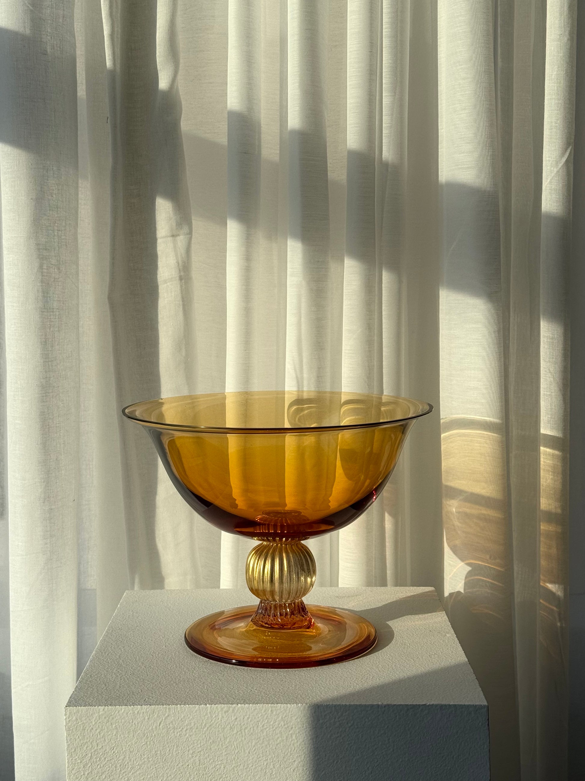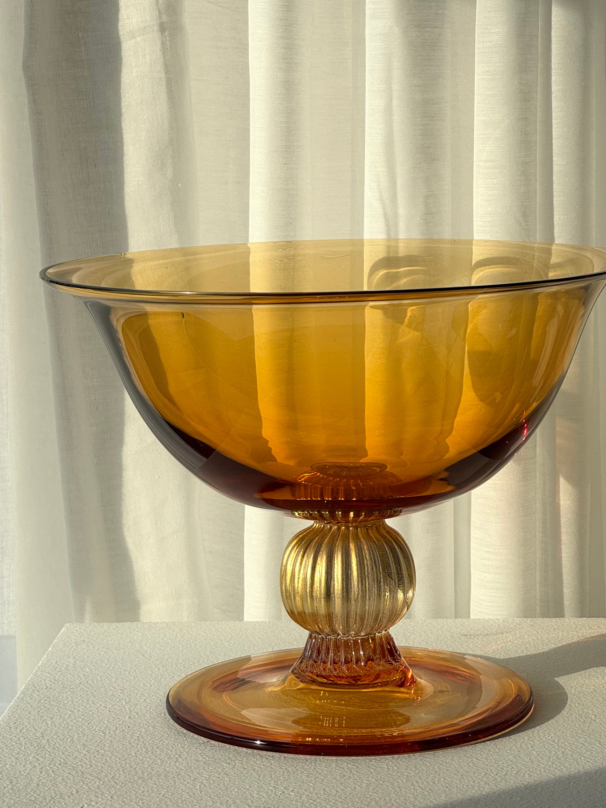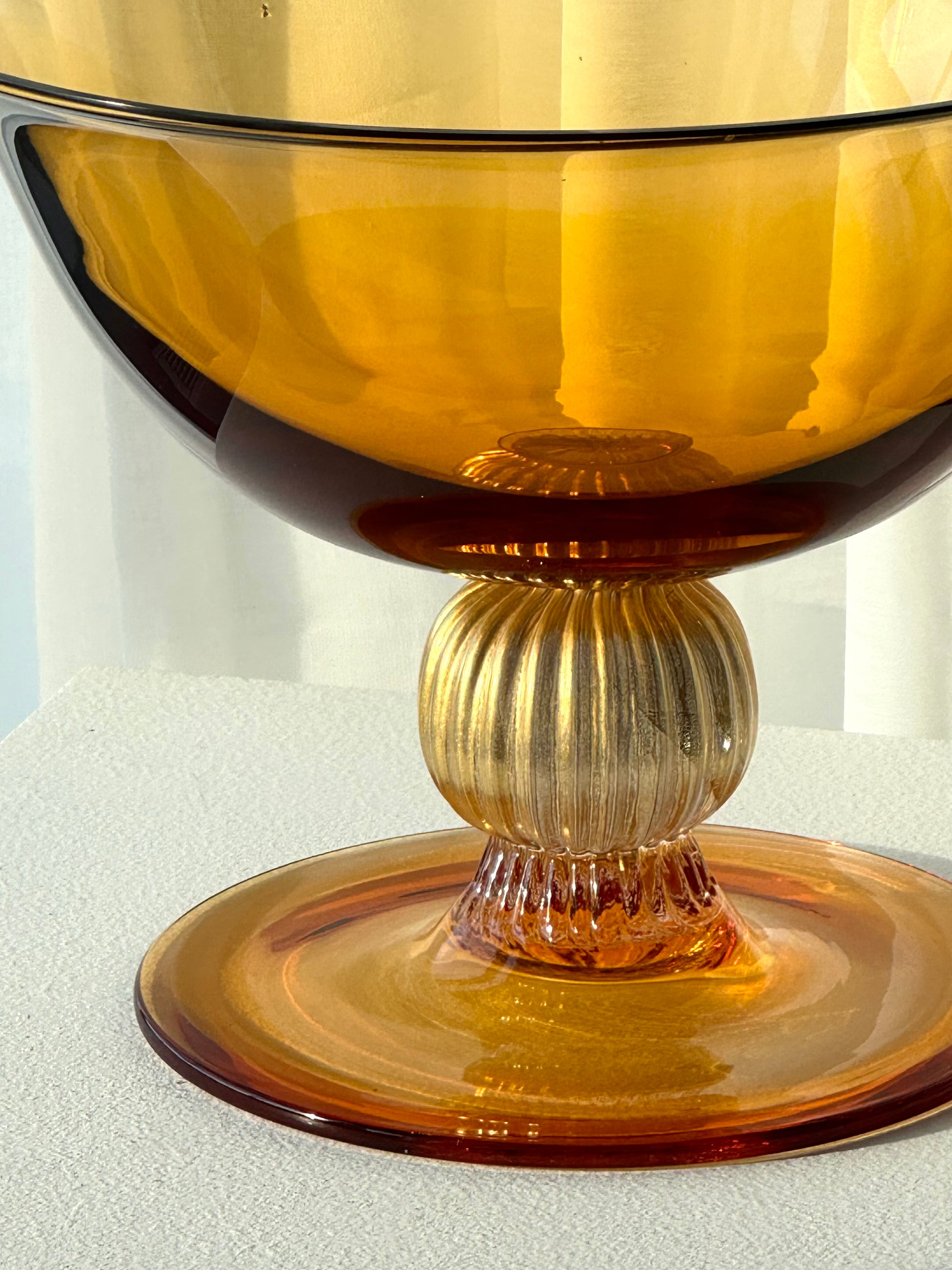 Fantastic handmade pedestal bowl. Brownish glass with small irregularities and air bubbles. The base features a finely detailed spherical shape. Has a small nick on the rim, otherwise in very good condition.