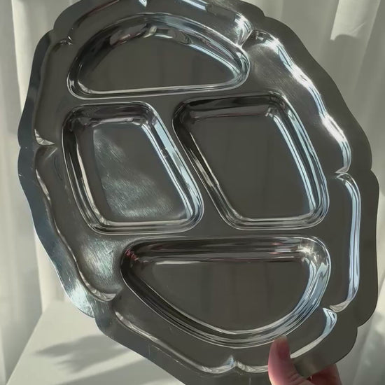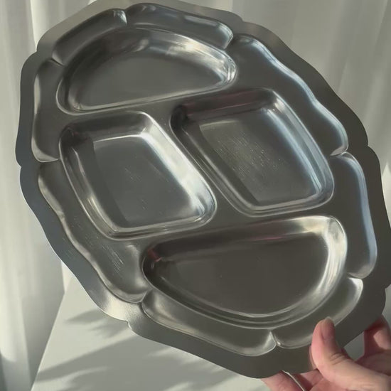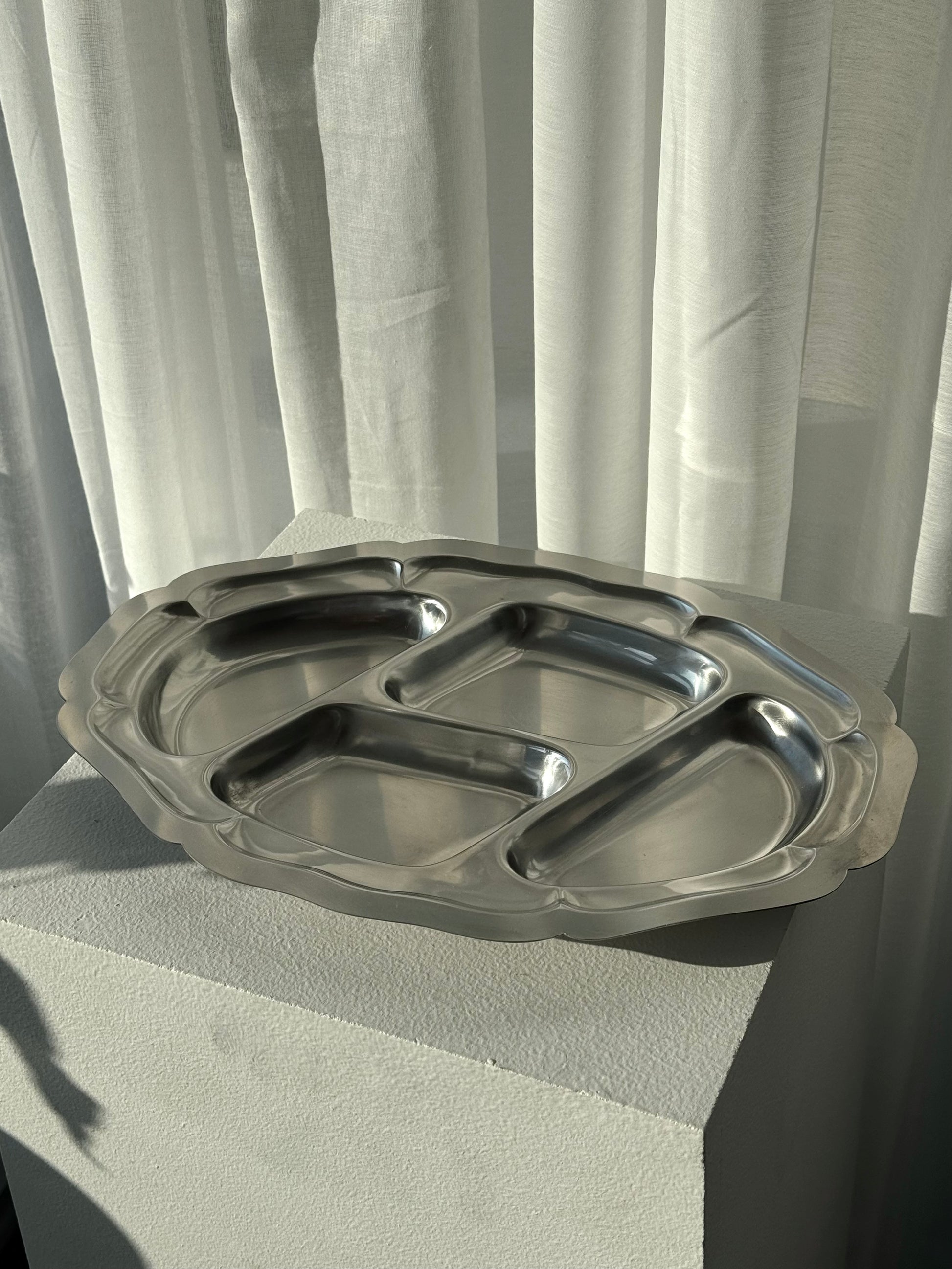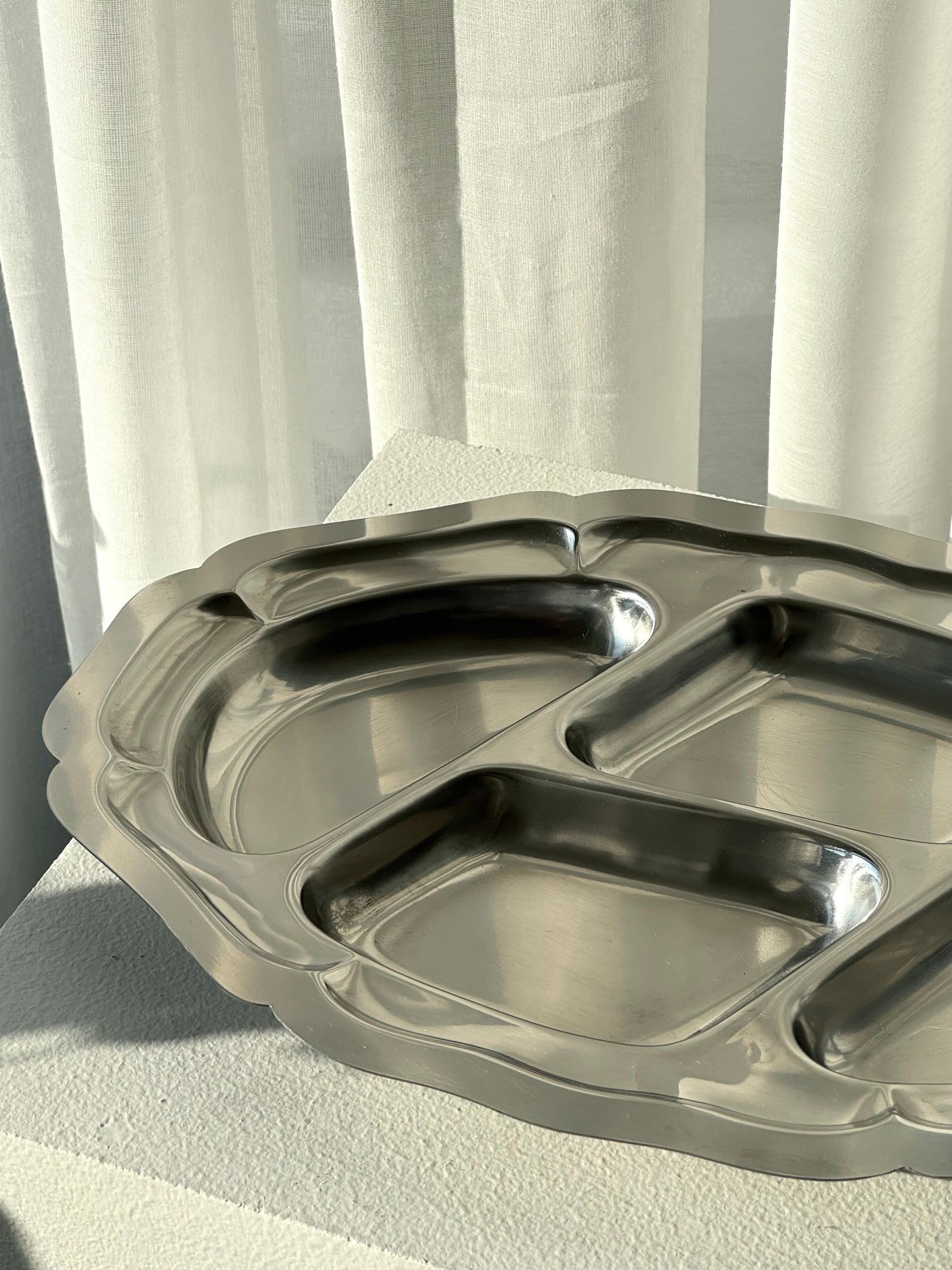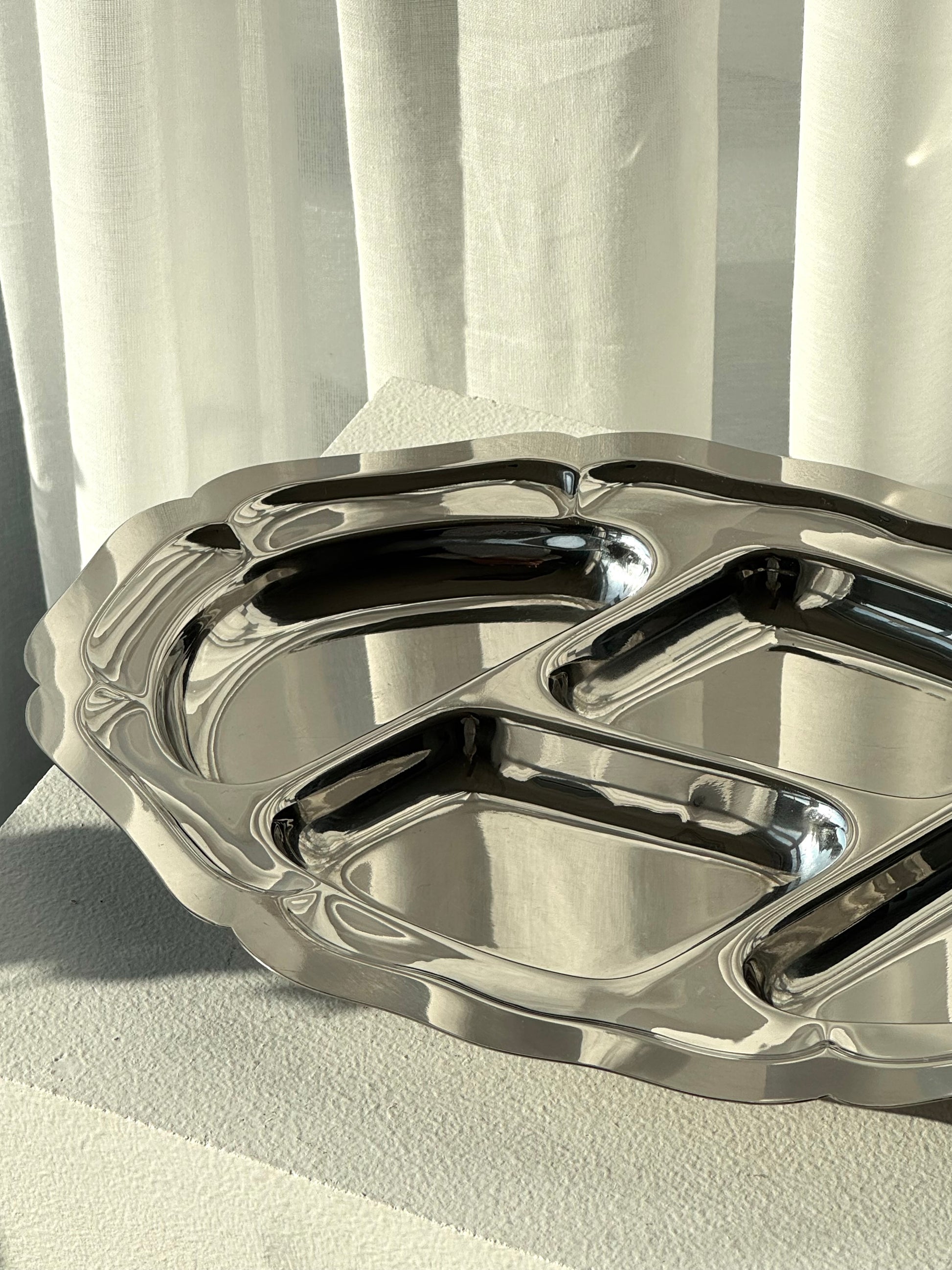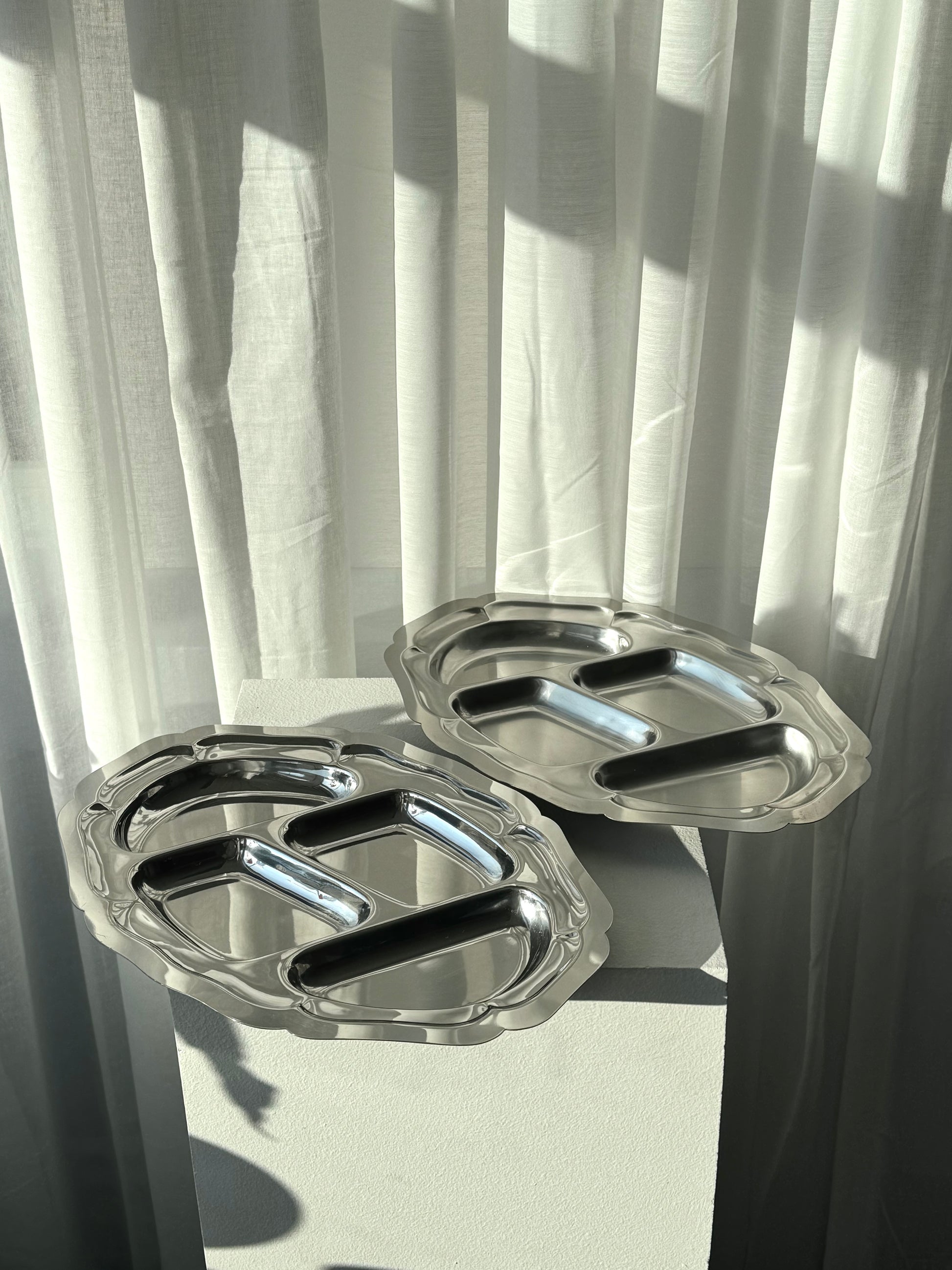 Beautiful Inox dishes with divisions. Ruffled edges with soft divided details. One shiny and one matte. Price is for one.