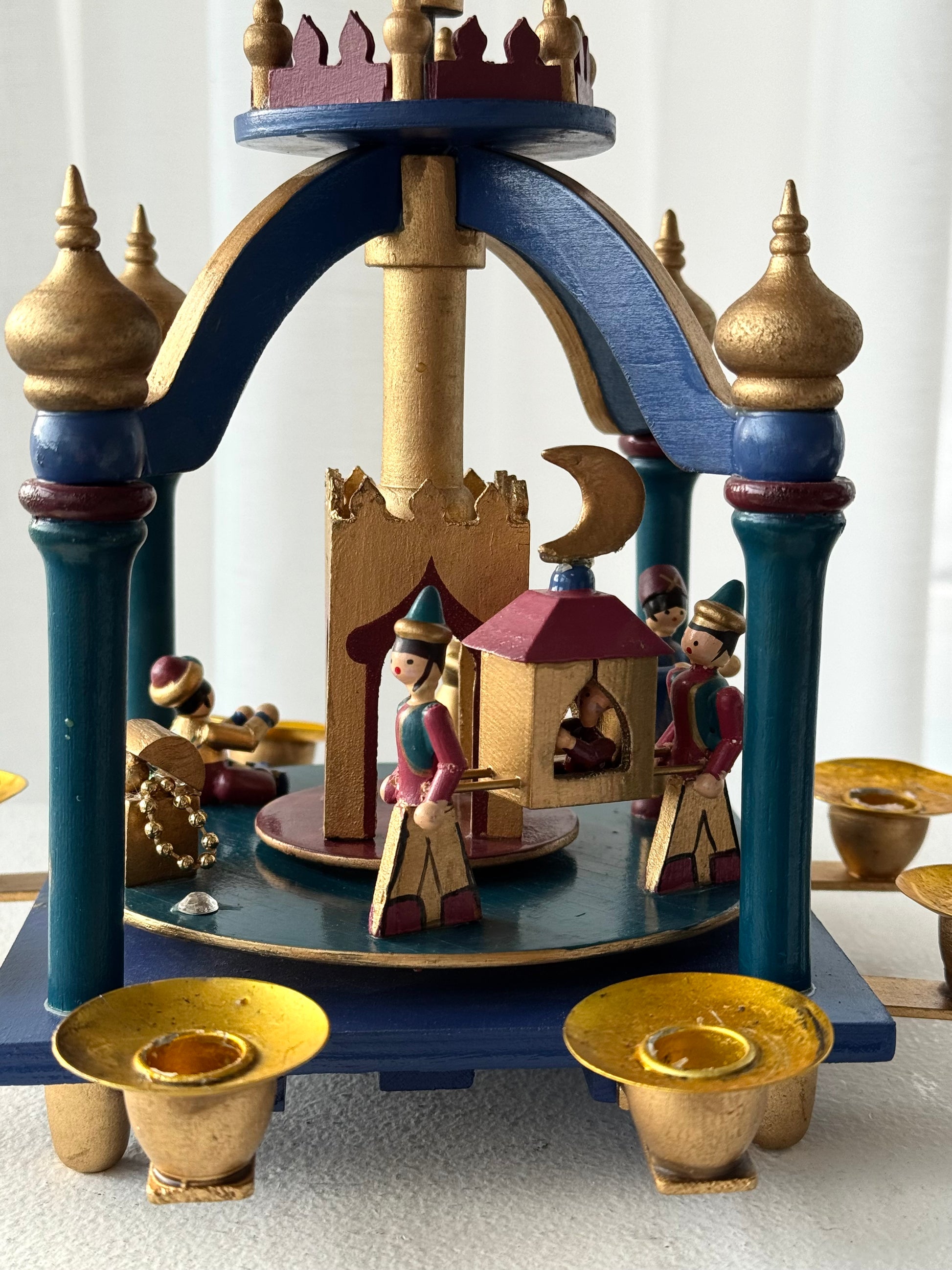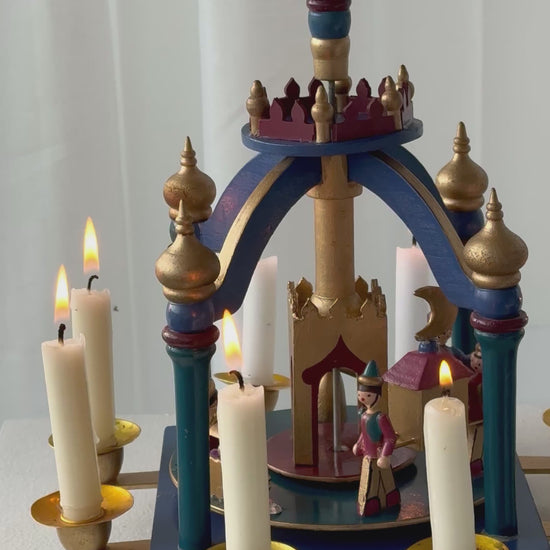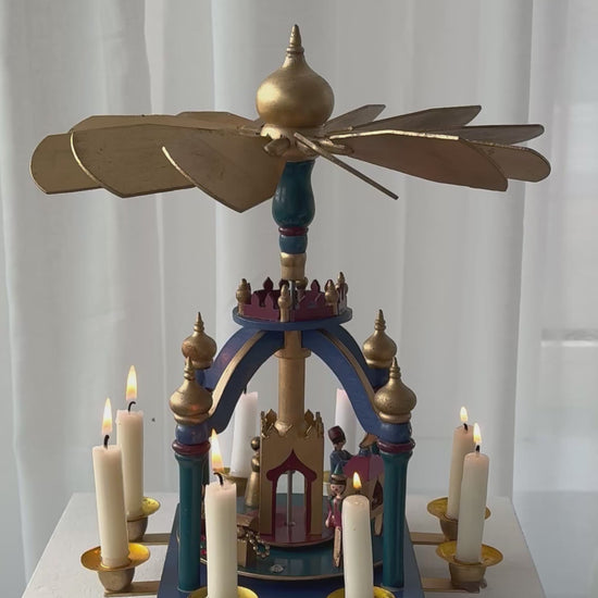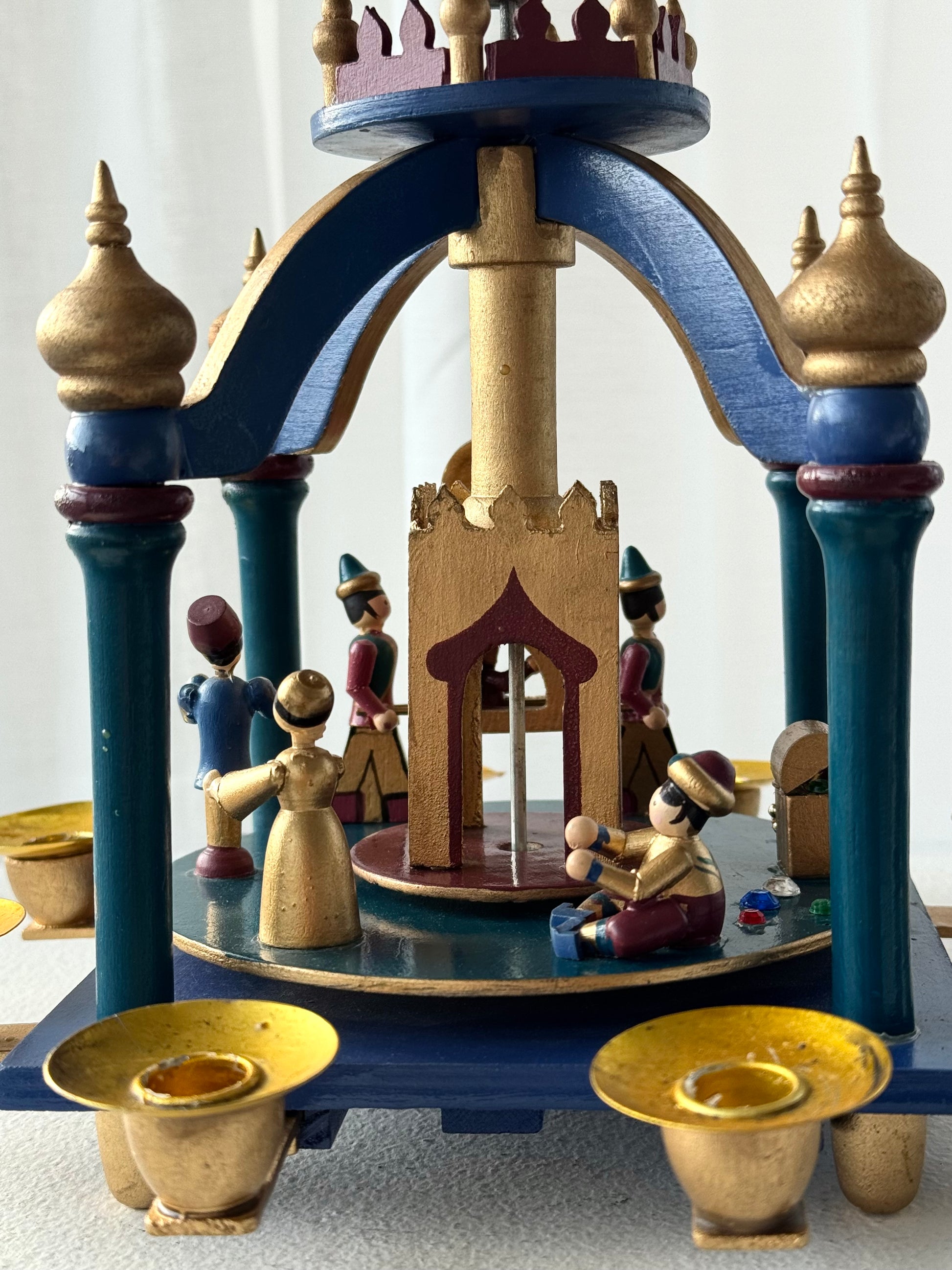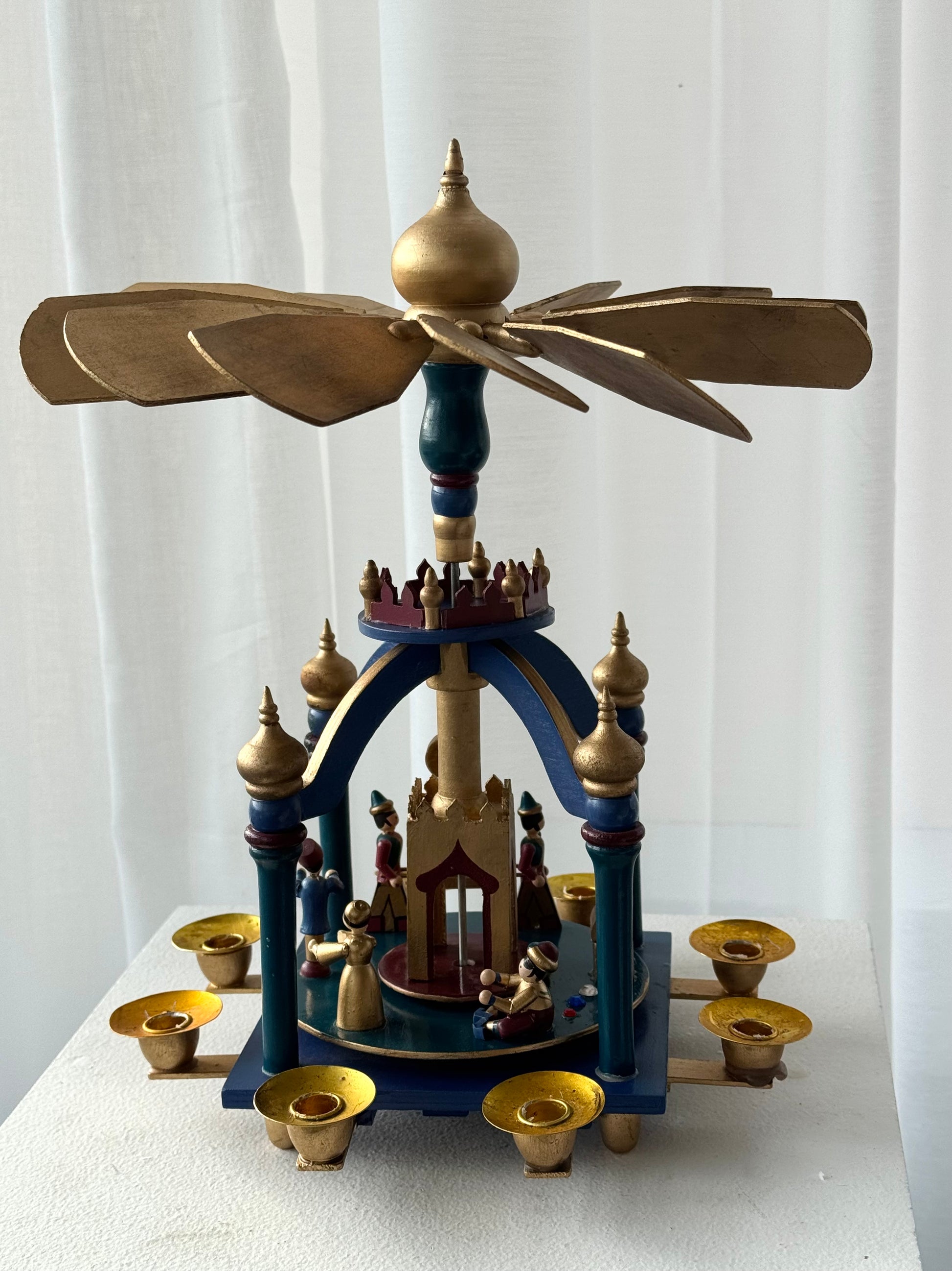 Very unique and old pyramid, handcrafted in Germany. This model is carved and painted to resemble a palace, in beautiful gold and bluish tones. Rotating small figures of an emperor and treasures.