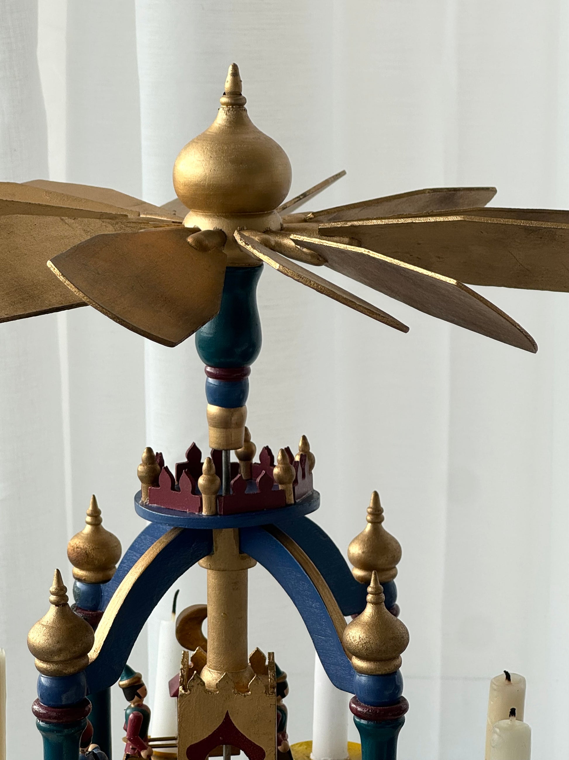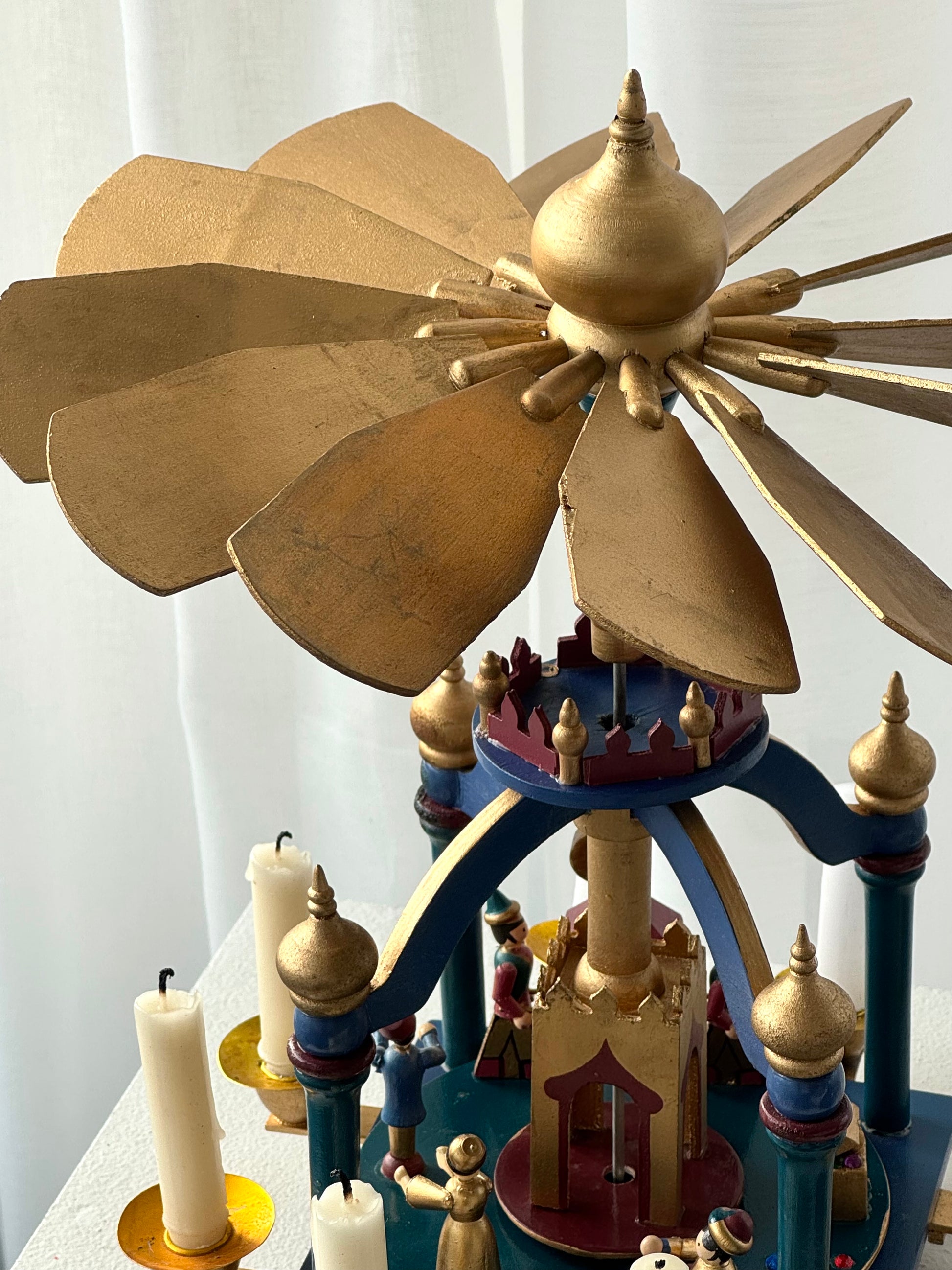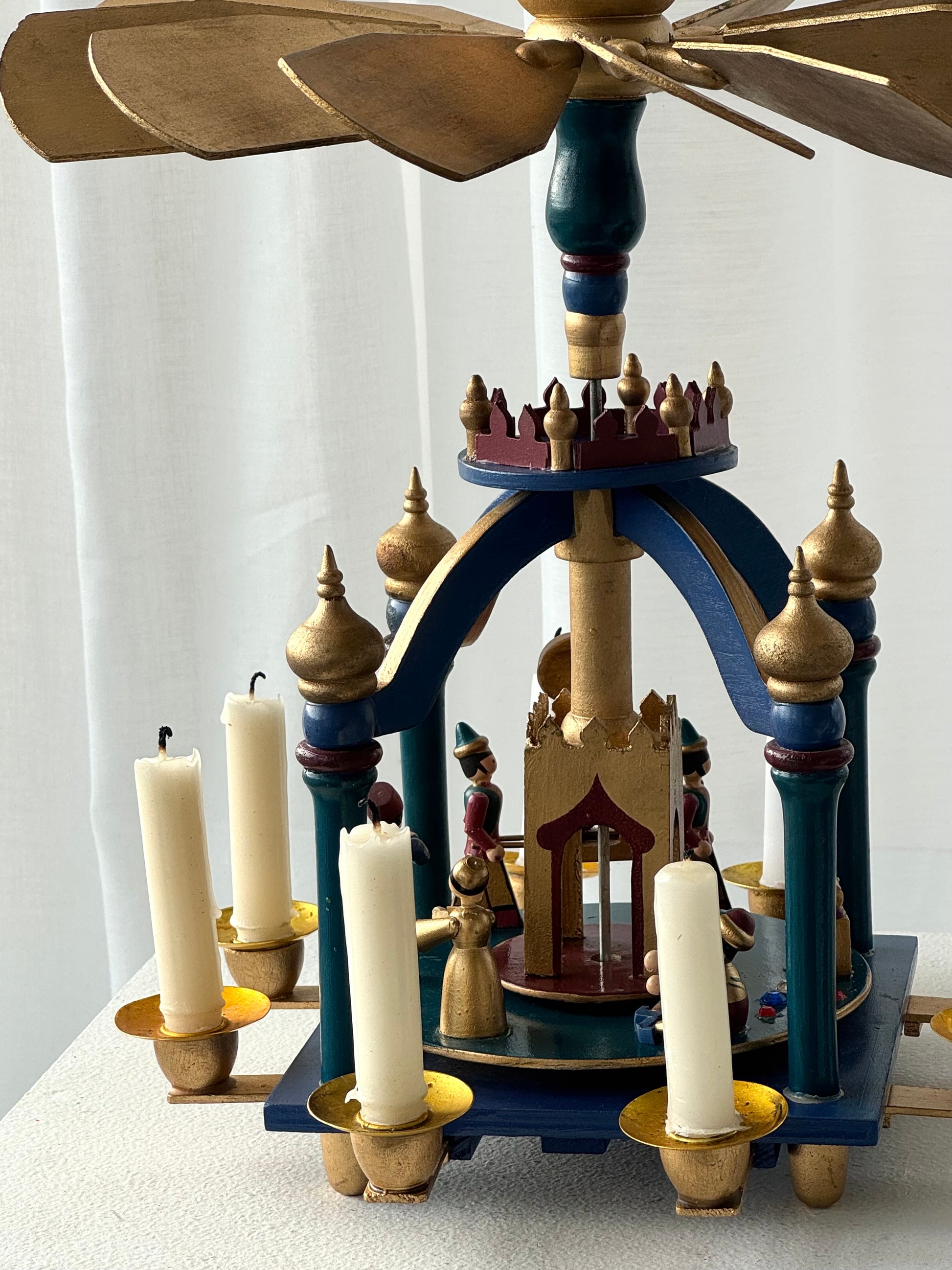 Please note: All pyramids are handmade and either vintage or antique. Minor imperfections, scratches, or signs of age may occur. No figures are missing, and the pyramid spins as it should. However, the wings or other parts may occasionally need a little adjustment to help it start turning. Should any issues arise, you are always welcome to contact me for assistance.
