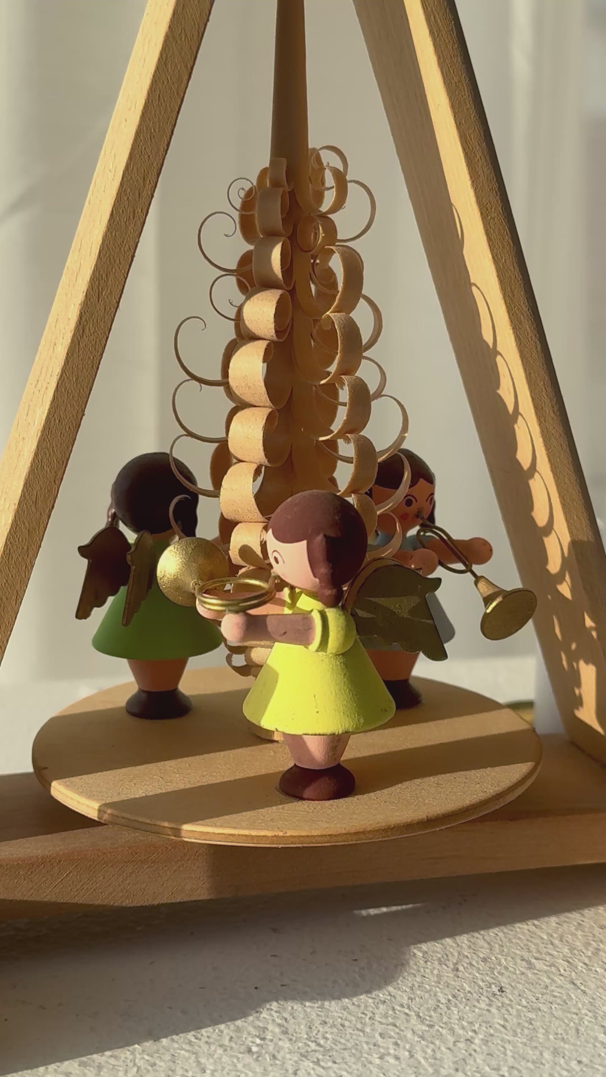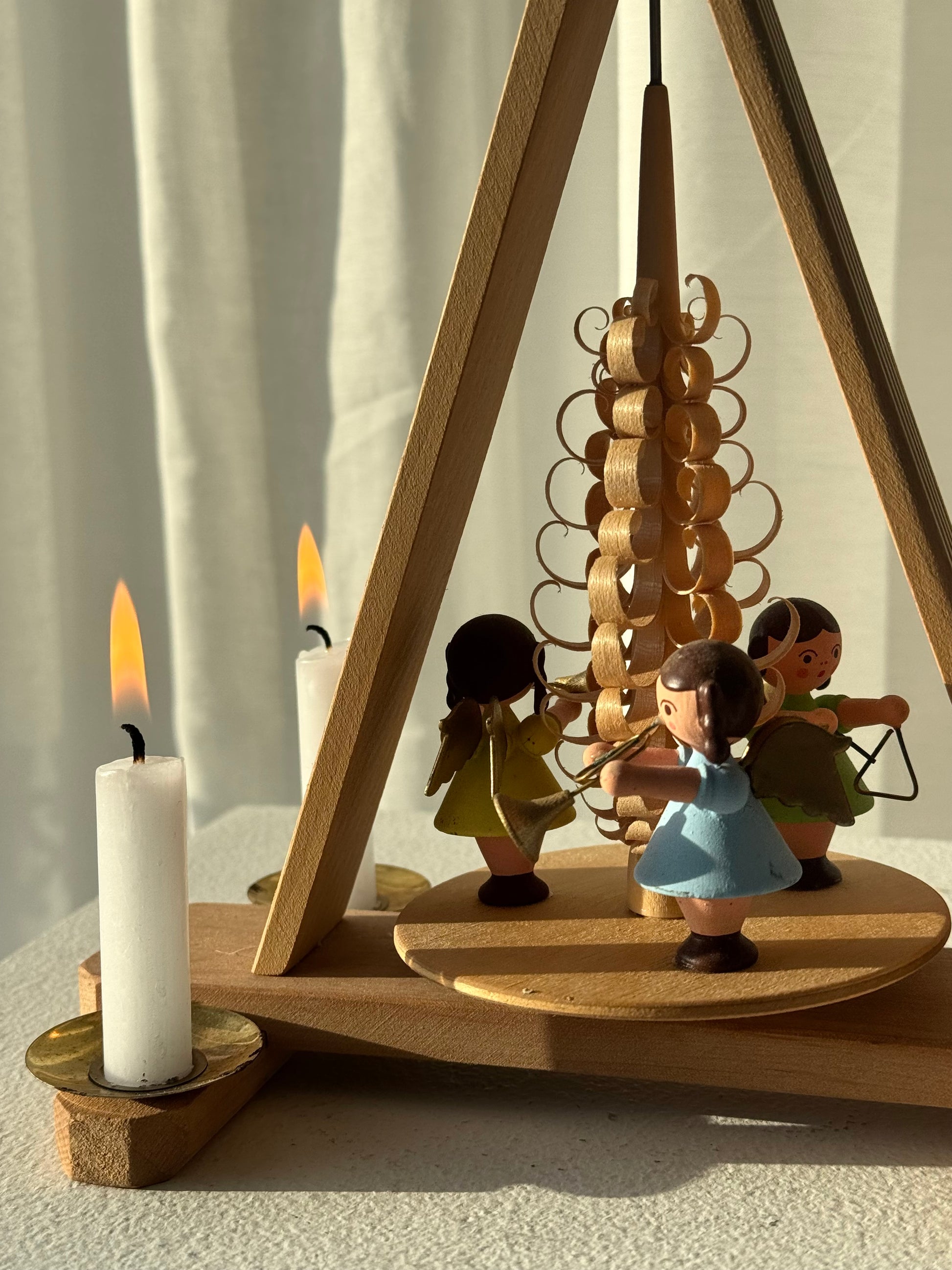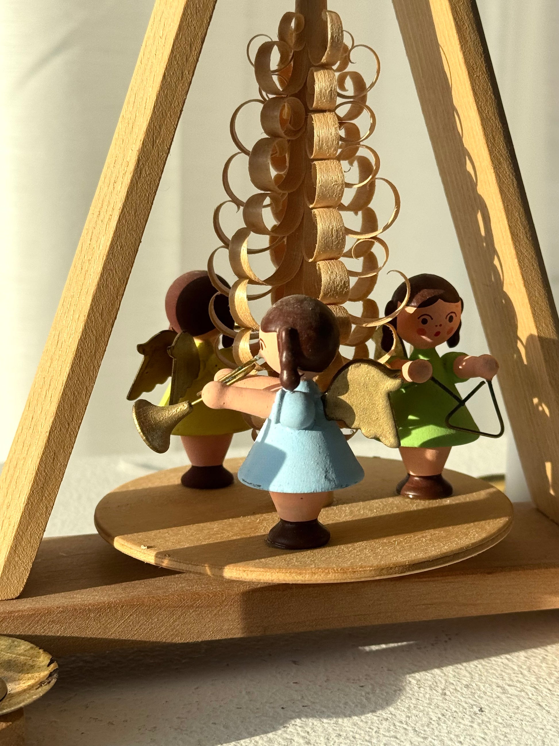 The loveliest pyramid in a triangular shape. For 4 taper candles. Three dancing angels with instruments, each in a different color. In very good condition.
