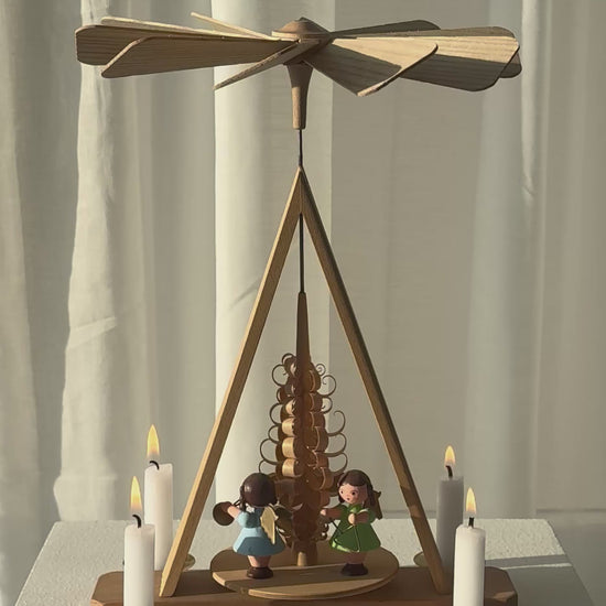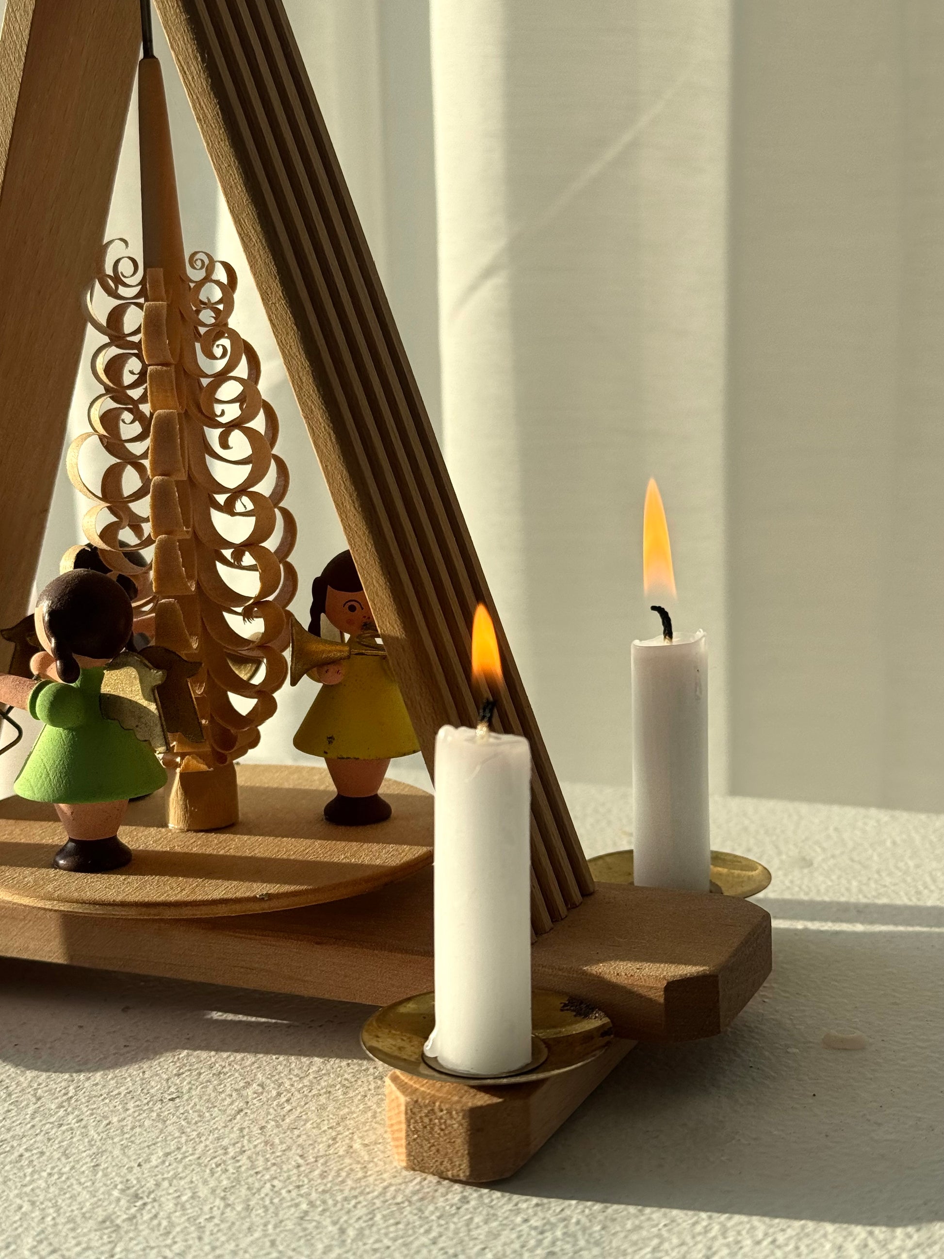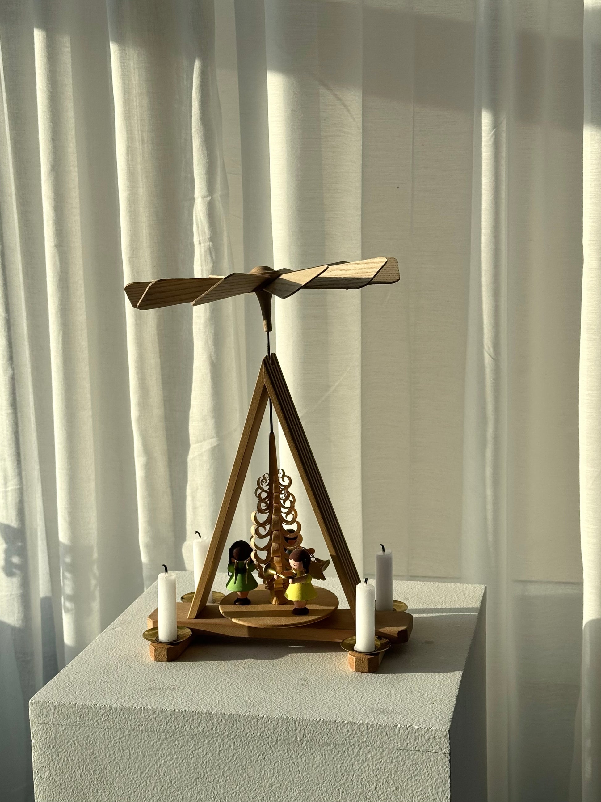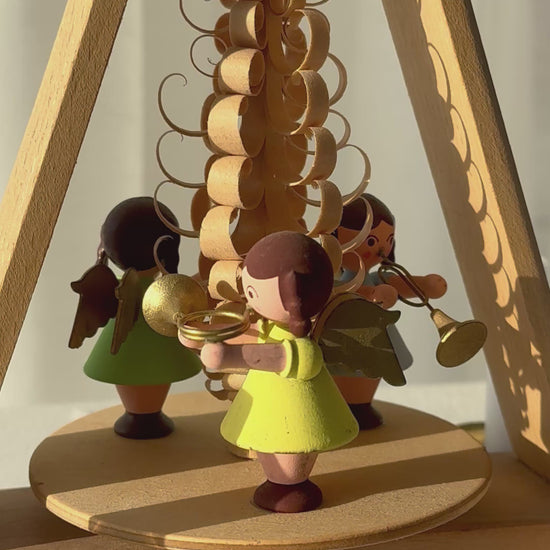 The loveliest pyramid in a triangular shape. For 4 taper candles. Three dancing angels with instruments, each in a different color. In very good condition.