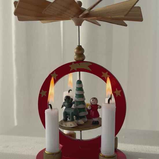 Cutest Small pyramid, handmade in germany. Painted red with a snow covered Christmas three in the middle.