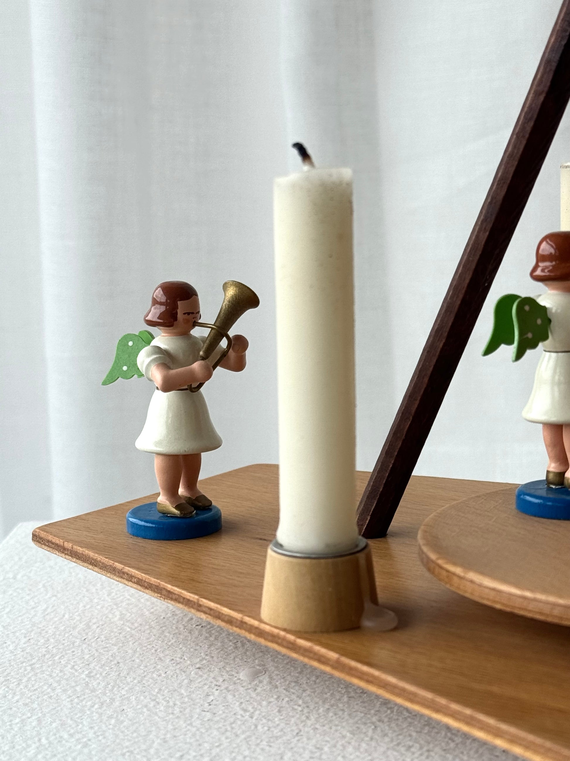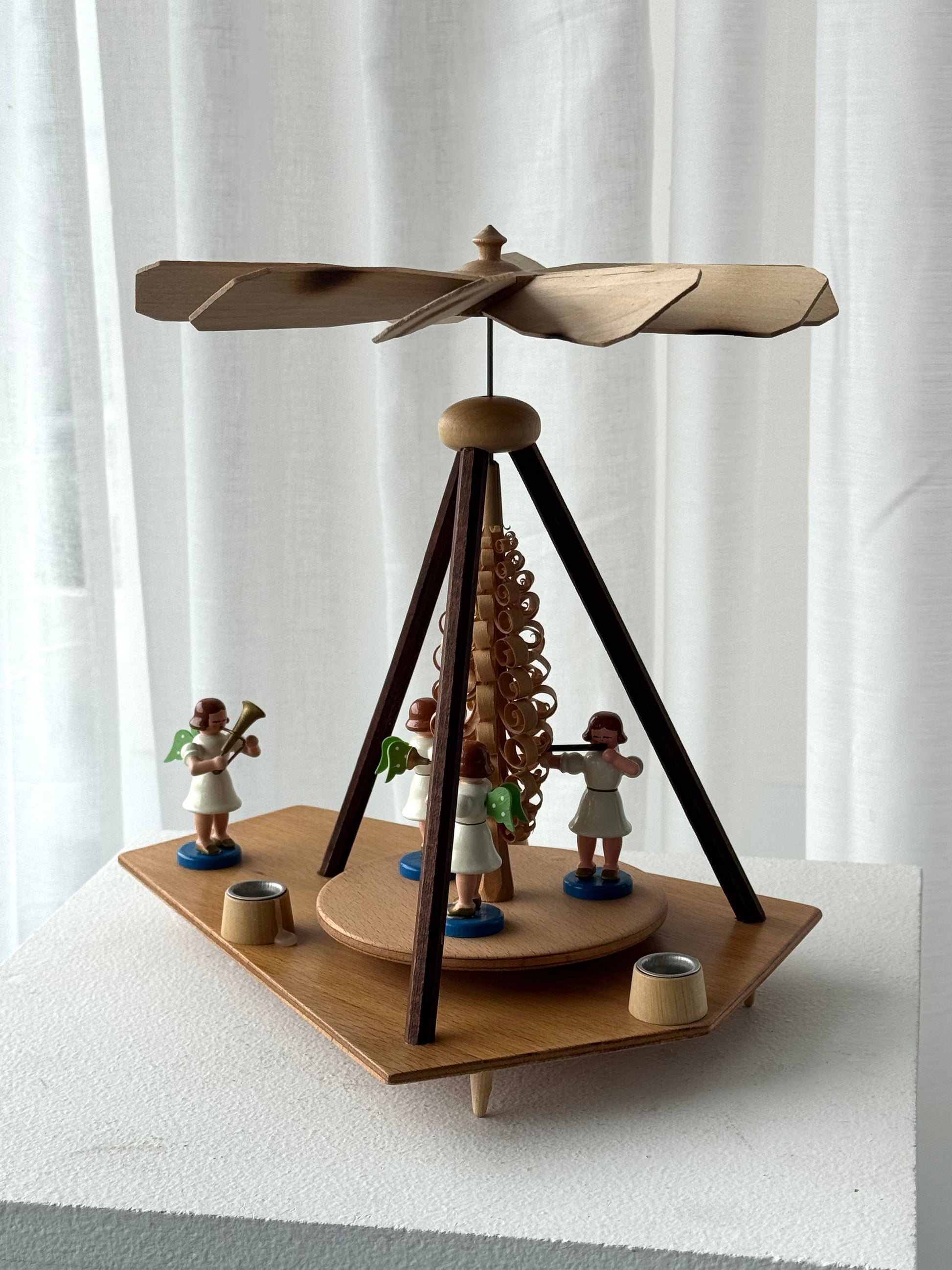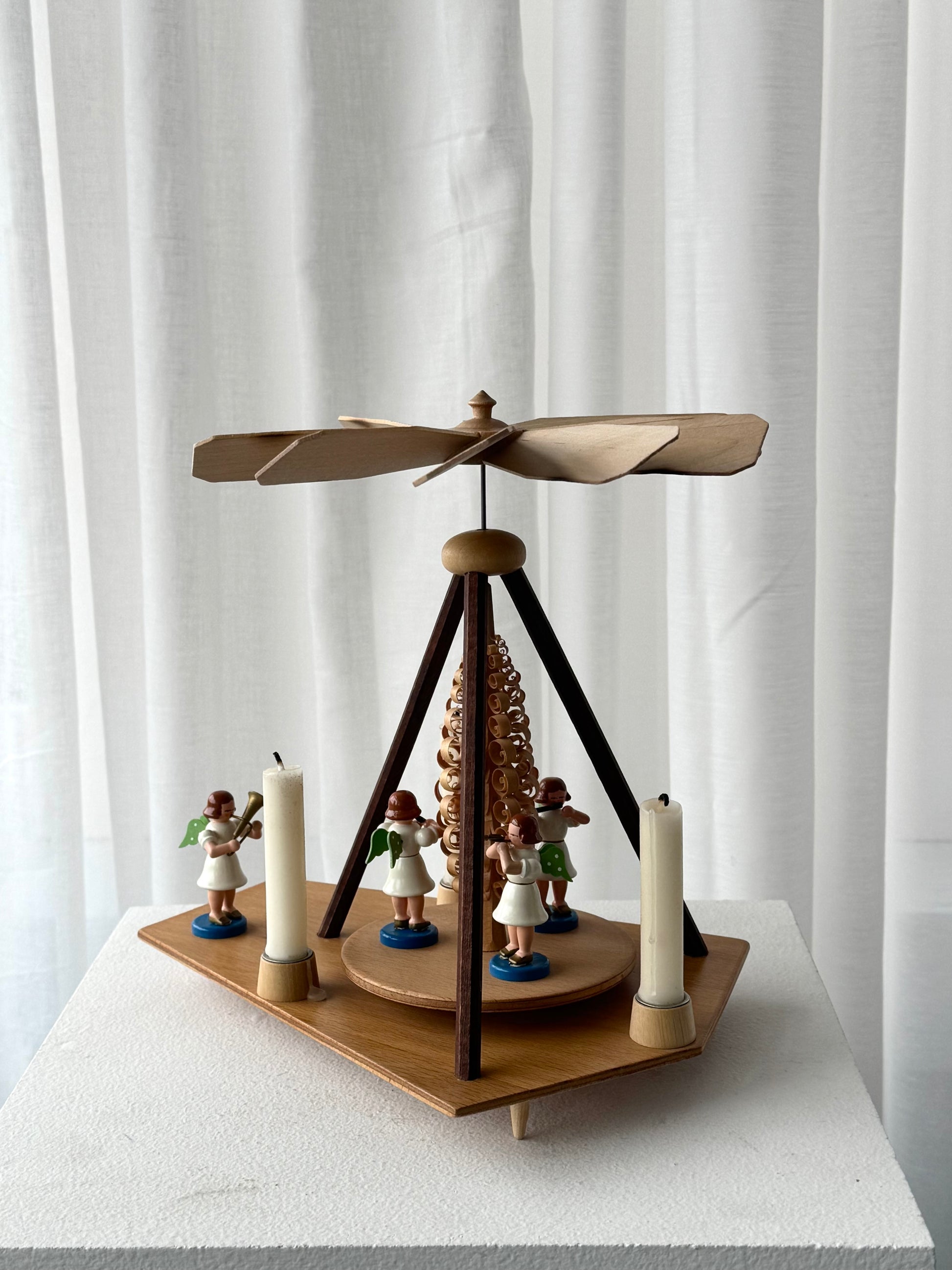 The most beautiful vintage DDR pyramid, handmade in Germany in 1970. The pyramid features 4 angels, 3 of which rotate with the propeller when the candles are lit.