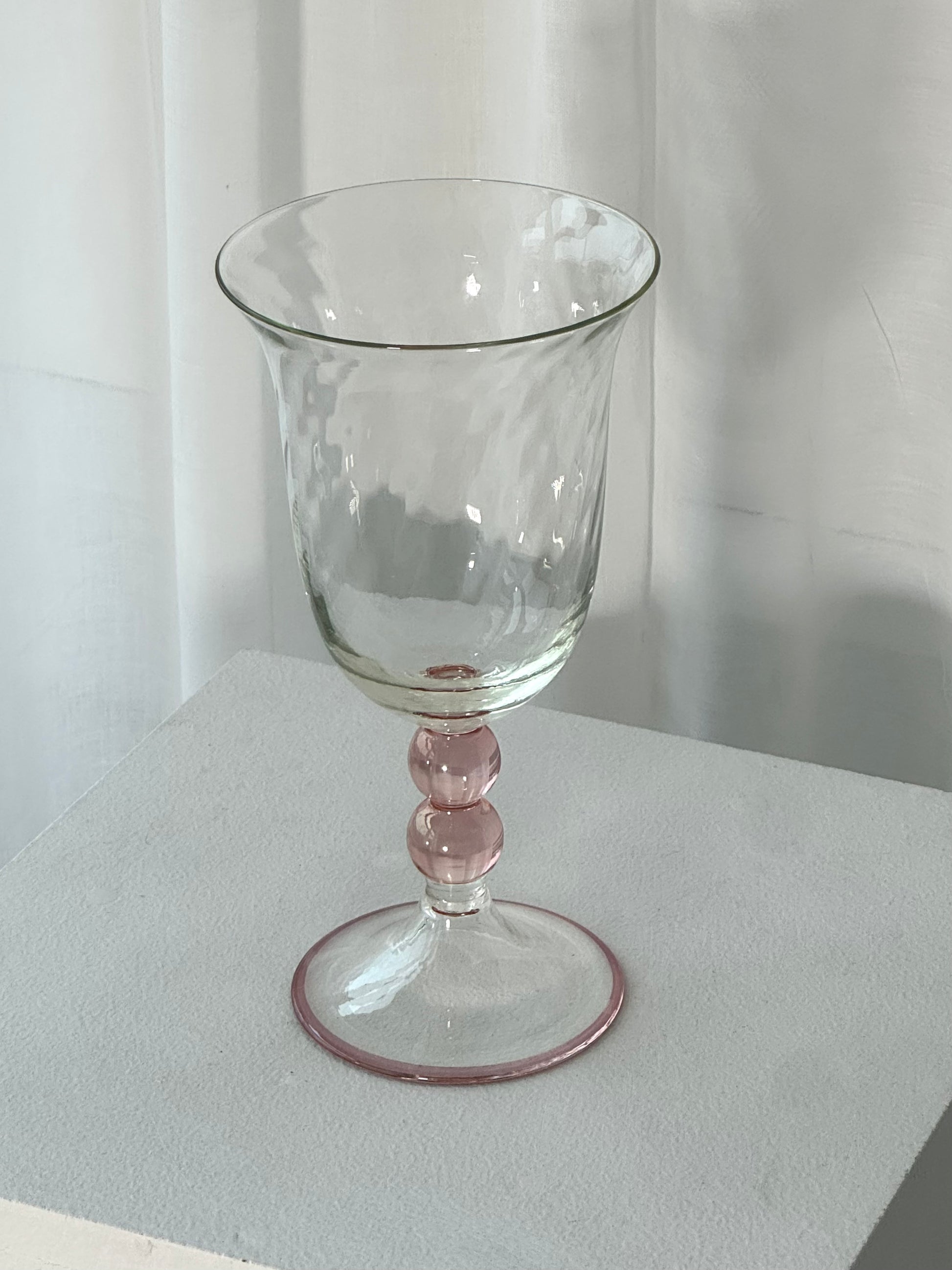 The loveliest handmade glass vase. The base has a pink detail and a spherical pink stem. The vase itself has a slight swirl. In very nice condition.