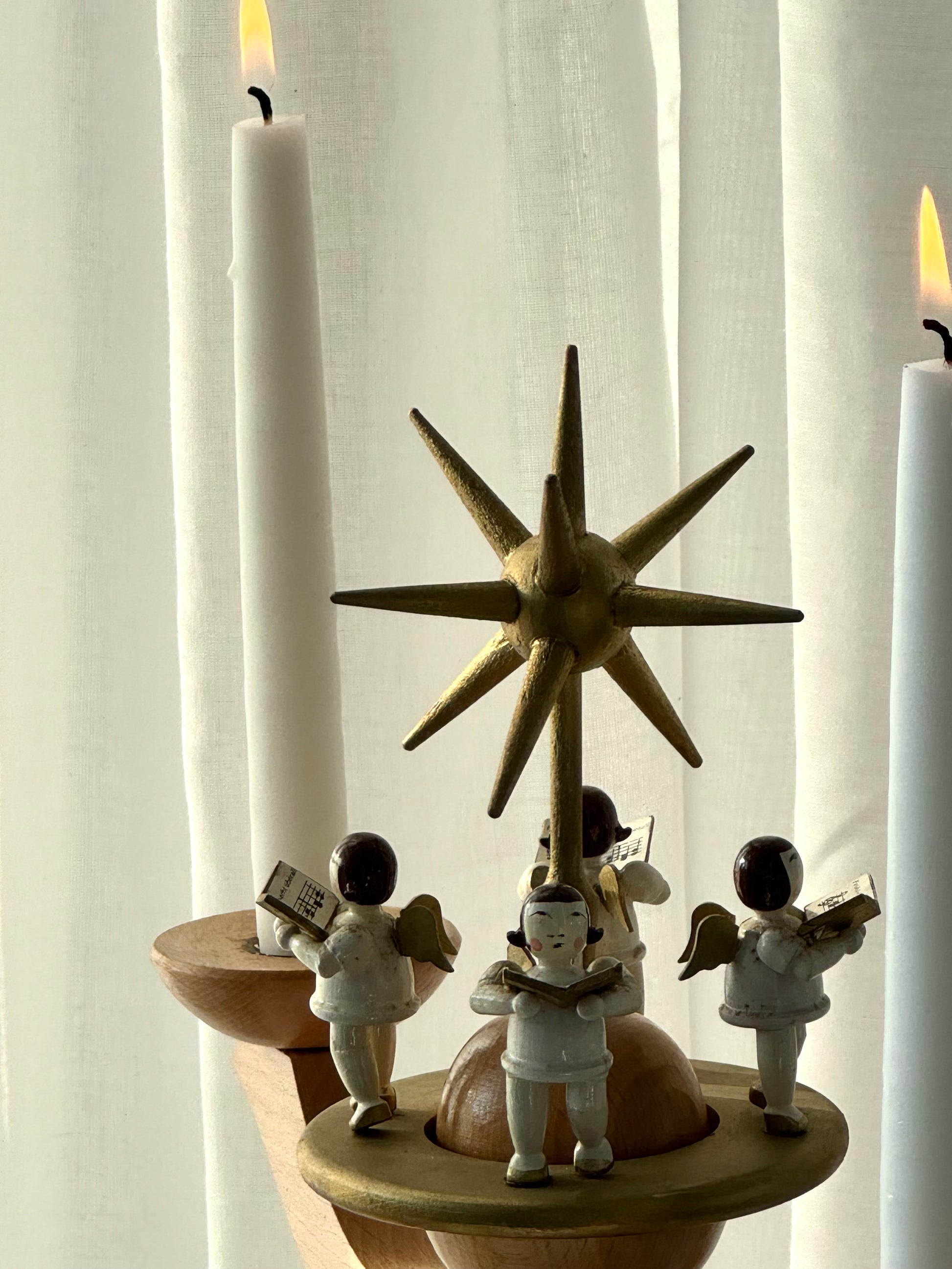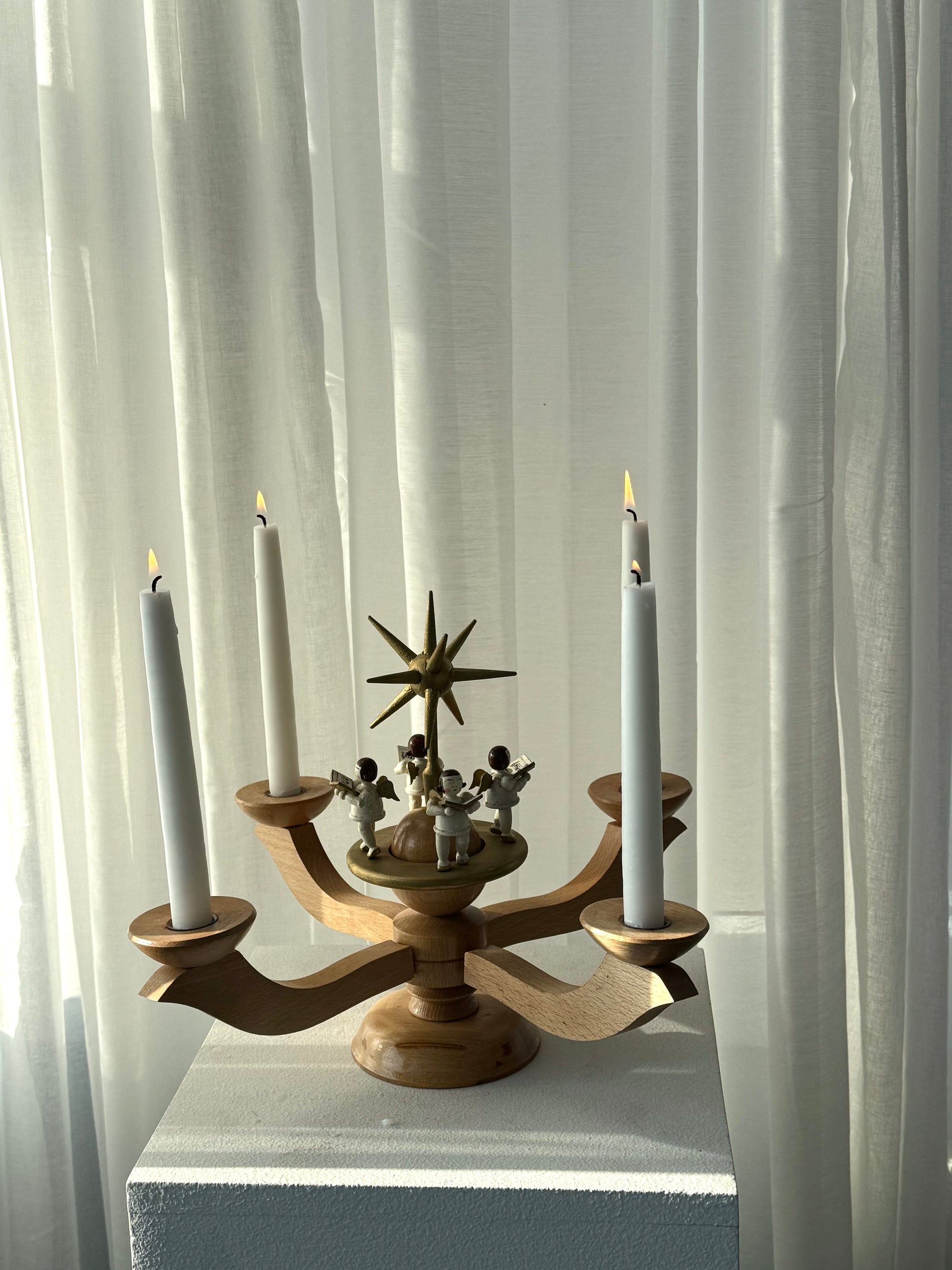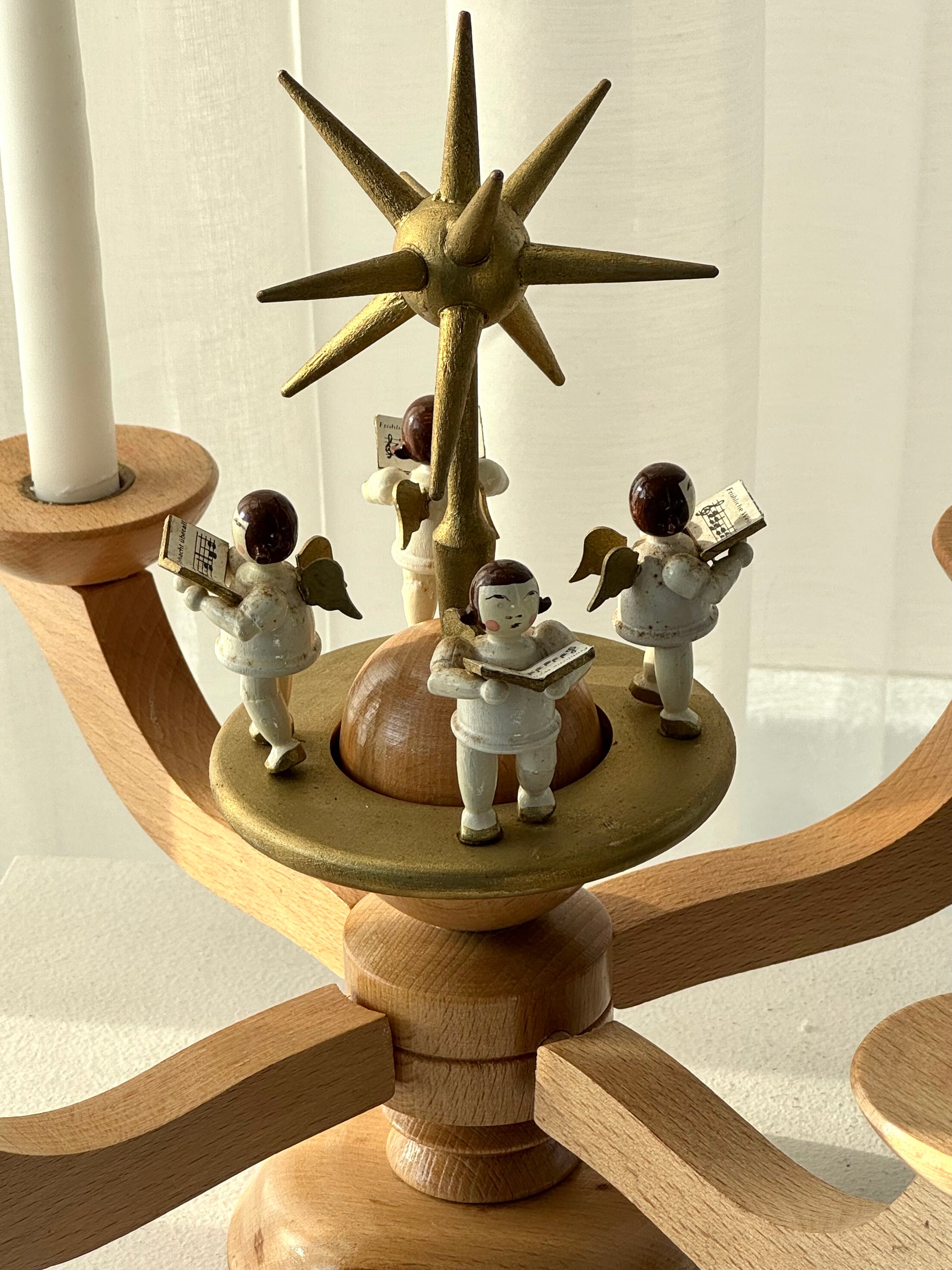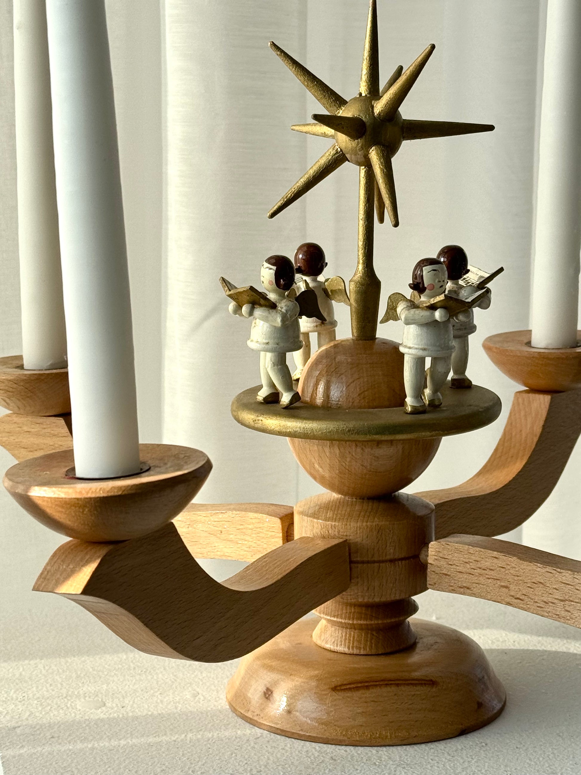Incredibly beautiful DDR / 1970s Advent display. Handmade in Germany. The display features four arms for regular candles, with small angels sitting in the center holding instruments and a star on top.