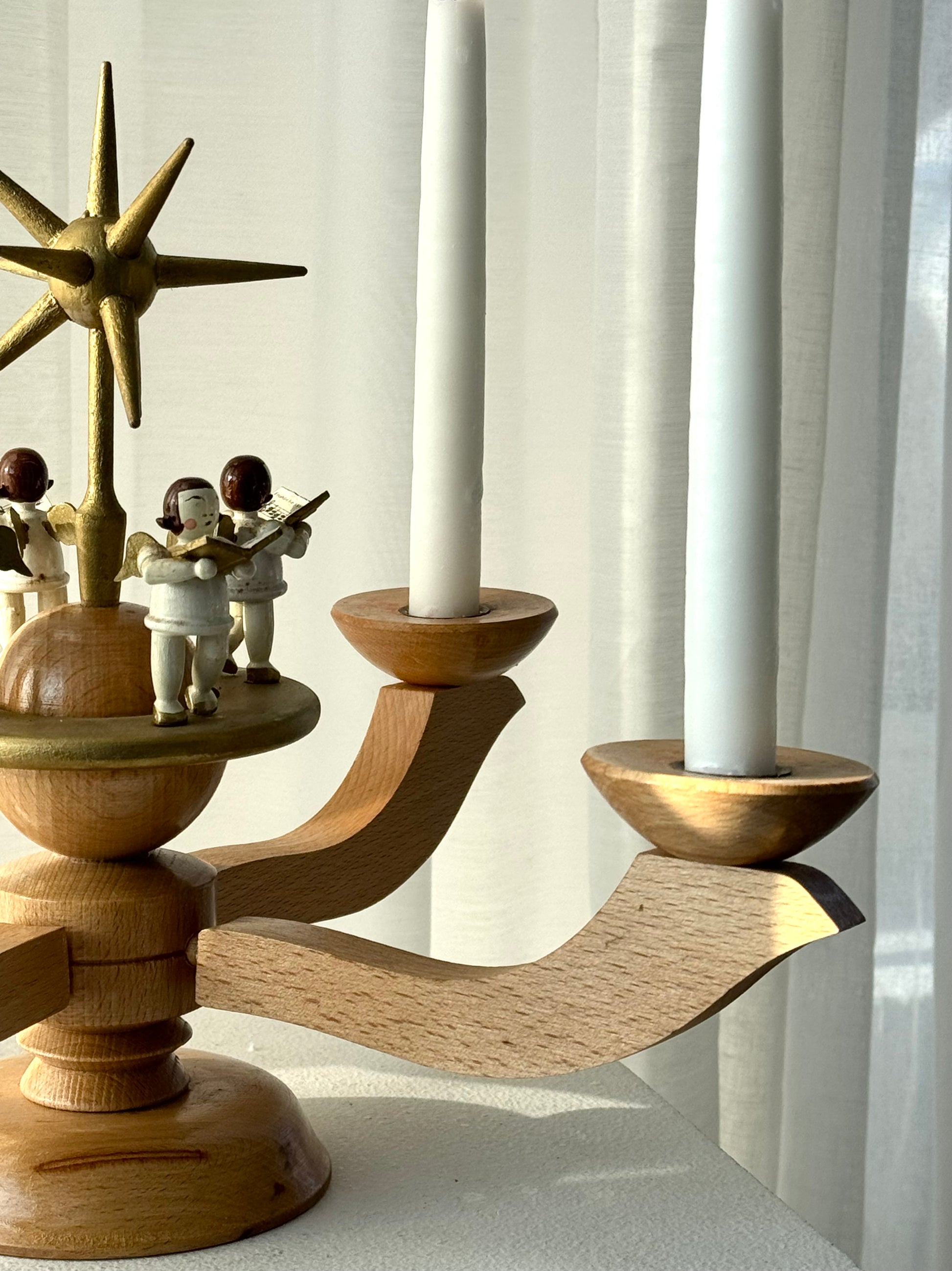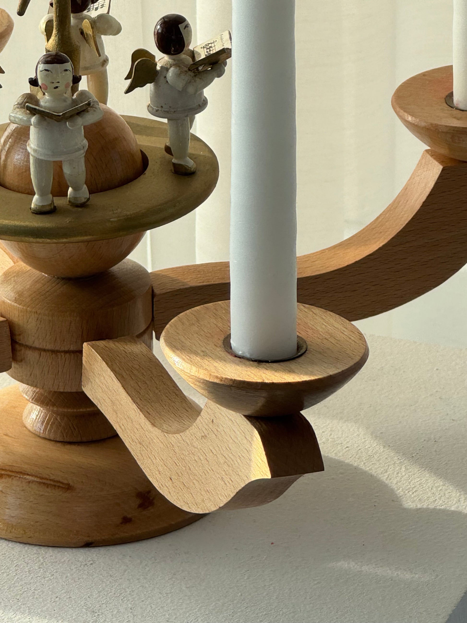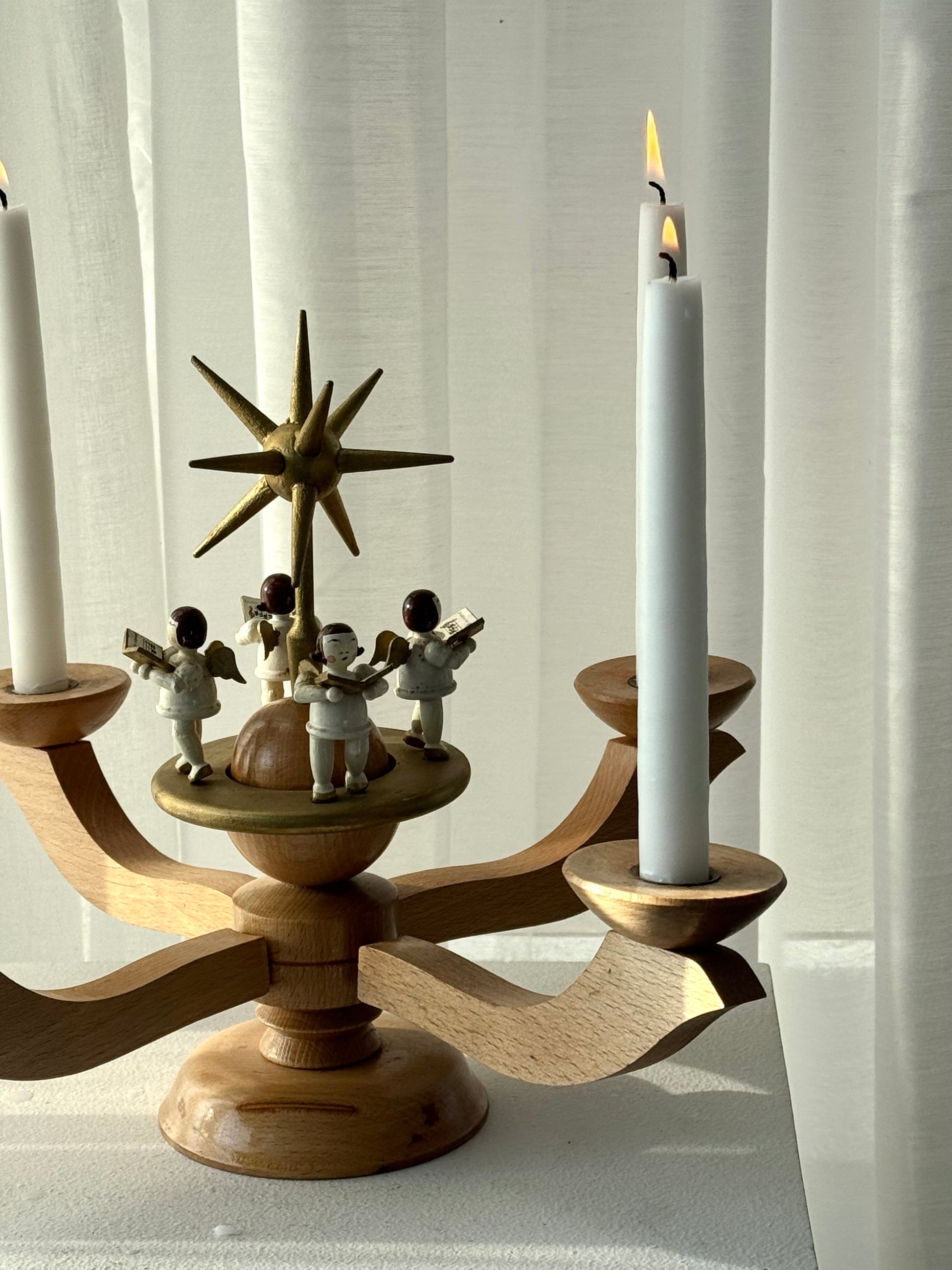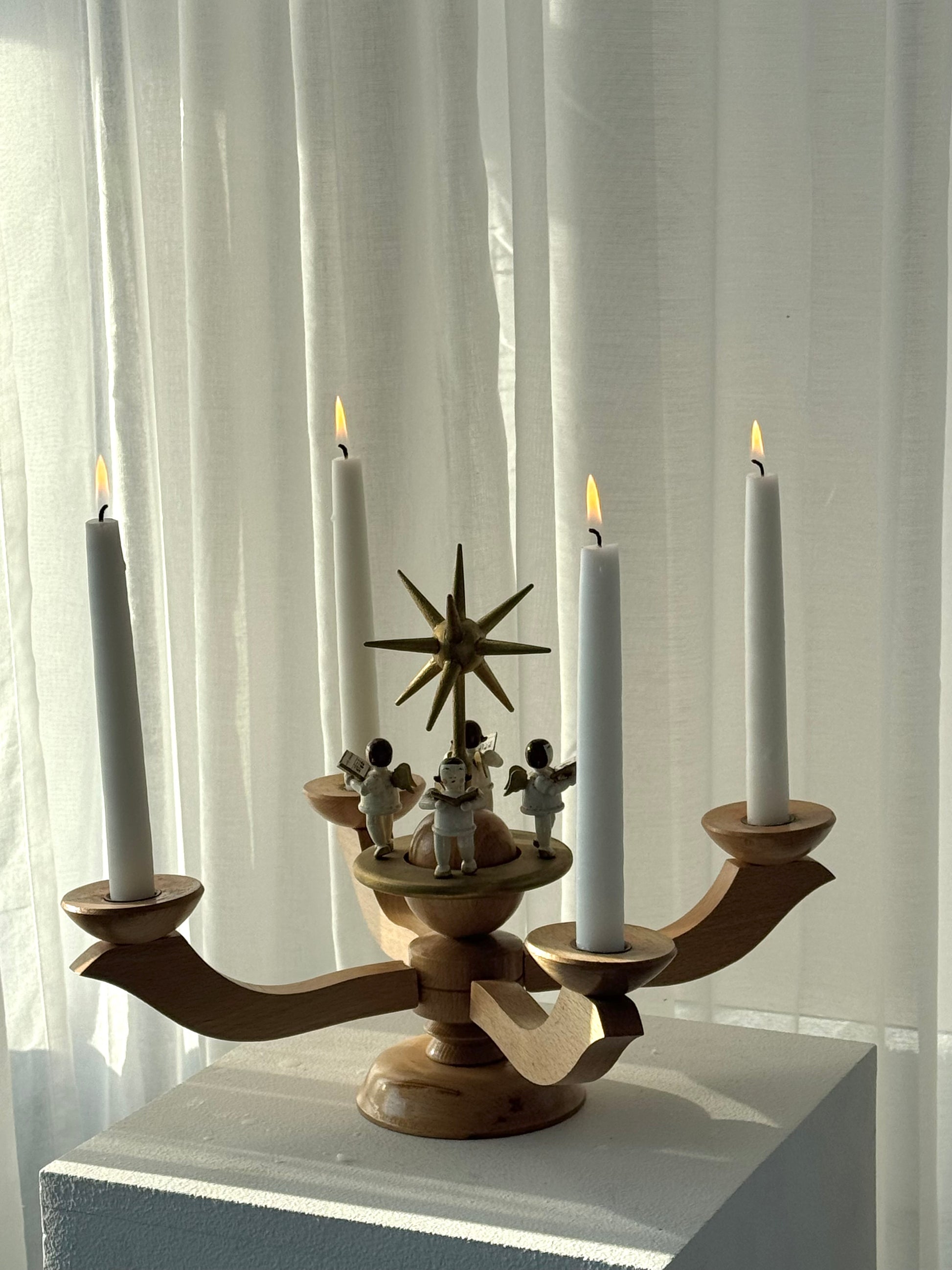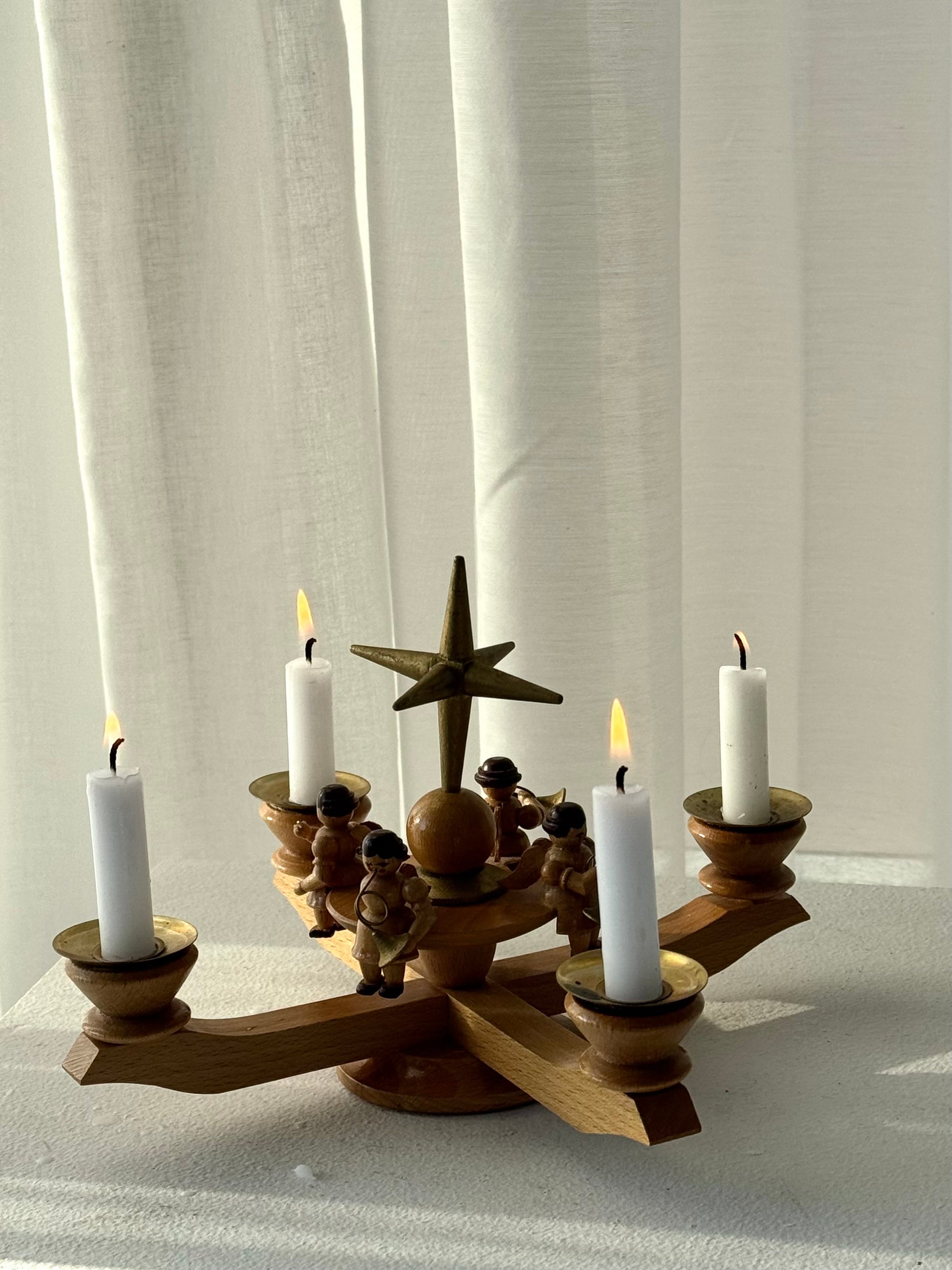 Incredibly beautiful DDR / 1970s Advent display. Handmade in Germany. The display features four arms for regular candles, with small angels sitting in the center holding instruments and a star on top.