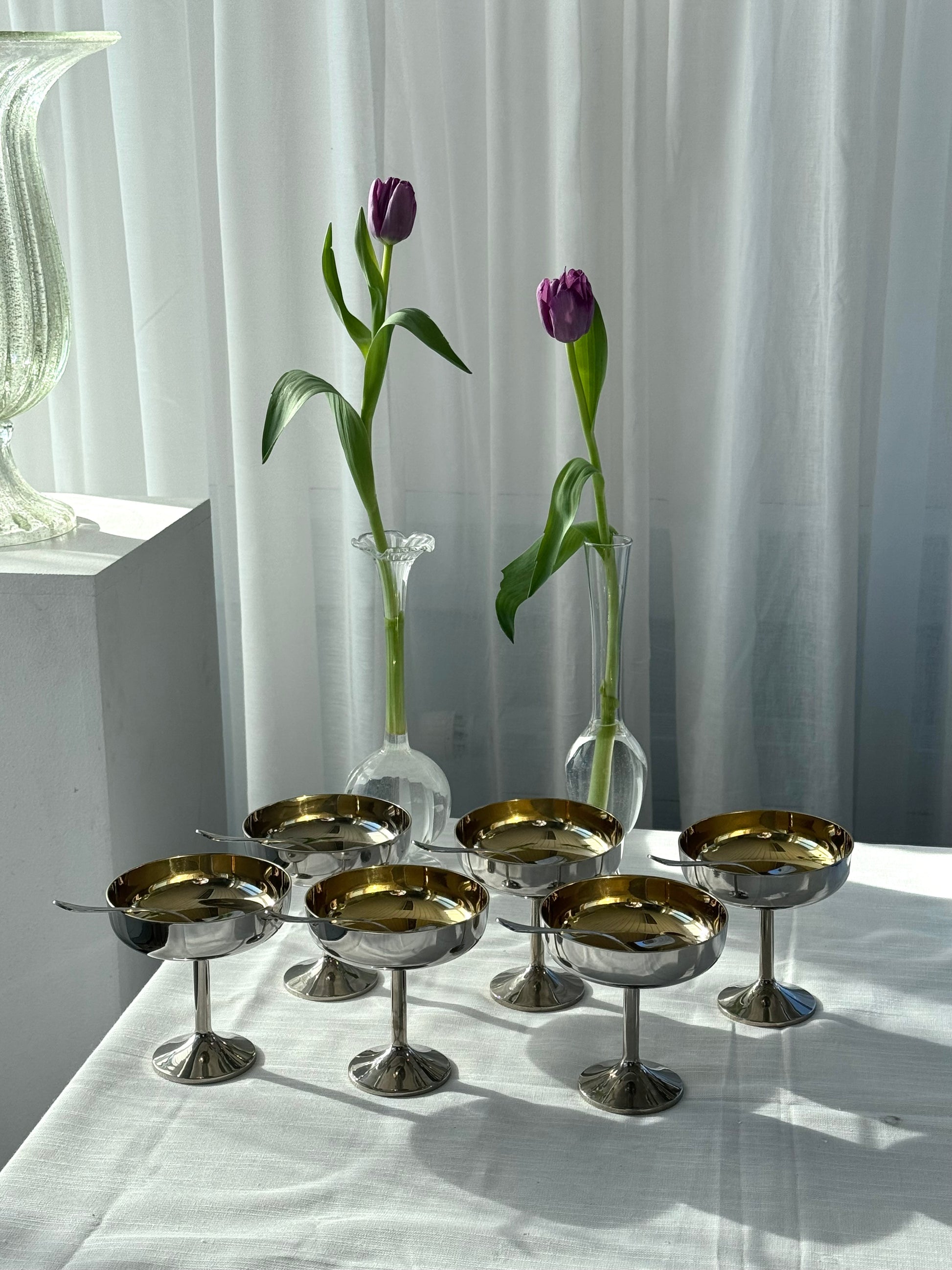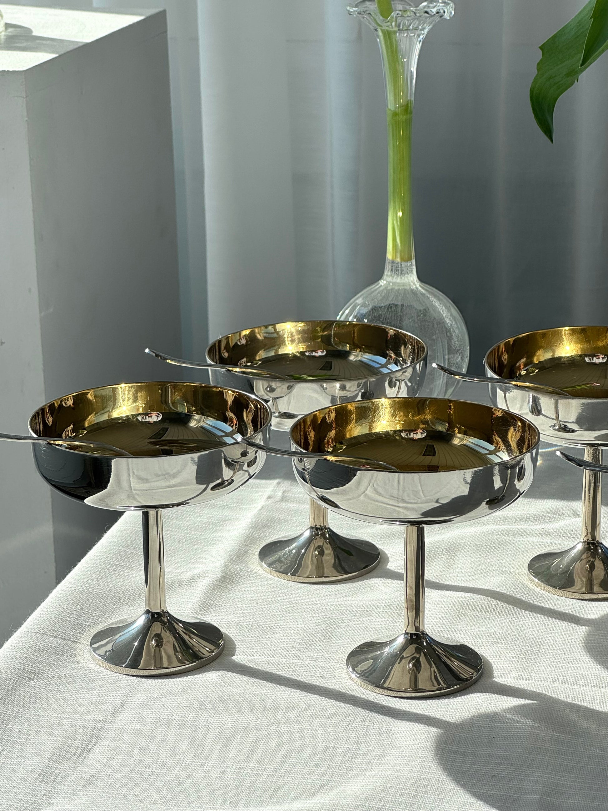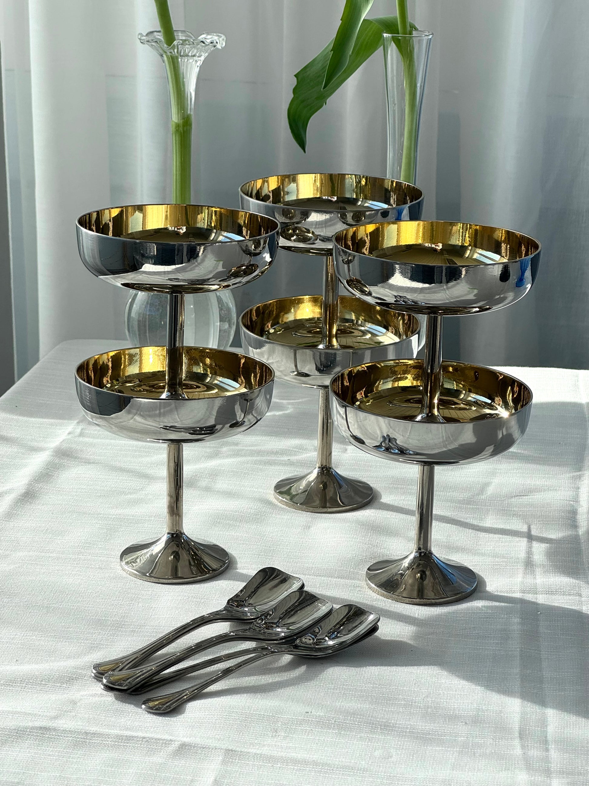 Beautiful vintage Italian Inox coupes with a gold-tone detail in the bowl. Wide bowl set on a slender stem. Some of the gold has worn off in a few of the bowls, but they remain in very nice condition. Comes with a matching spoon. Price is per piece.