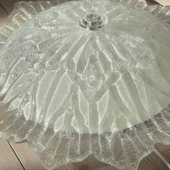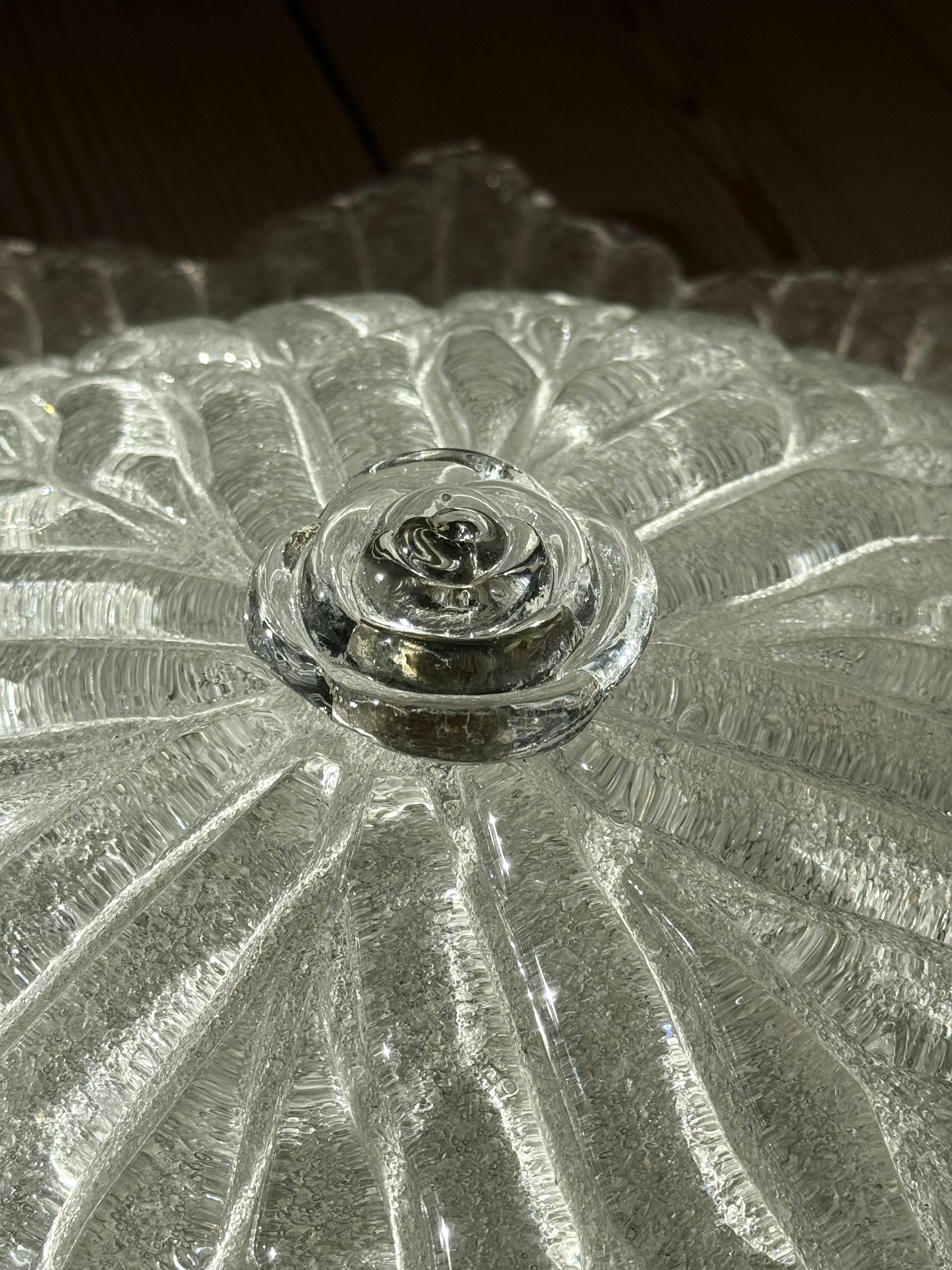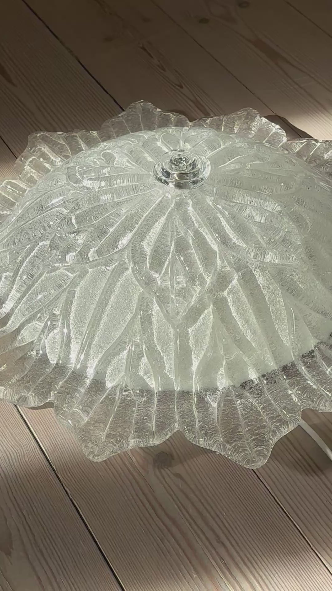 Exquisite vintage Murano lamp – a true statement piece. Handcrafted with exceptional attention to detail, featuring a delicate rose-shaped knob at the center. As a handmade piece, it carries natural glass variations, with only a tiny nick on one curl tip – otherwise in excellent condition. Its timeless design makes it a stunning eye-catcher, perfect for use as either a ceiling or wall lamp. Comes complete with a white steel base and E27 socket.