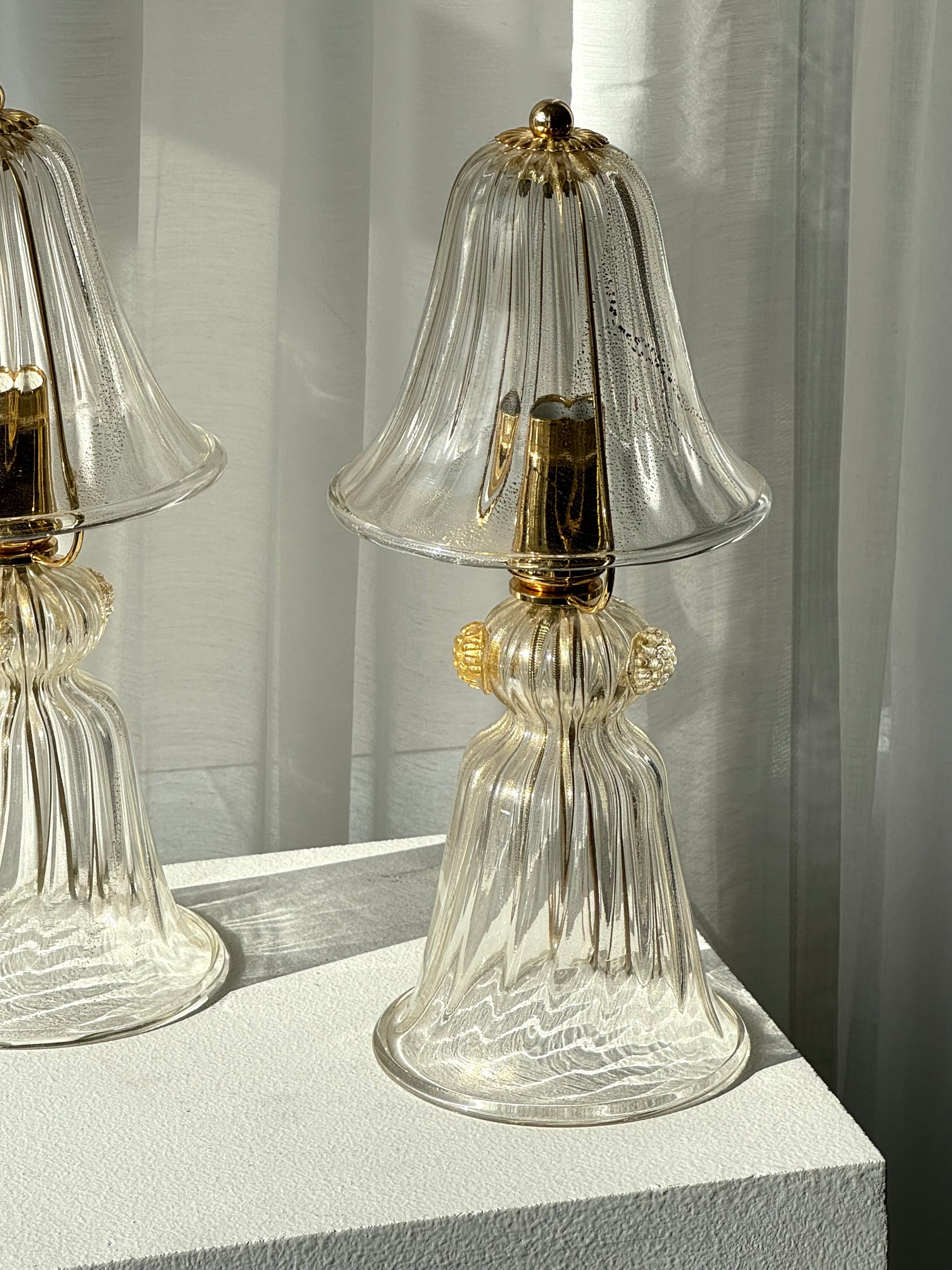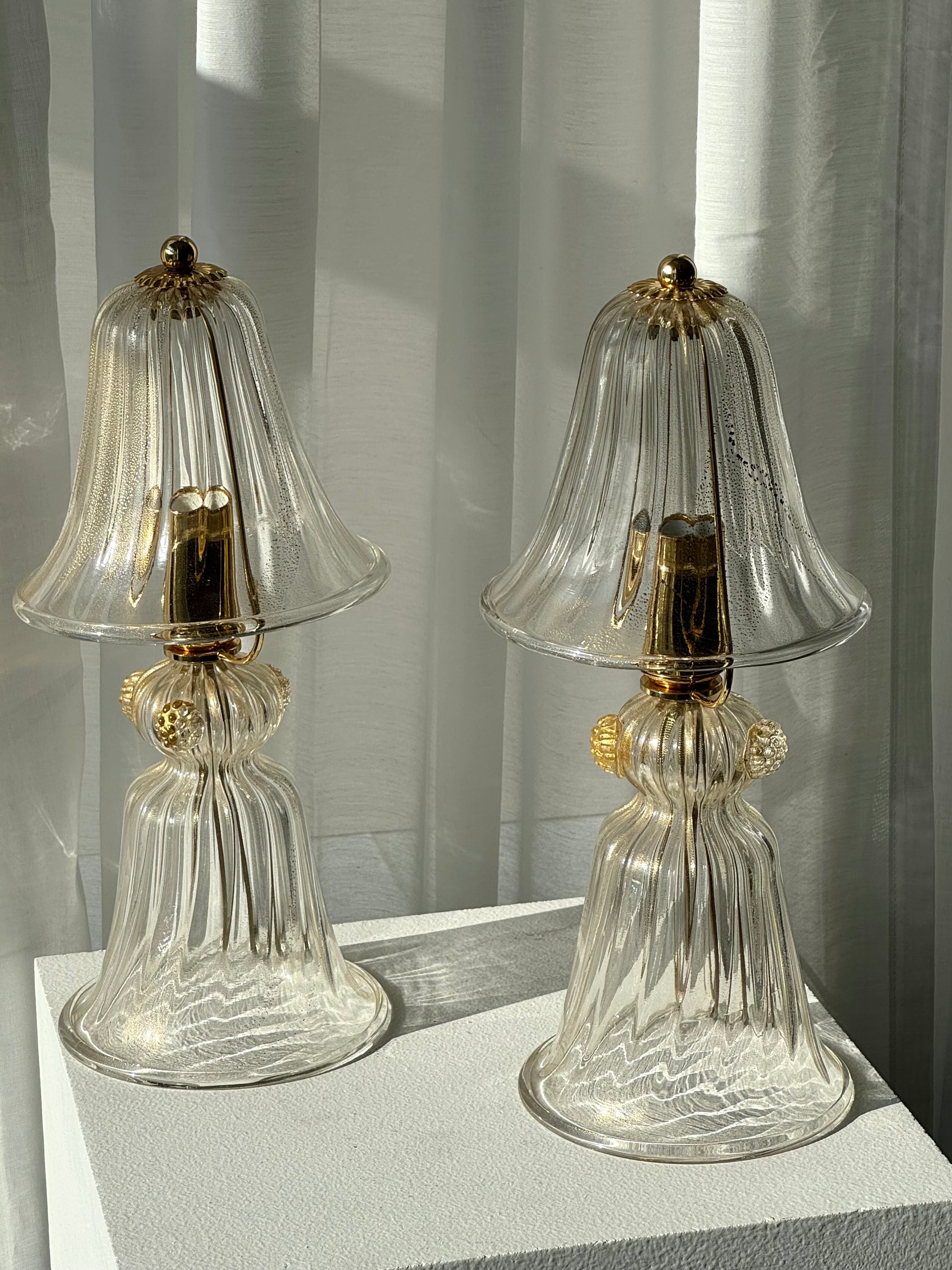 Beautiful pair of vintage table lamps in Murano blow glass with brass details. Stunning Golden glass and swirling details. Made in Italy in the 1930/40s.